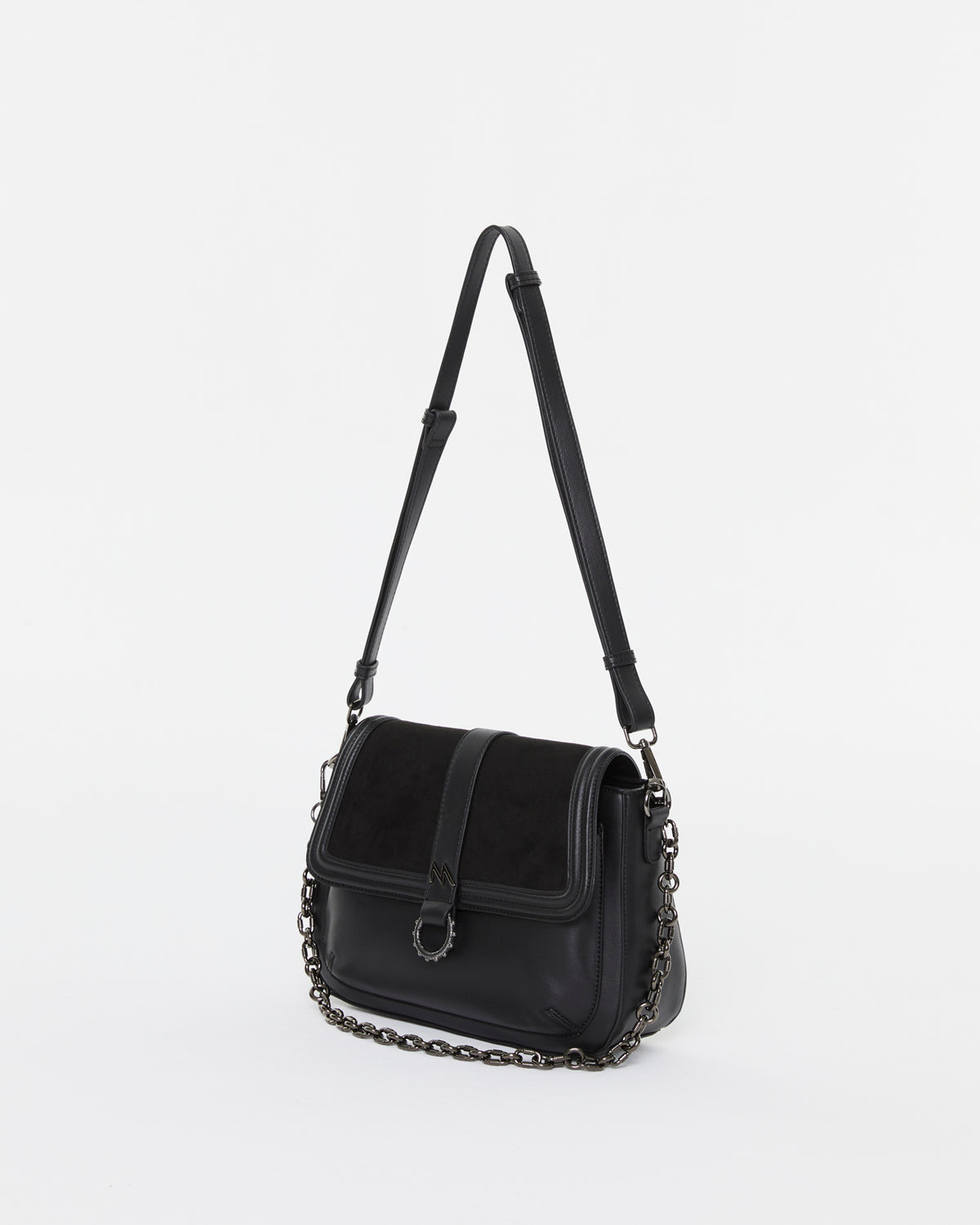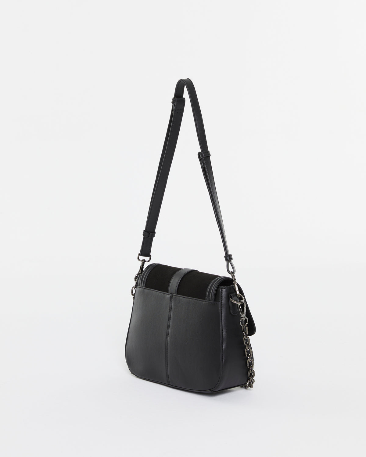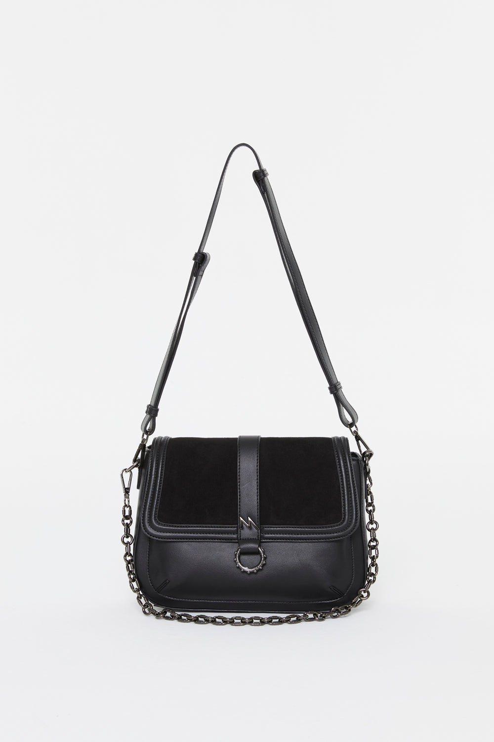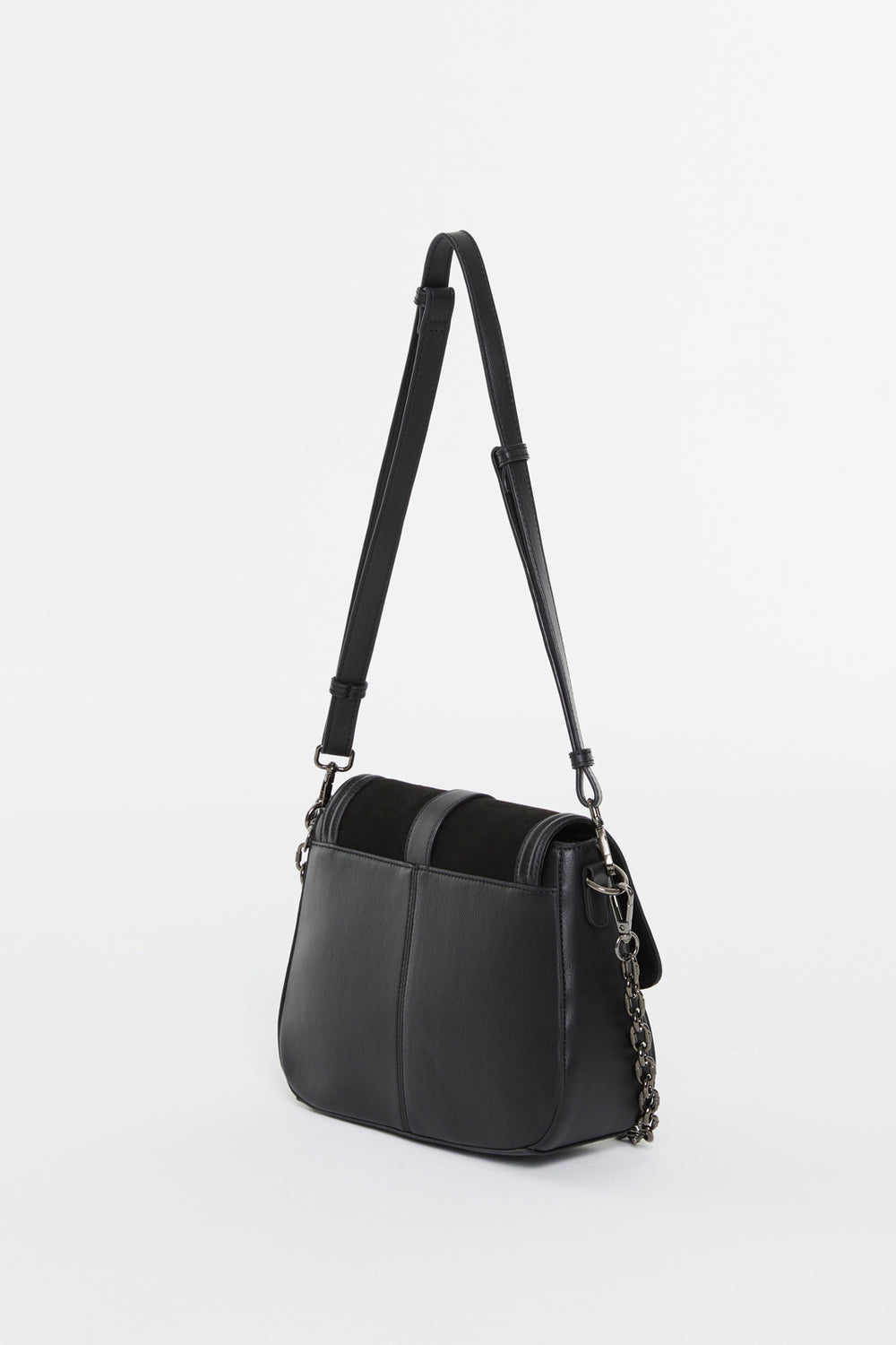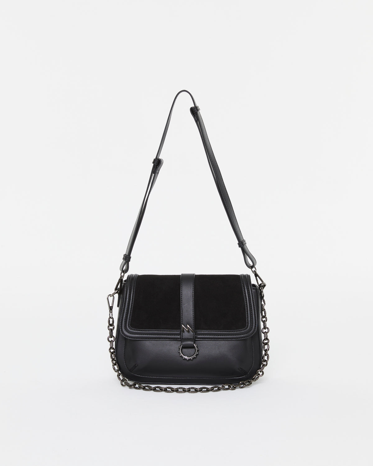 Kleine Umhängetasche in Leder- und Wildlederoptik. Reißverschluss und Magnetknopfverschluss mit edlem Ringdetail. Ein abnehmbarer, verstellbarer Riemen und eine abnehmbare Kette verleihen ihr einen markanten und praktischen Stil. Innentaschen mit Reißverschluss.