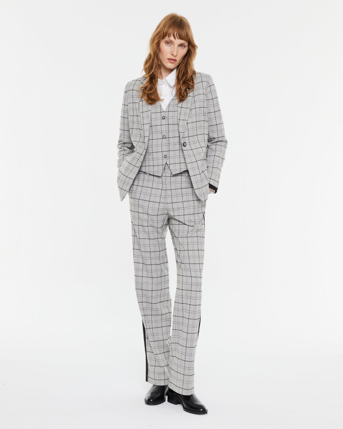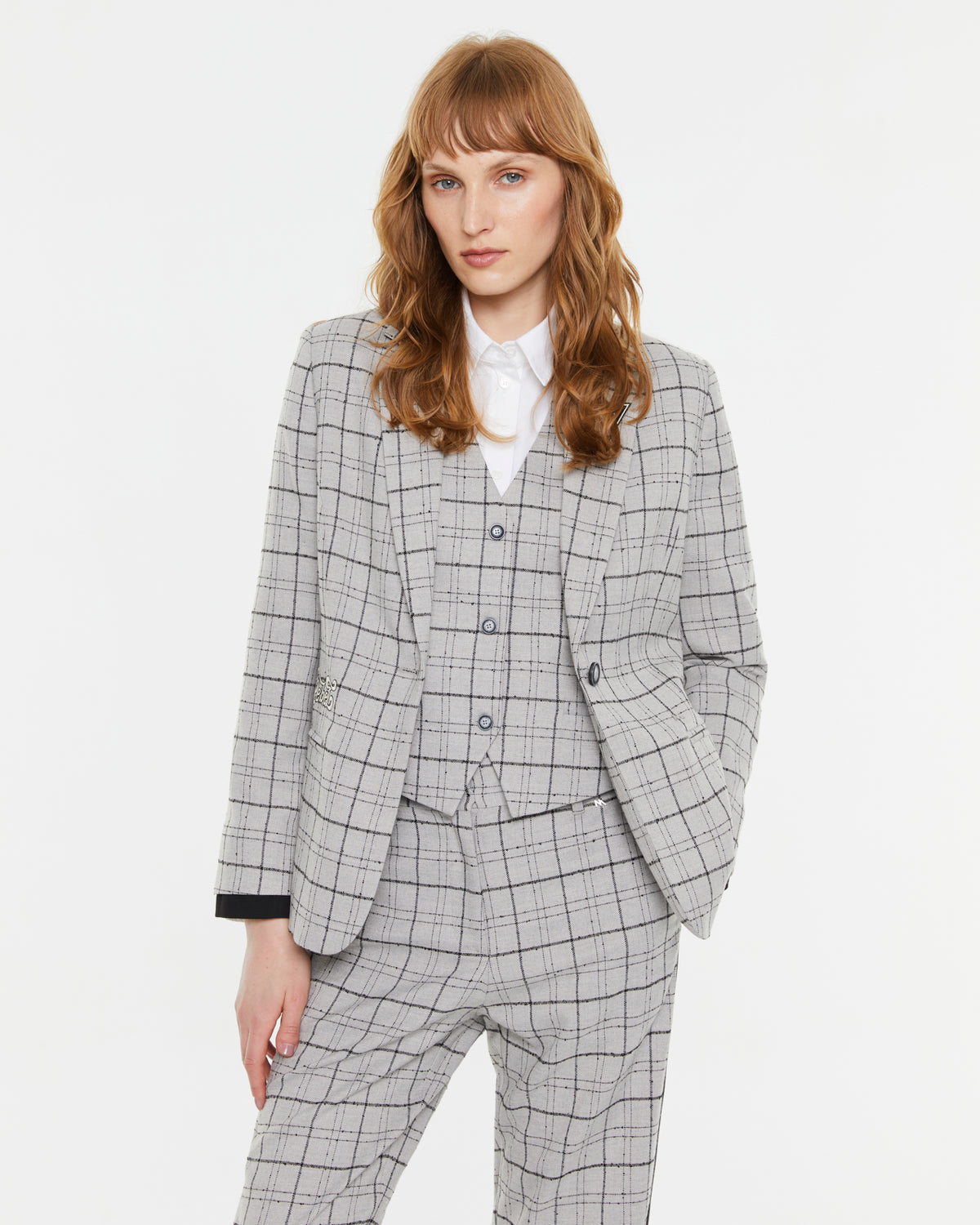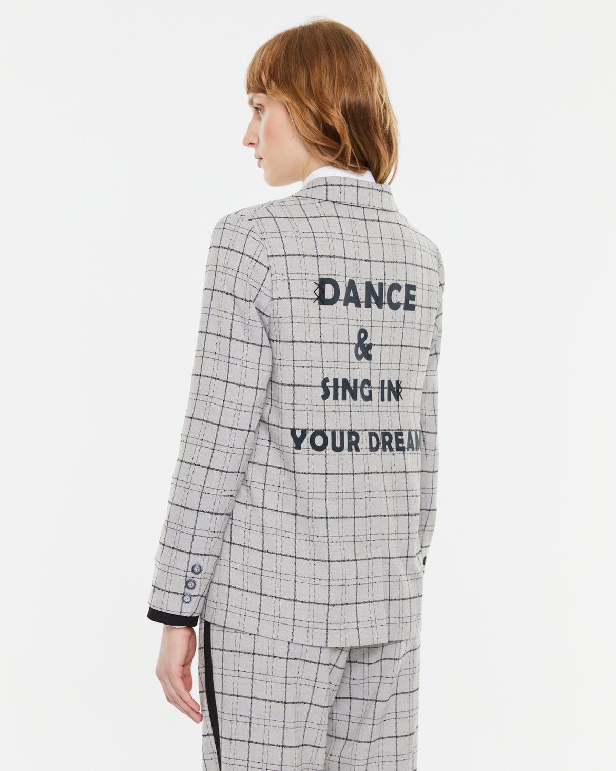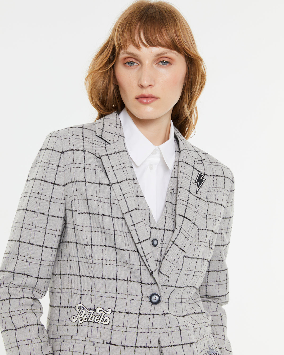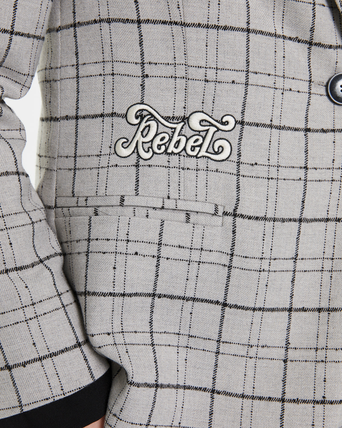 Langärmliger karierter Blazer mit Reverskragen. Ein-Knopf-Verschluss vorne. Kontrastierende Rippbündchen und gestickte Patches vorne. Aufgedruckter Spruch auf der Rückseite. Ein einzigartiges Kleidungsstück, mit dem Sie auffallen.