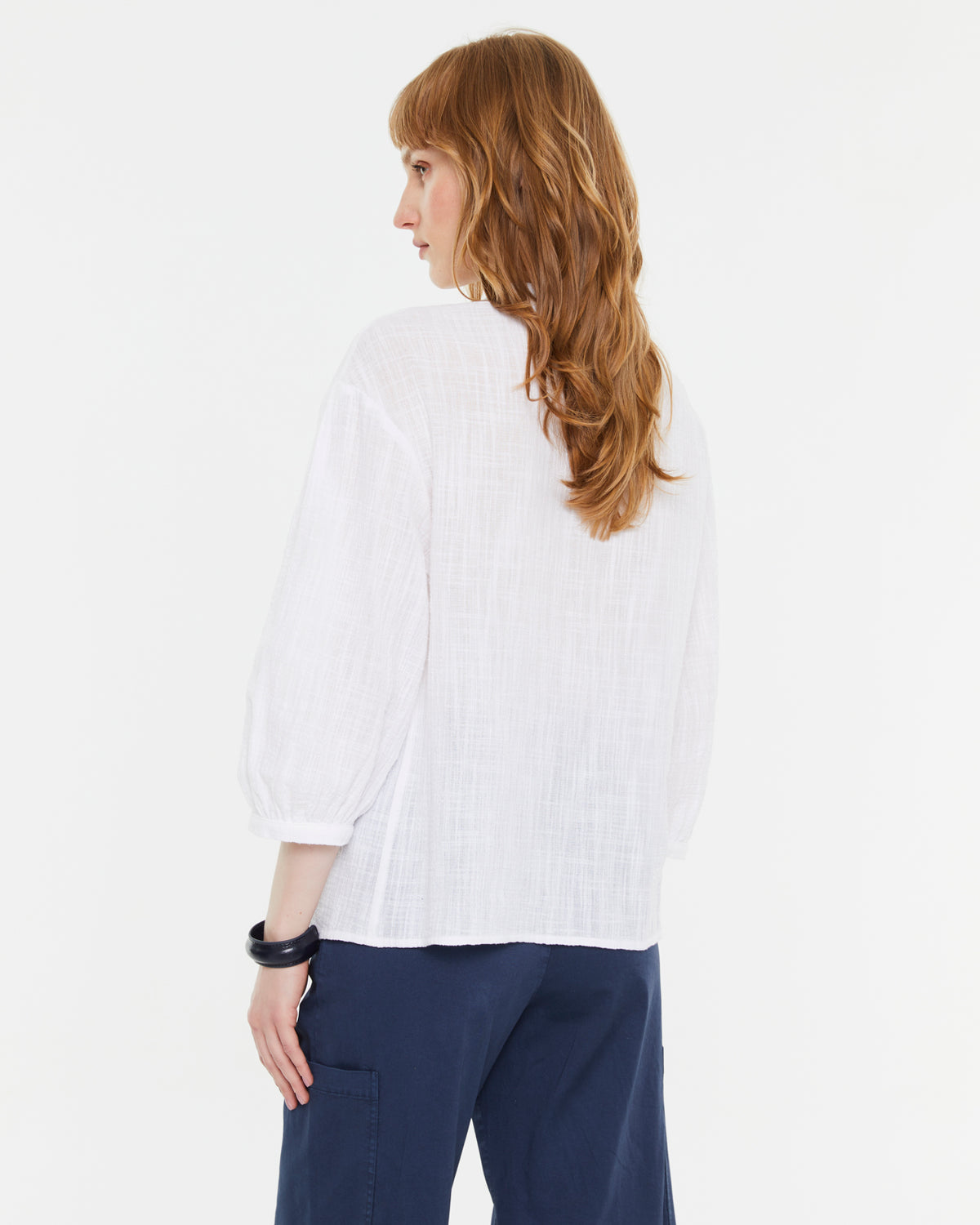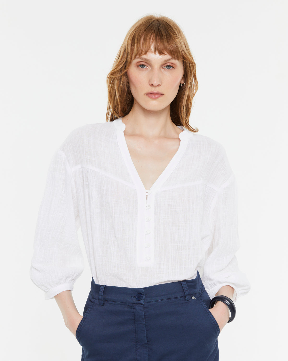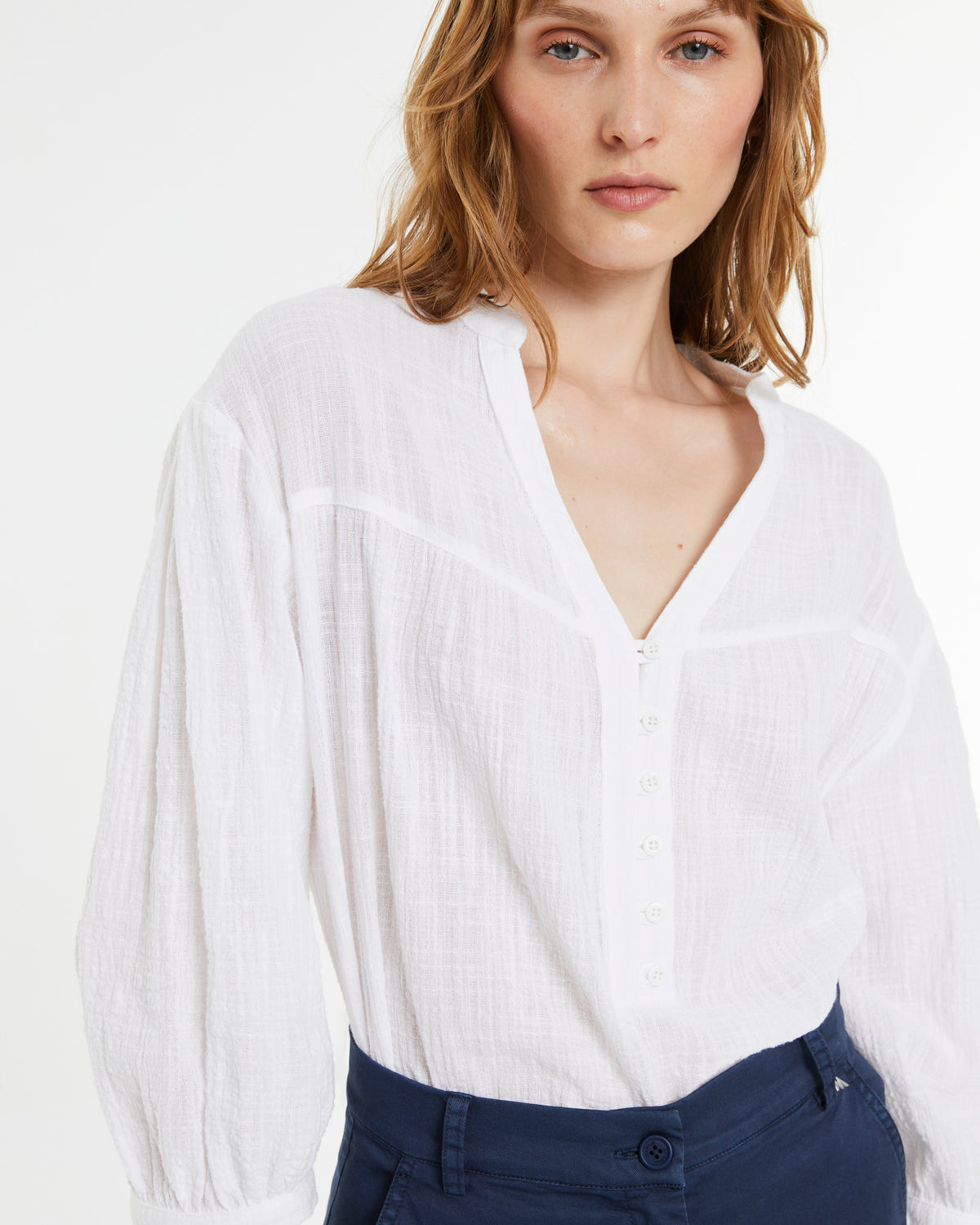 Damenbluse mit V-Ausschnitt und Puffärmeln. Raffung an Brust und Ärmeln. Knopf- und Schlaufenverschluss vorne. Normale Passform.