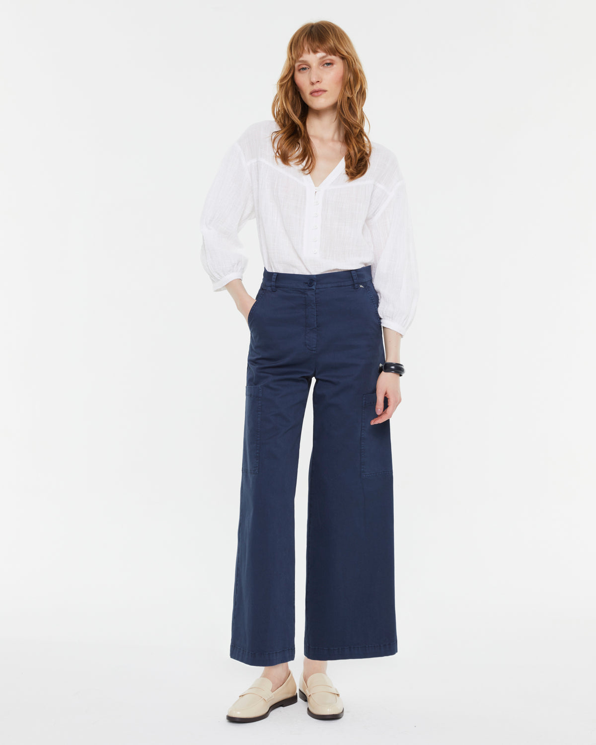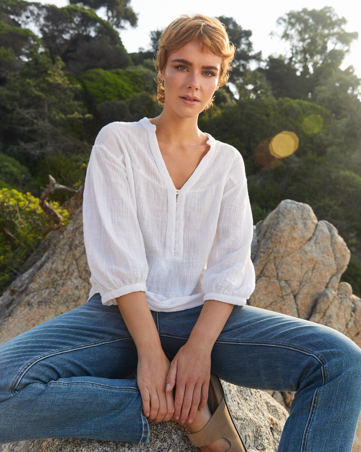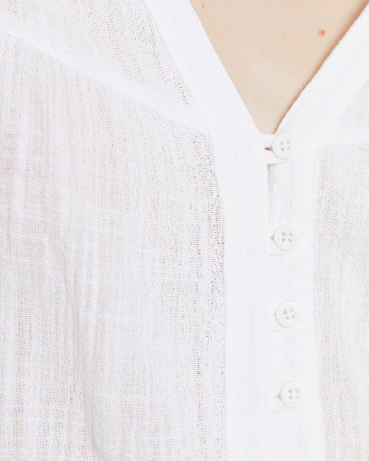 Damenbluse mit V-Ausschnitt und Puffärmeln. Raffung an Brust und Ärmeln. Knopf- und Schlaufenverschluss vorne. Normale Passform.