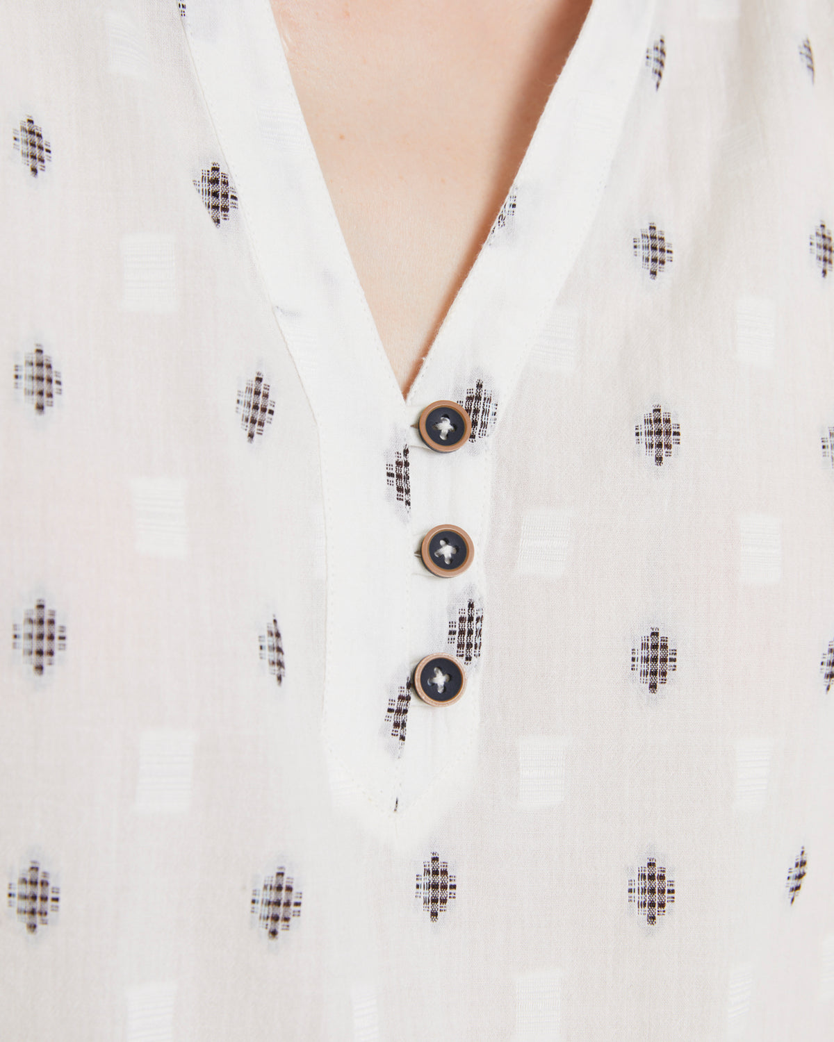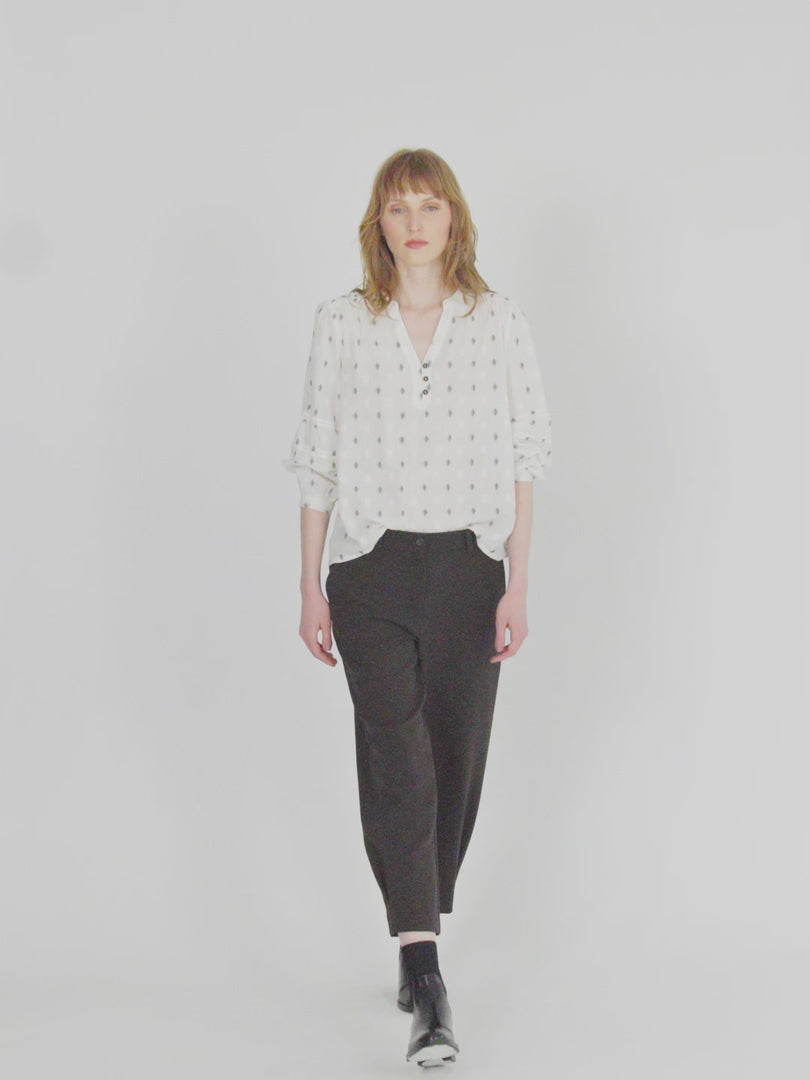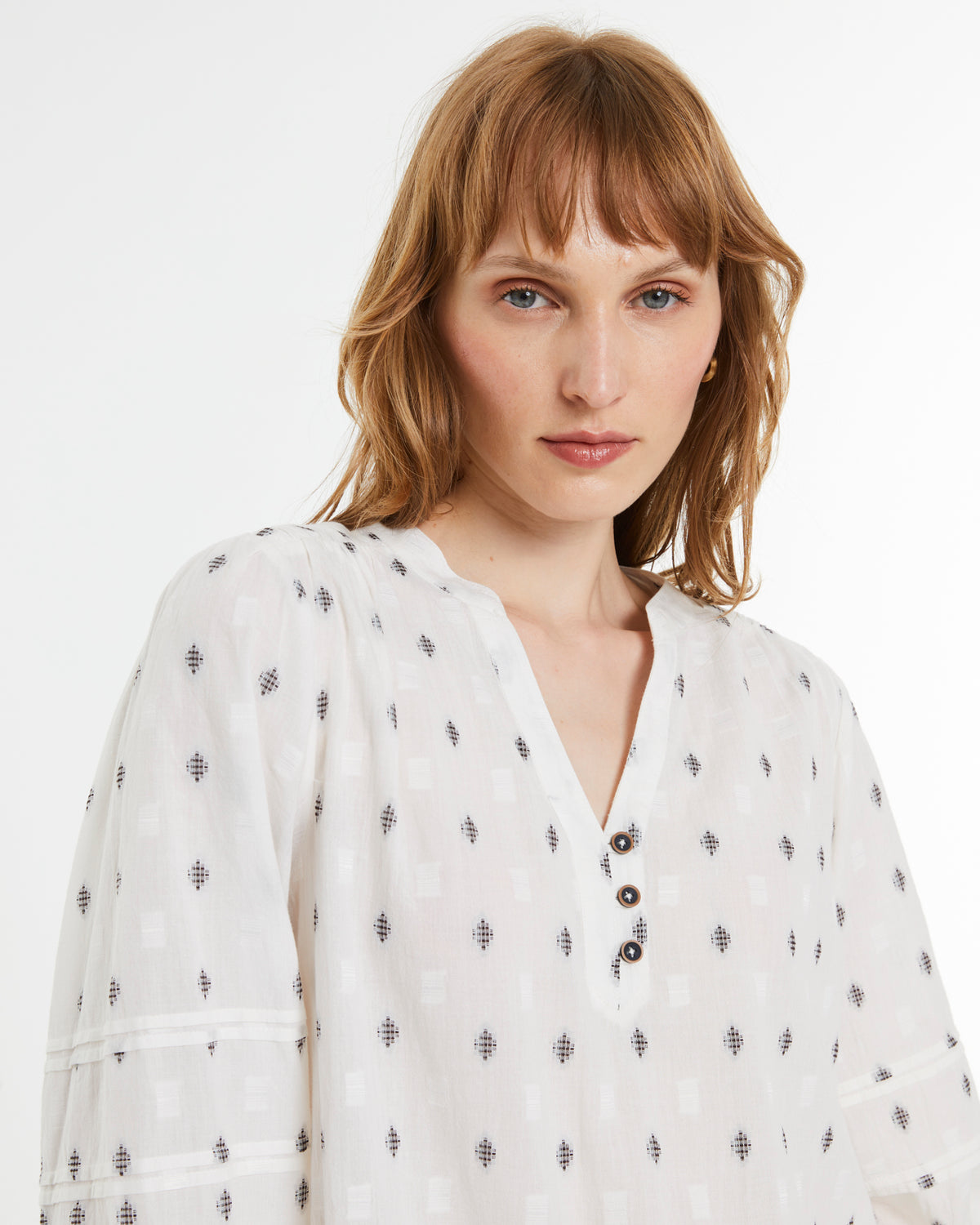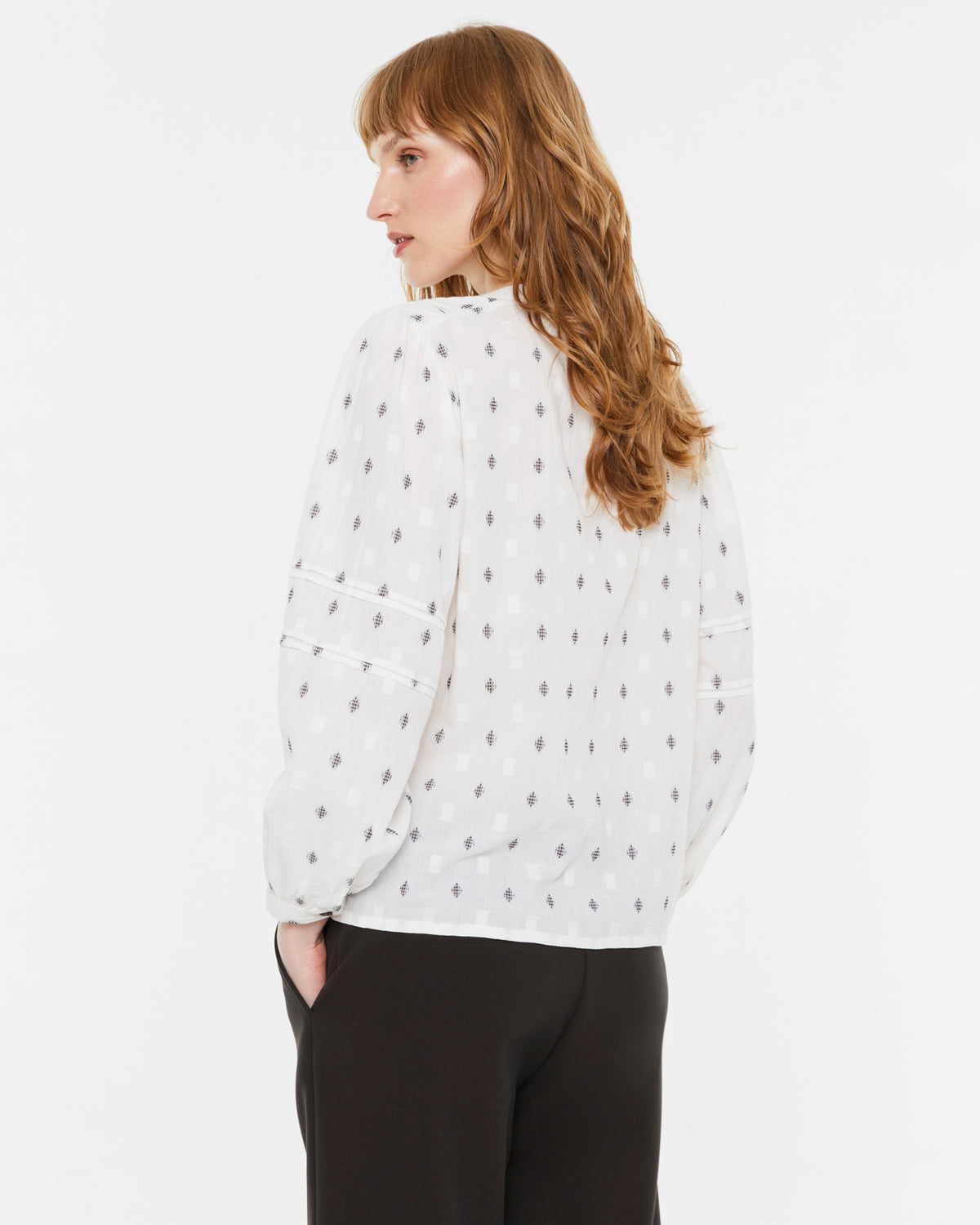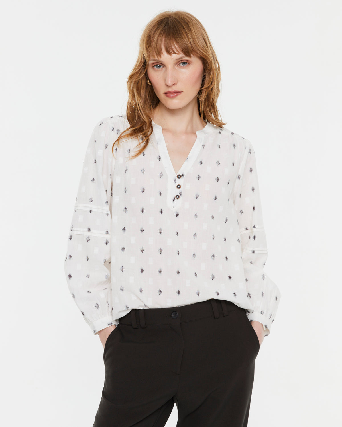 Damenbluse mit kleiner Stickerei, V-förmigem Stehkragen und langen Ärmeln. Faltendetails an Ärmeln und Schulterpartie. Knopf- und Schlaufenverschluss vorne. Normale Passform.