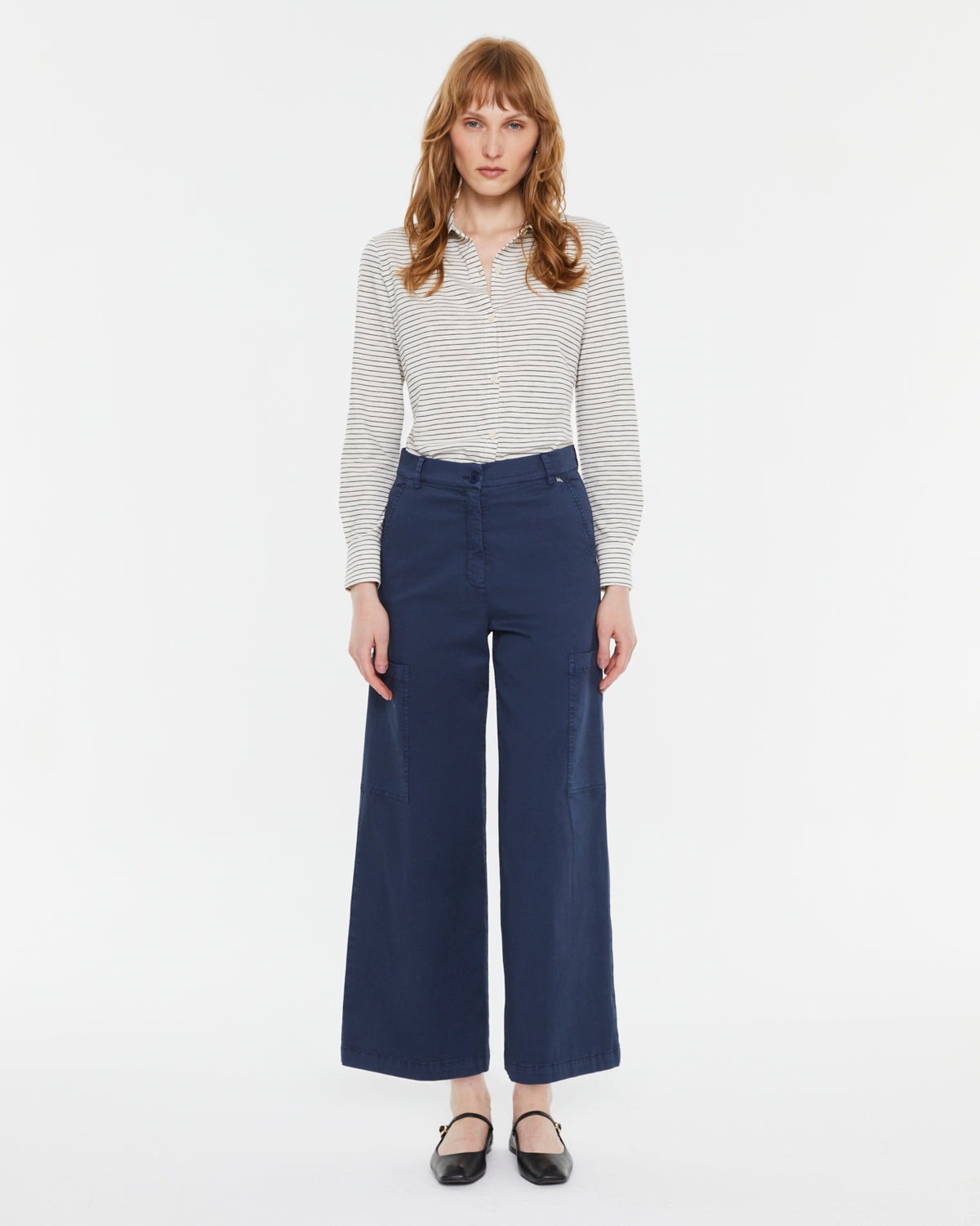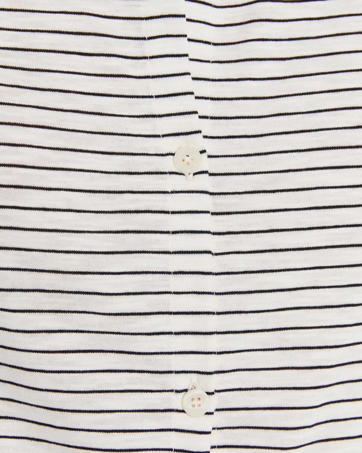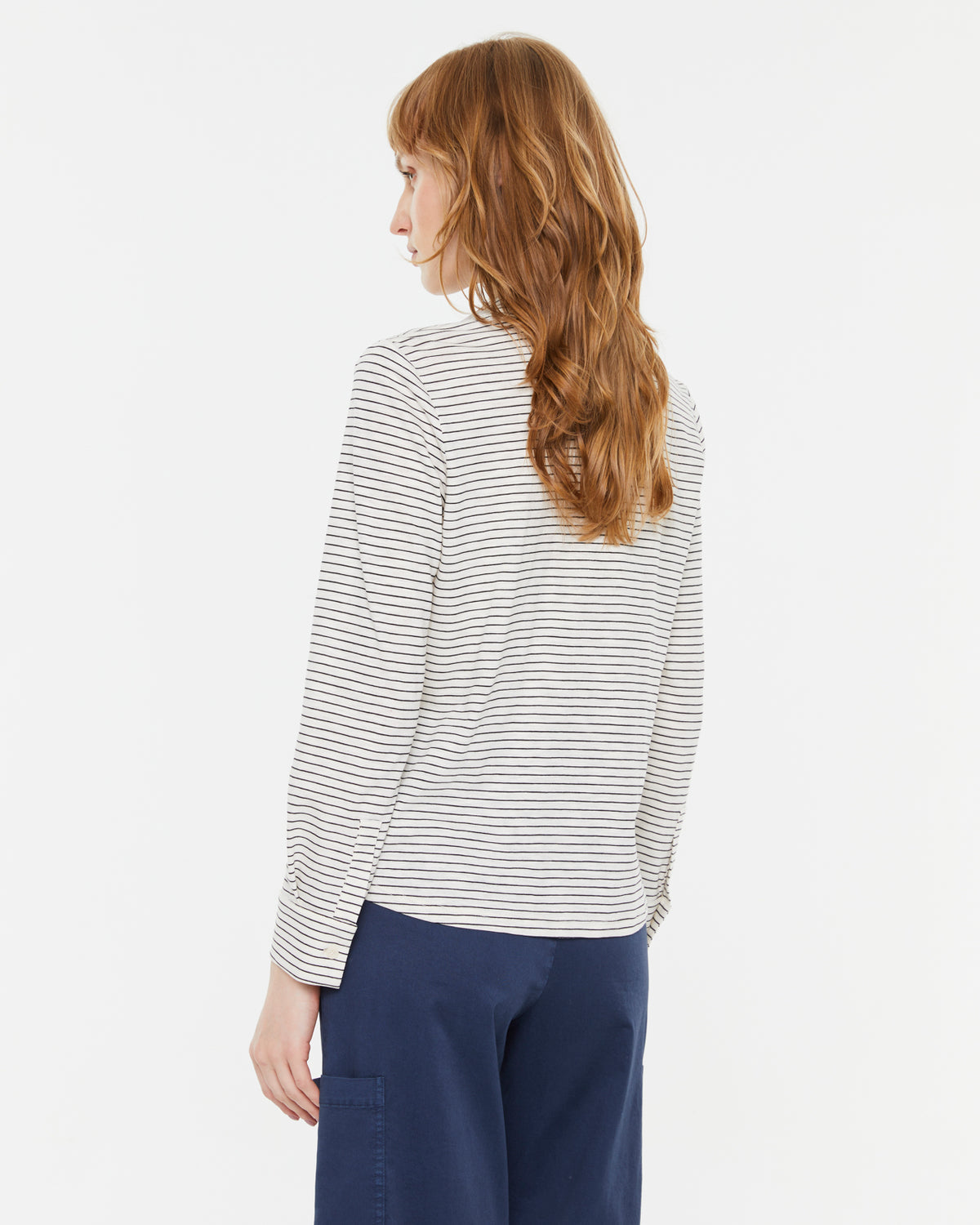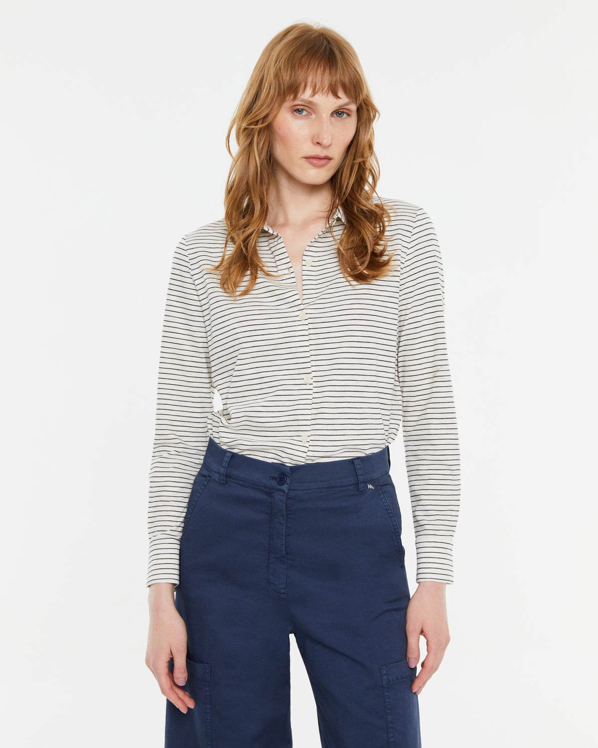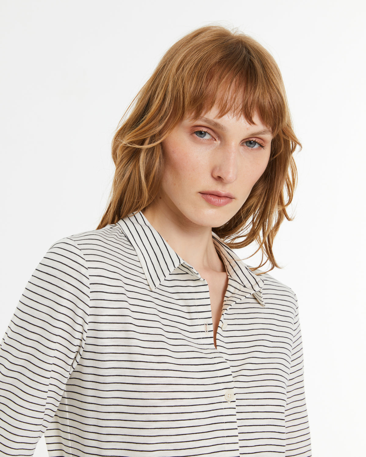 Gestreiftes Damen-T-Shirt mit Hemdkragen und Seitenschlitzen.
