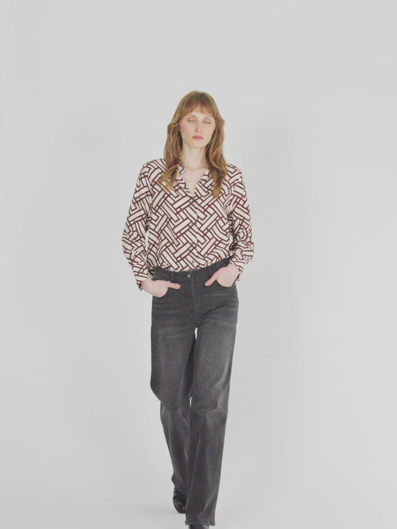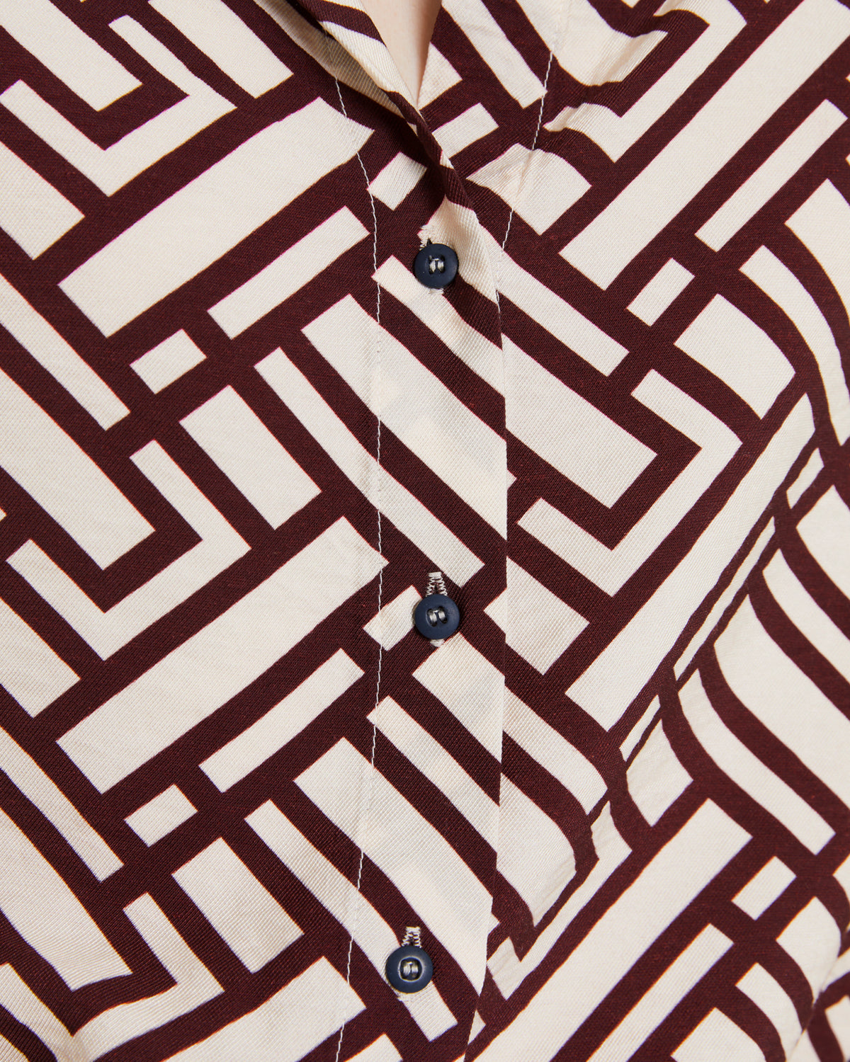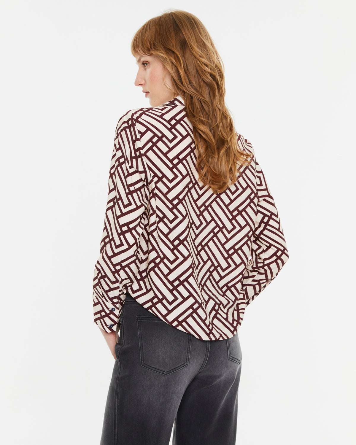 Damenhemd mit geometrischem Print, langen Ärmeln und V-Ausschnitt. Knopfverschluss vorne. Normale Passform.