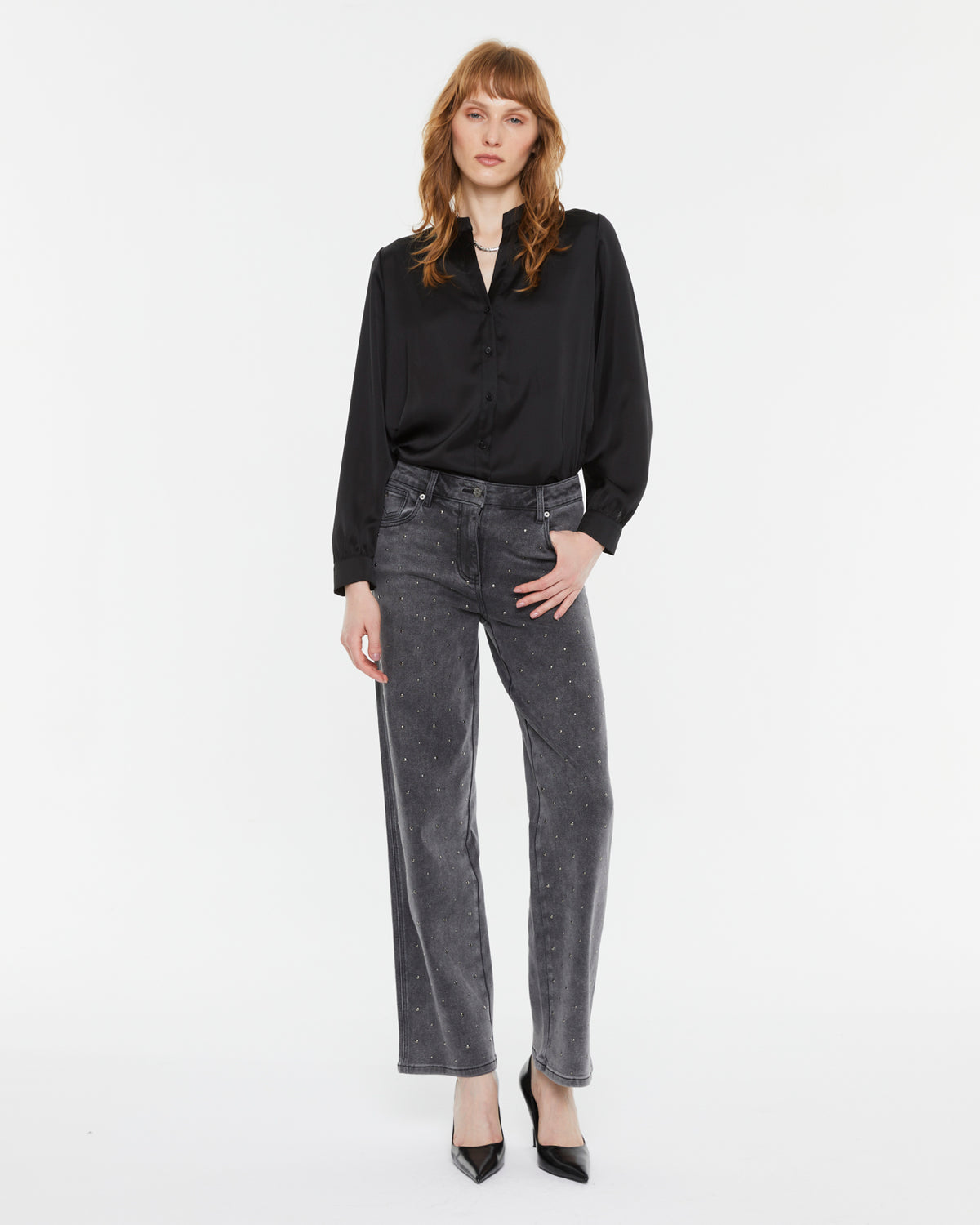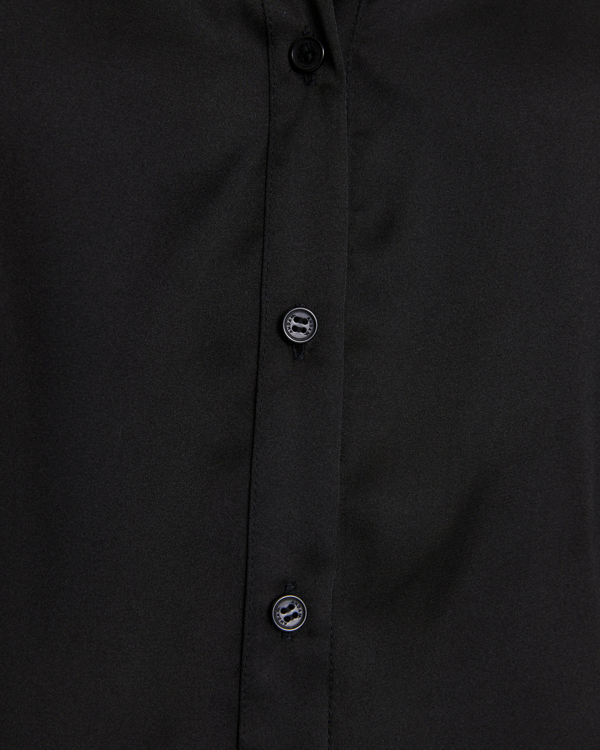 Camisa de mujer satinada, cuello mao en forma de pico y manga larga. Cierre frontal con botones. Regular fit.