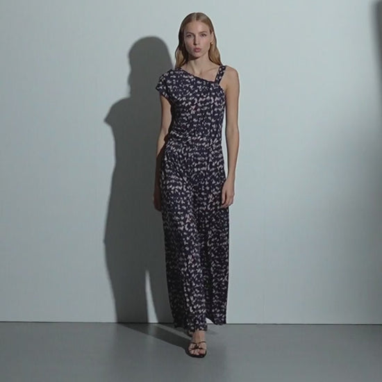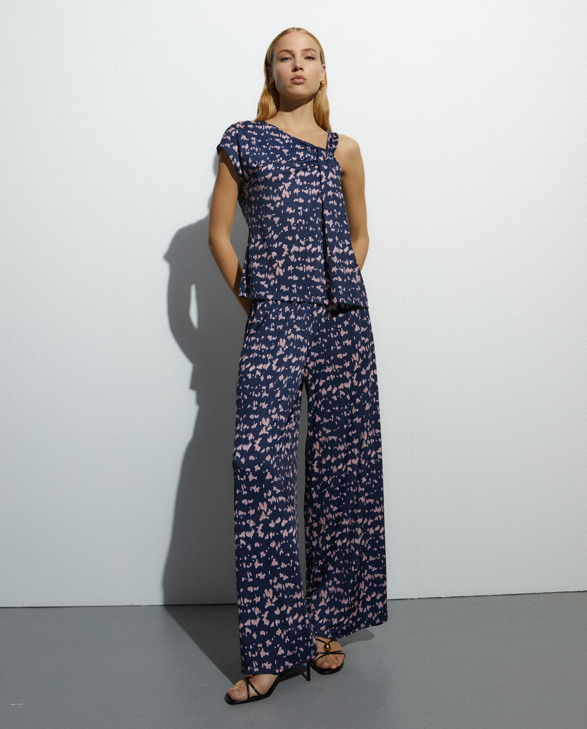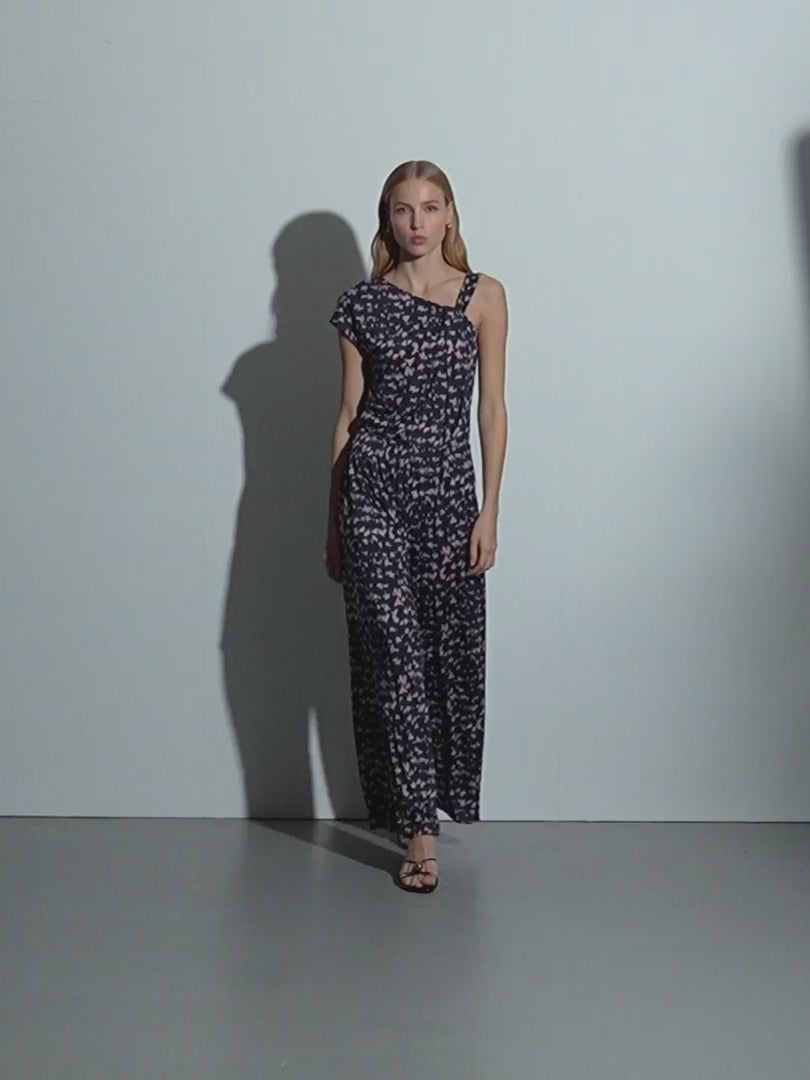 Camiseta estampada de escote asimétrico. Mezcla de mangas, una es manga caída y la otra tirante ancho con efecto recogido. Puedes encontrar su pantalón a conjunto y conseguir un efecto mono de lo más confortable y femenino. Regular fit.
