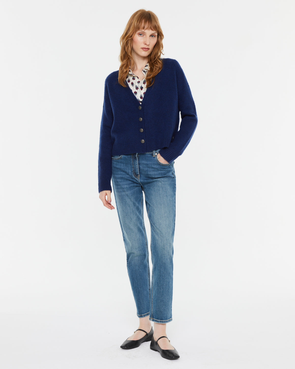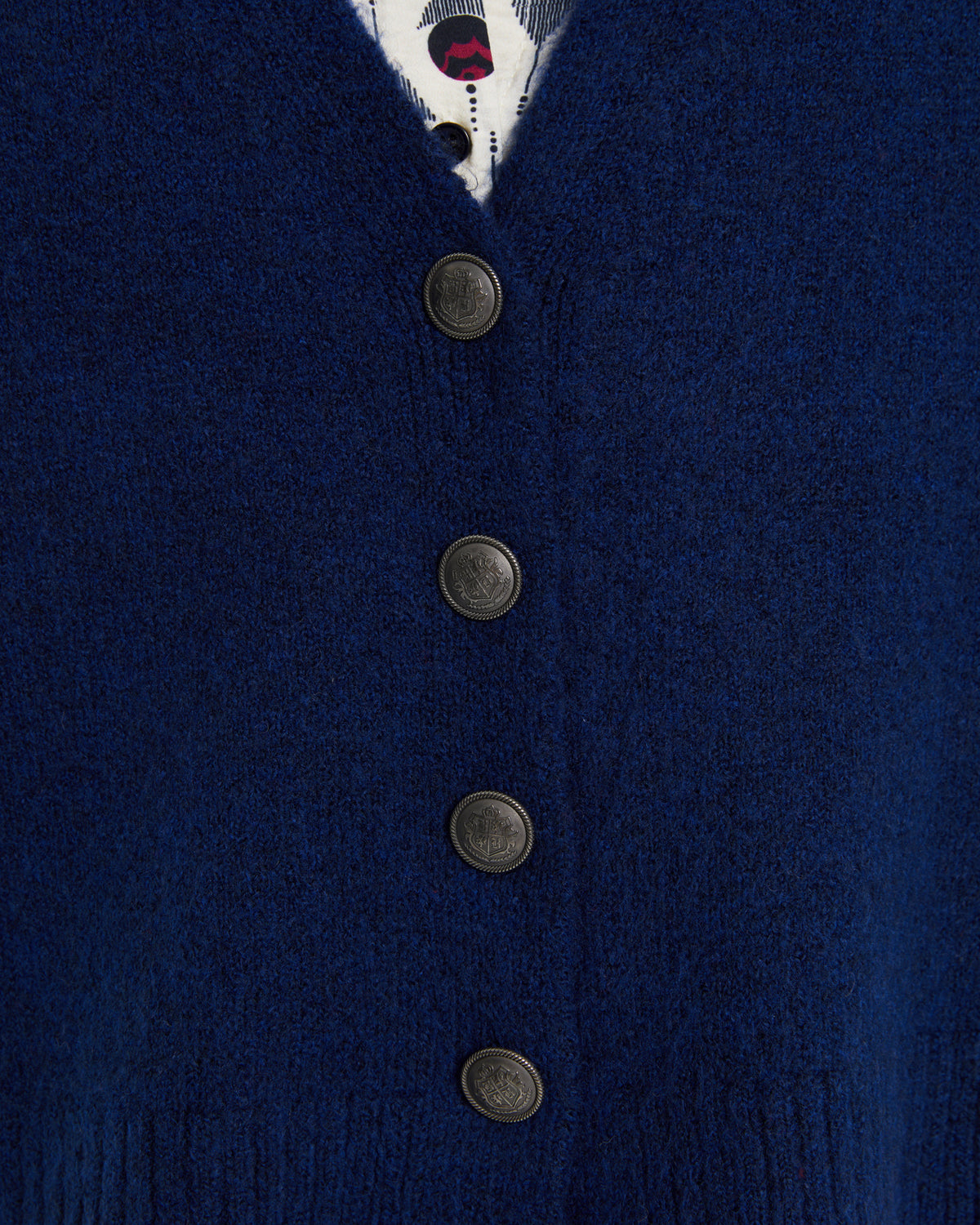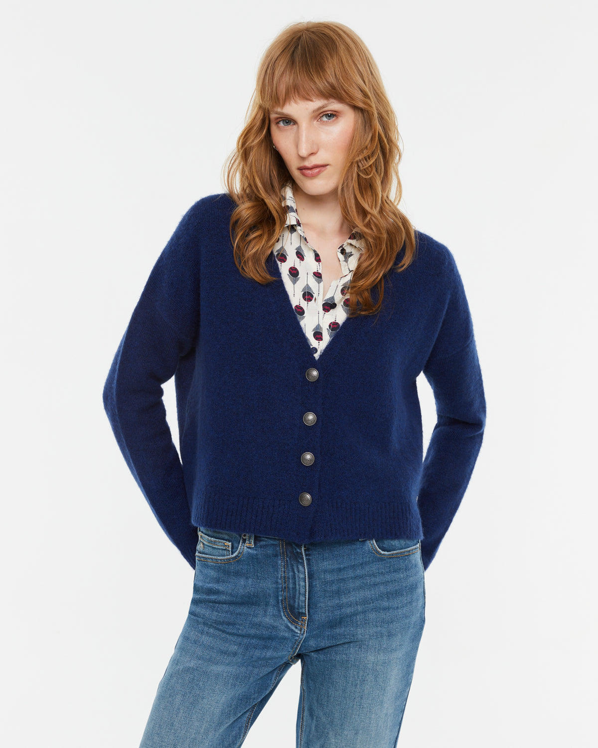 Strickjacke mit V-Ausschnitt und langen Ärmeln. Frontverschluss mit Metallknöpfen im Military-Stil. Gerippte Bündchen und Saum. Diese feminine Basic-Strickjacke verleiht Ihrem Look einen jugendlichen, modernen Touch. Normale Passform.