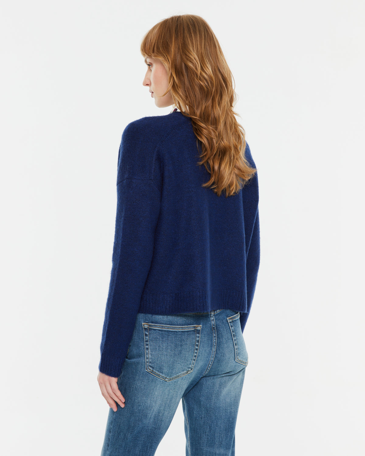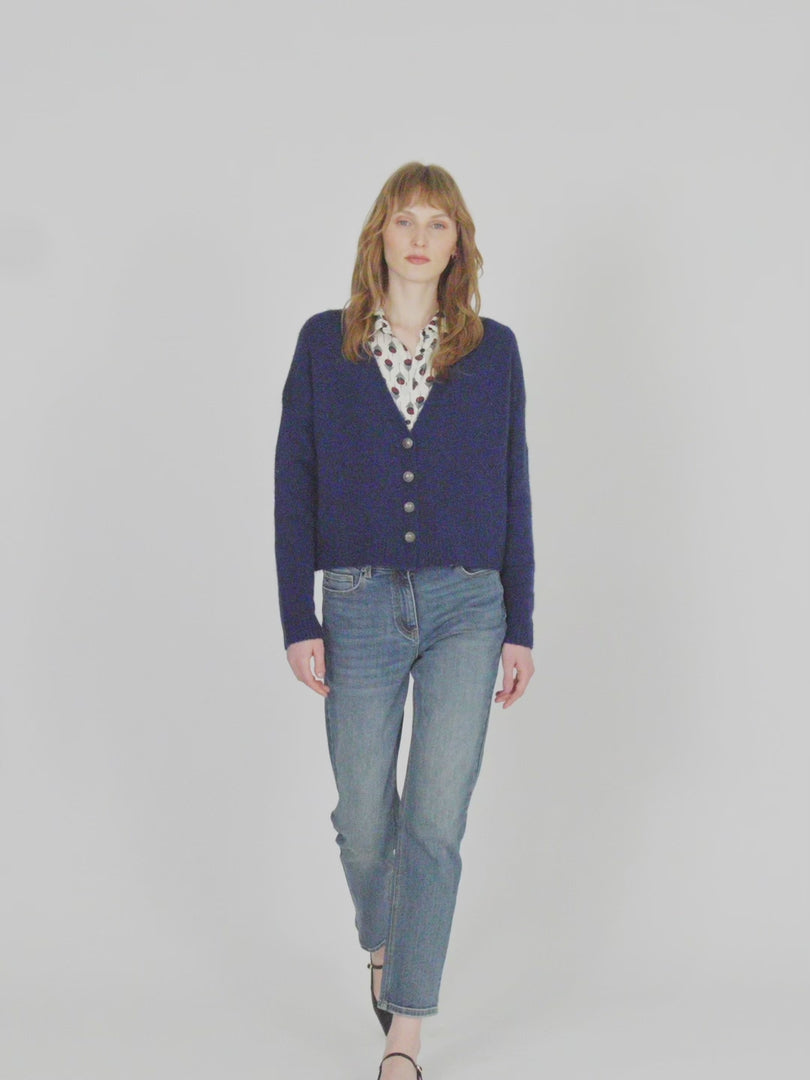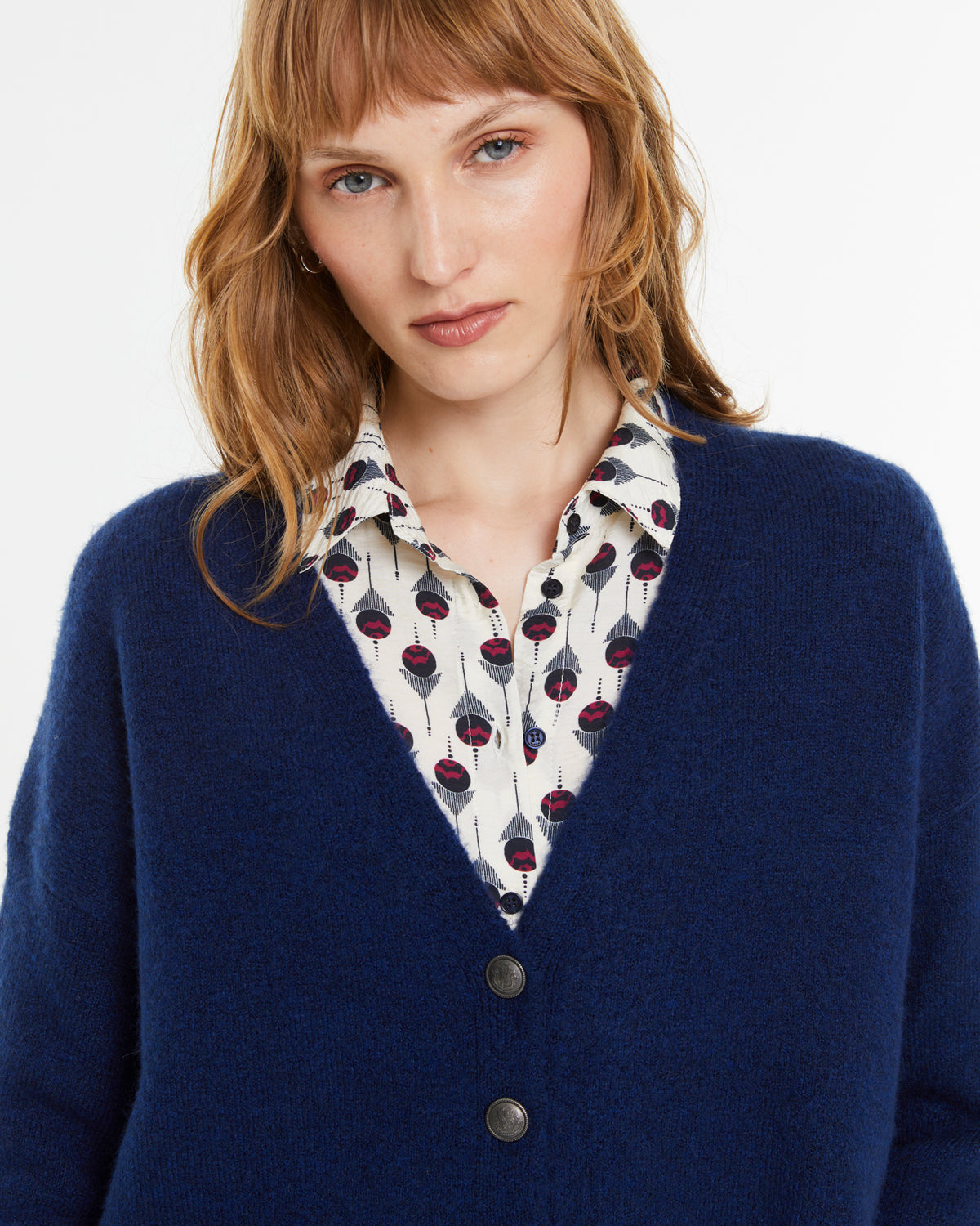 Strickjacke mit V-Ausschnitt und langen Ärmeln. Frontverschluss mit Metallknöpfen im Military-Stil. Gerippte Bündchen und Saum. Diese feminine Basic-Strickjacke verleiht Ihrem Look einen jugendlichen, modernen Touch. Normale Passform.
