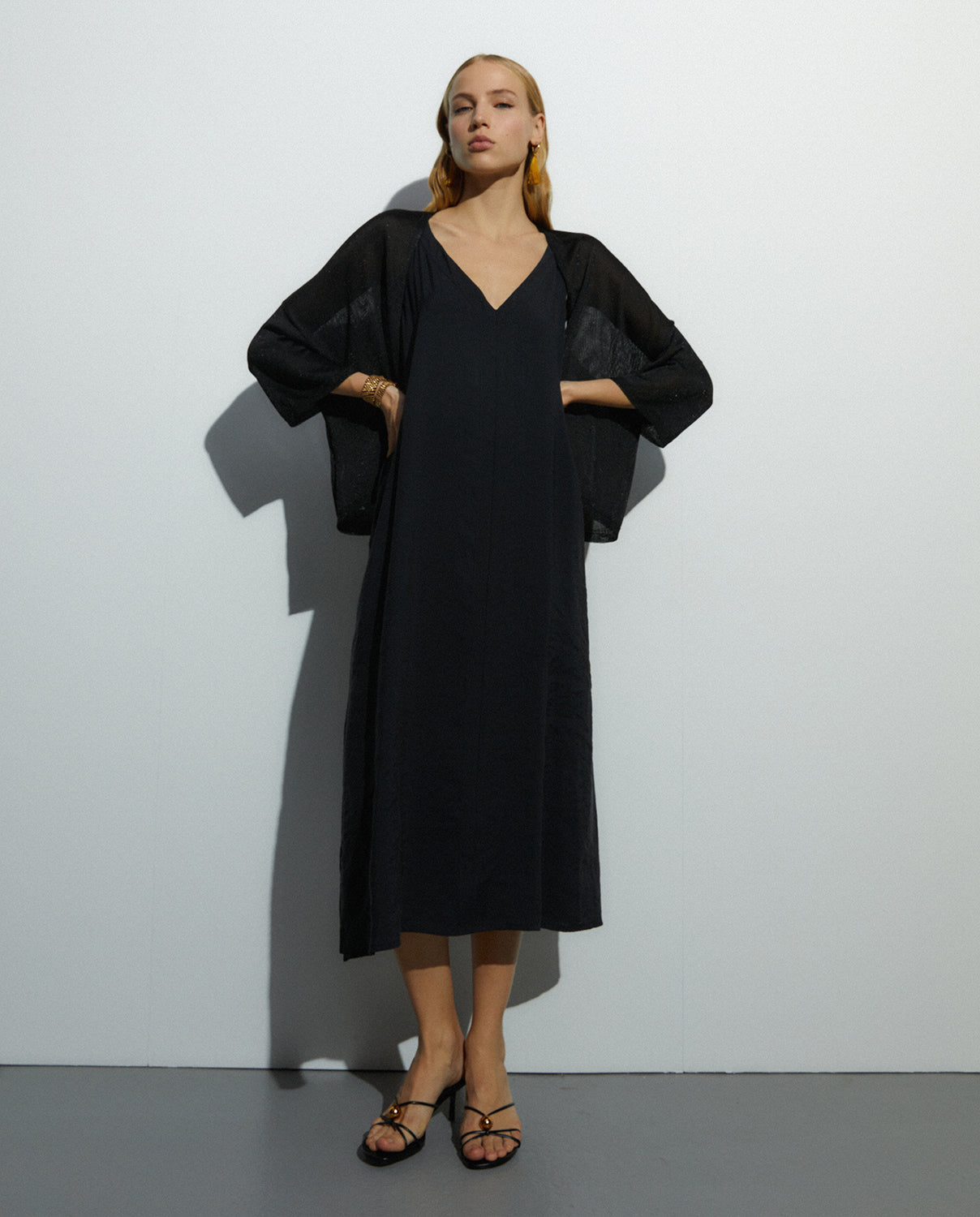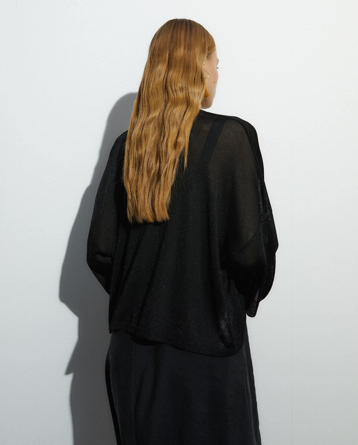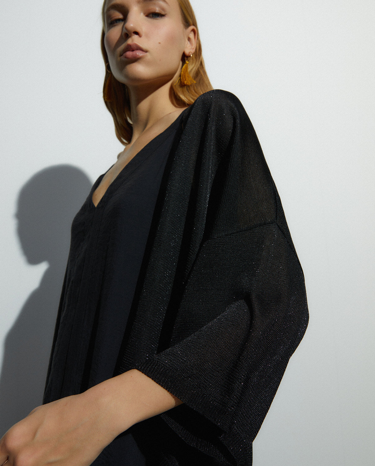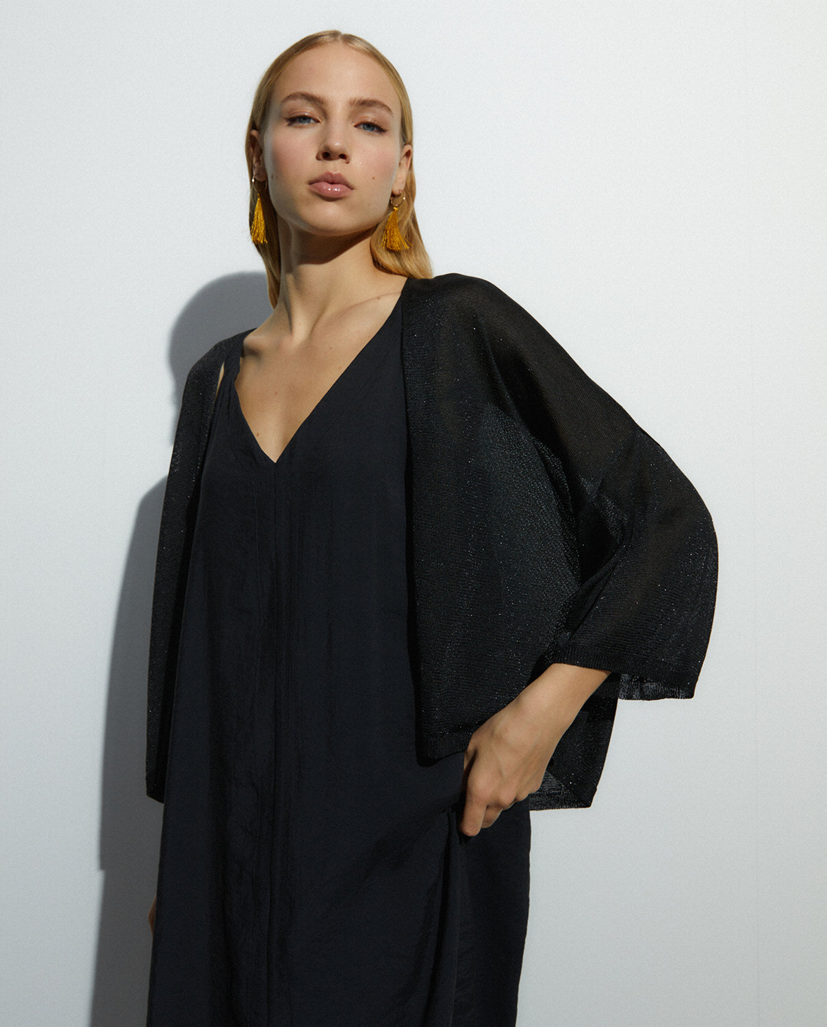 Cárdigan tipo kimono de manga francesa ancha. Confeccionado con hilo metalizado en color plata. Es la prenda perfecta para llevar con vestidos dandole al look un toque extremado. Regular fit.