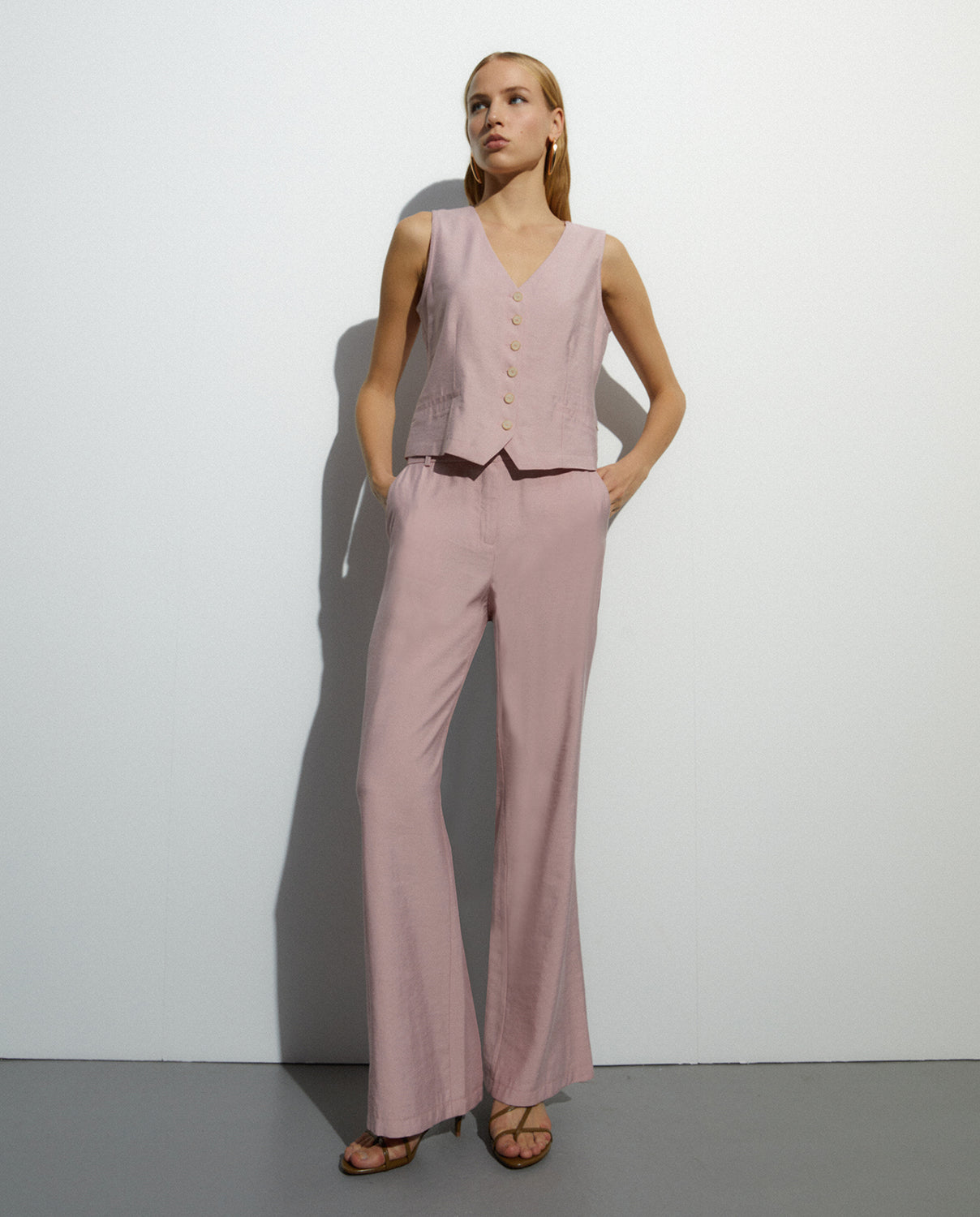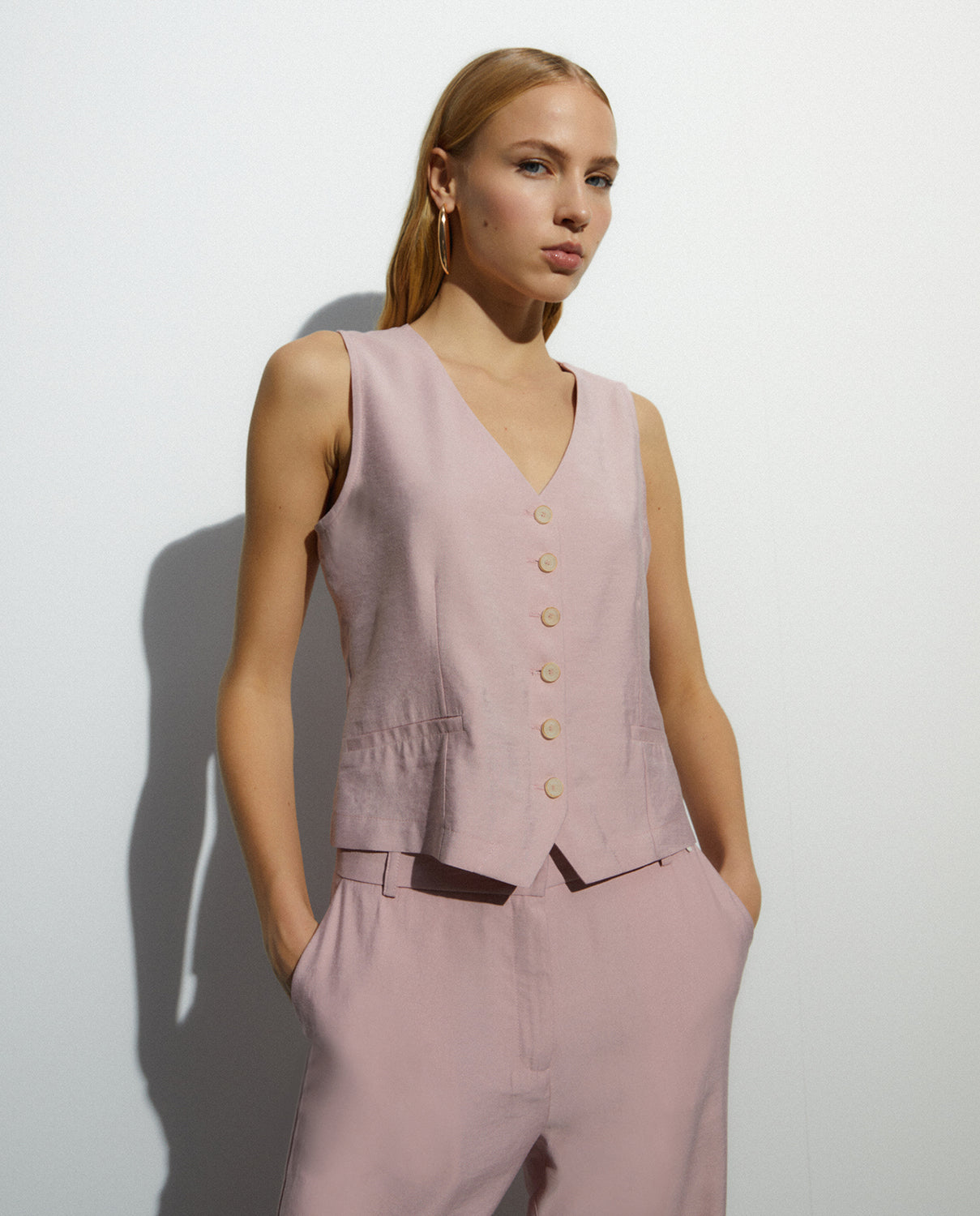 Chaleco de mujer cuello pico y bolsillos ojal. Cierre frontal con botones. Puedes encontrar su pantalón a conjunto y conseguir un look de lo más actual. Regular fit..