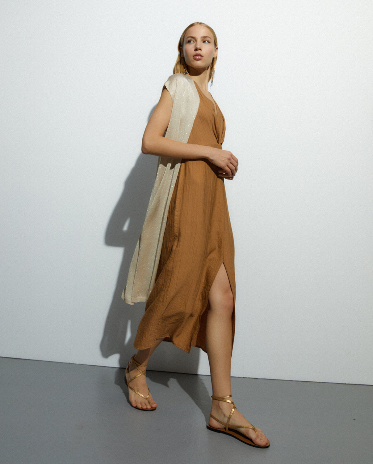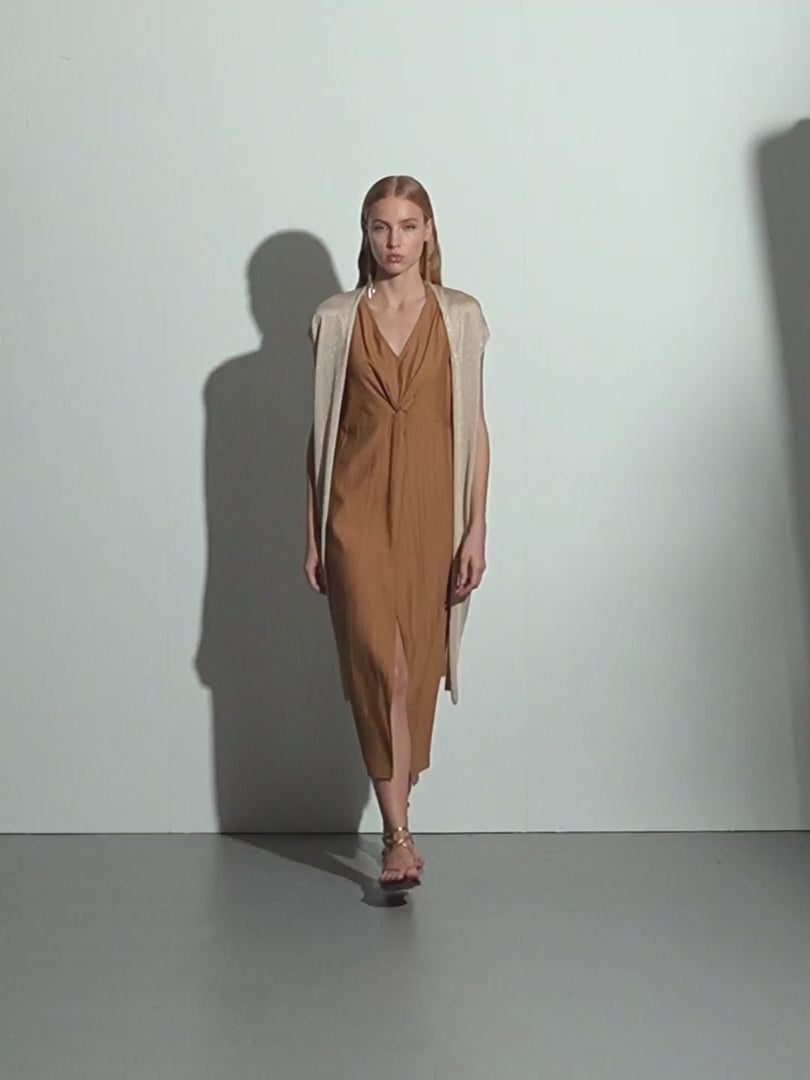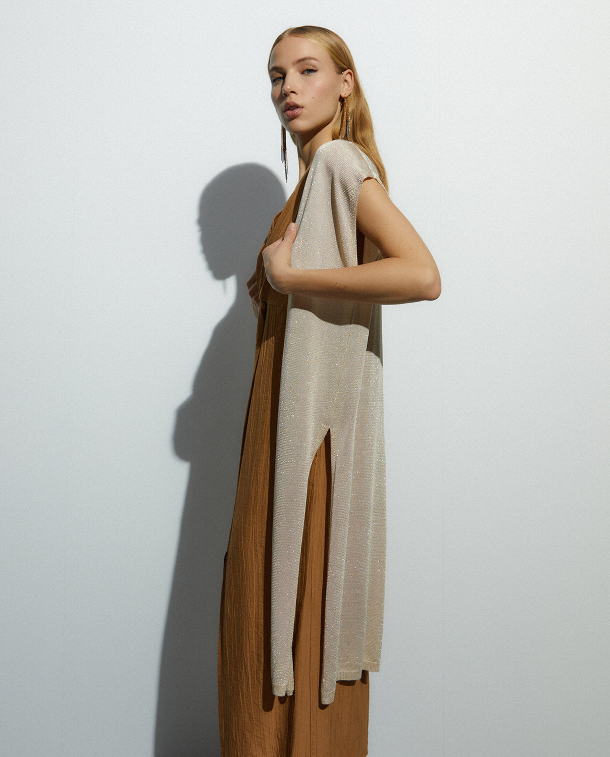 Chaleco largo en punto confeccionado con hilo metalizado dorado. Aberturas laterales. Regular fit.