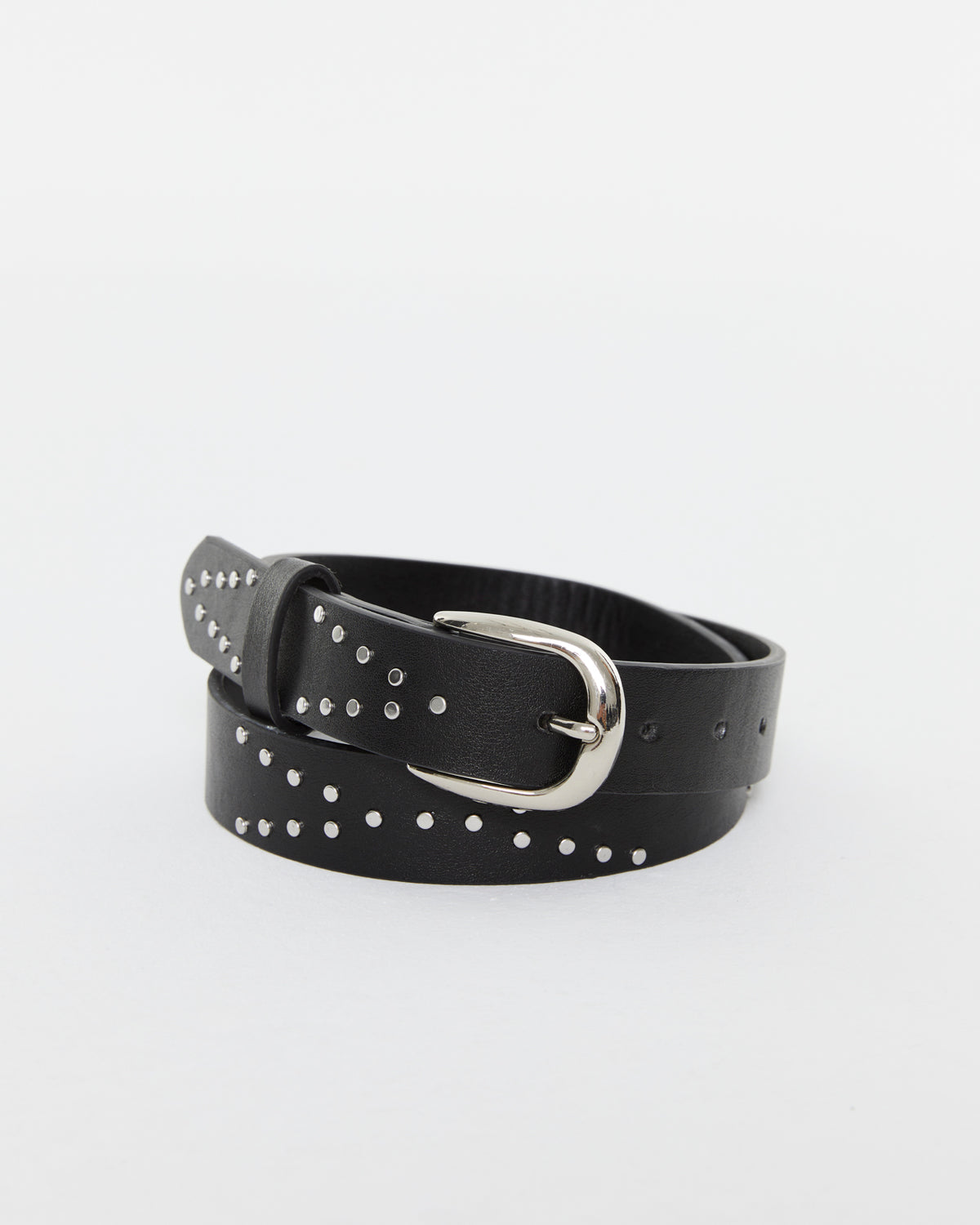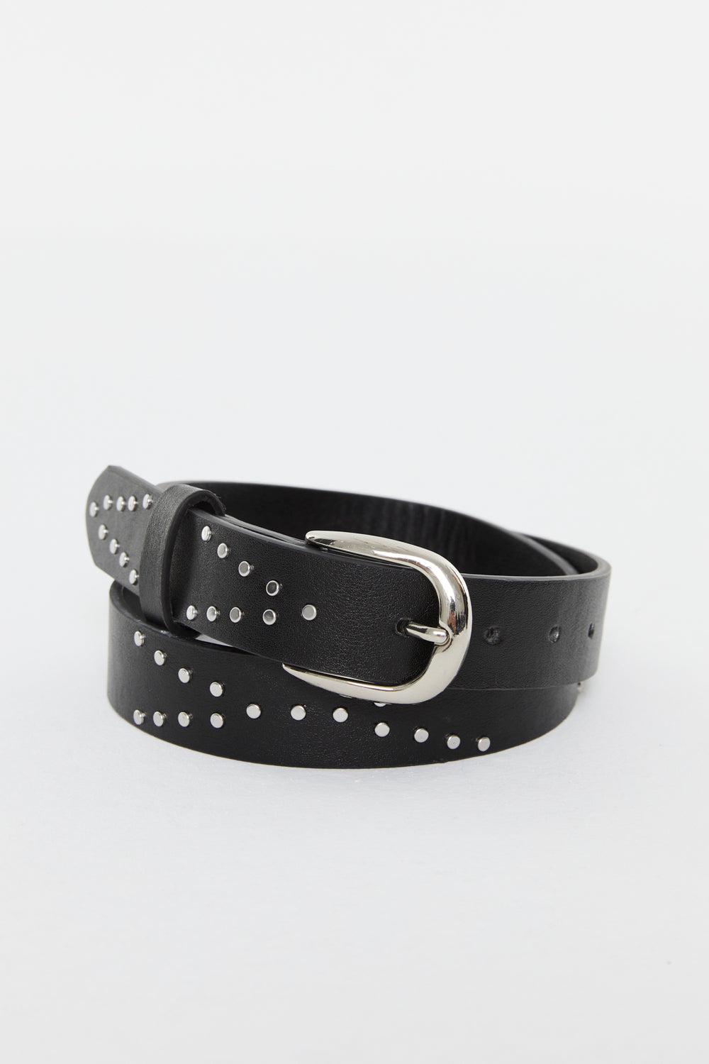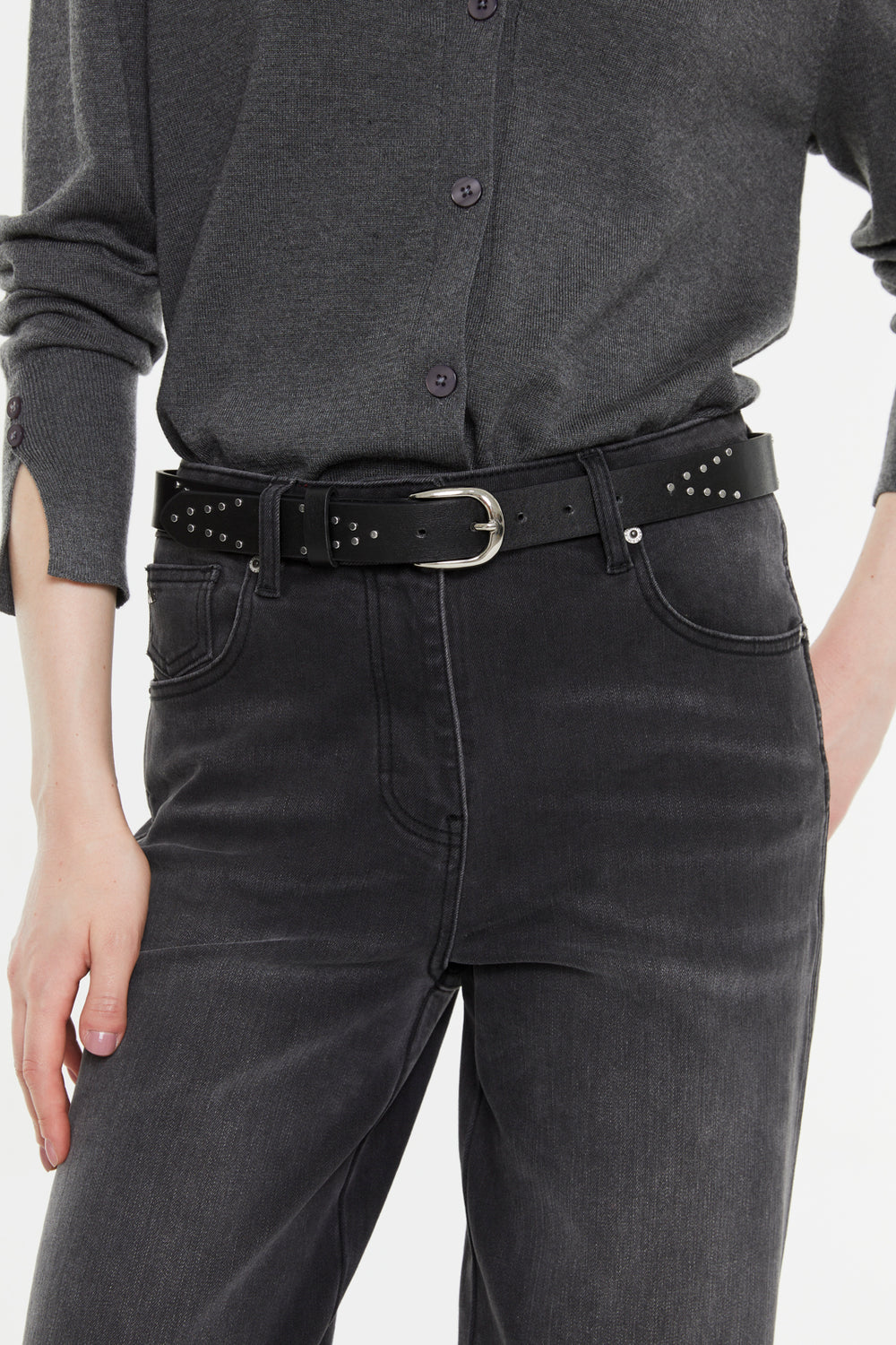 Kunstledergürtel mit verstellbarer Metallschnalle. Nietendetail.