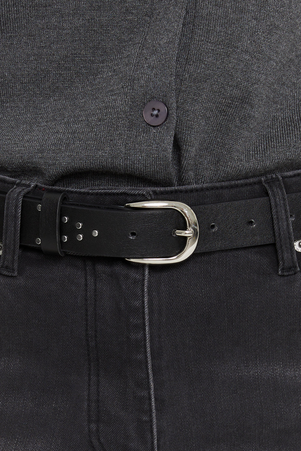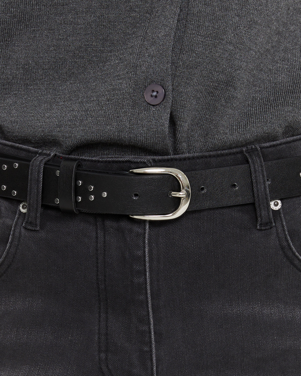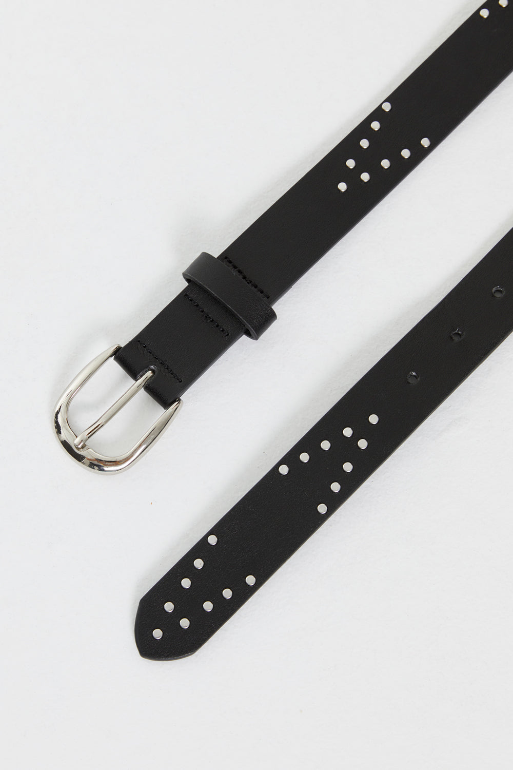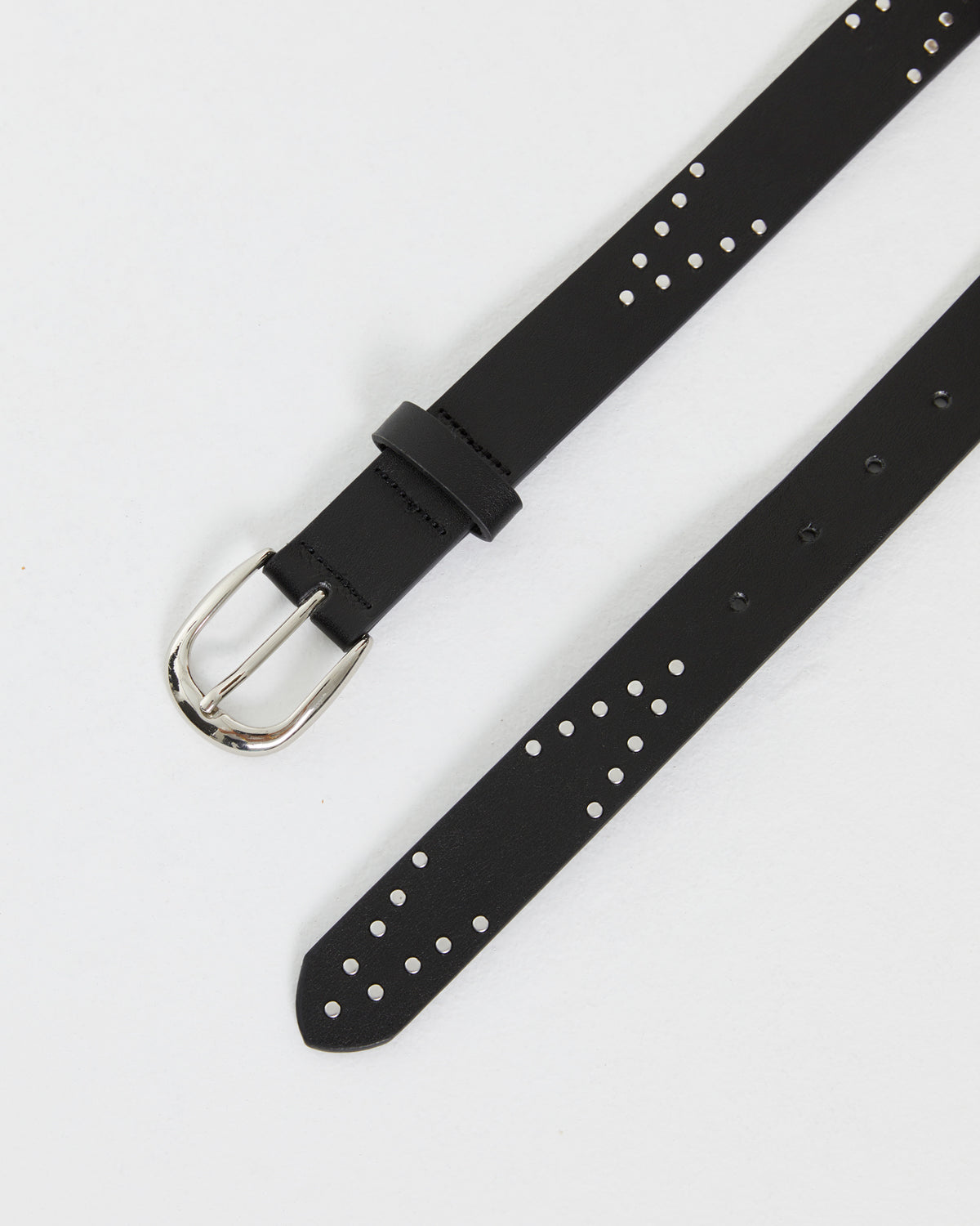 Kunstledergürtel mit verstellbarer Metallschnalle. Nietendetail.