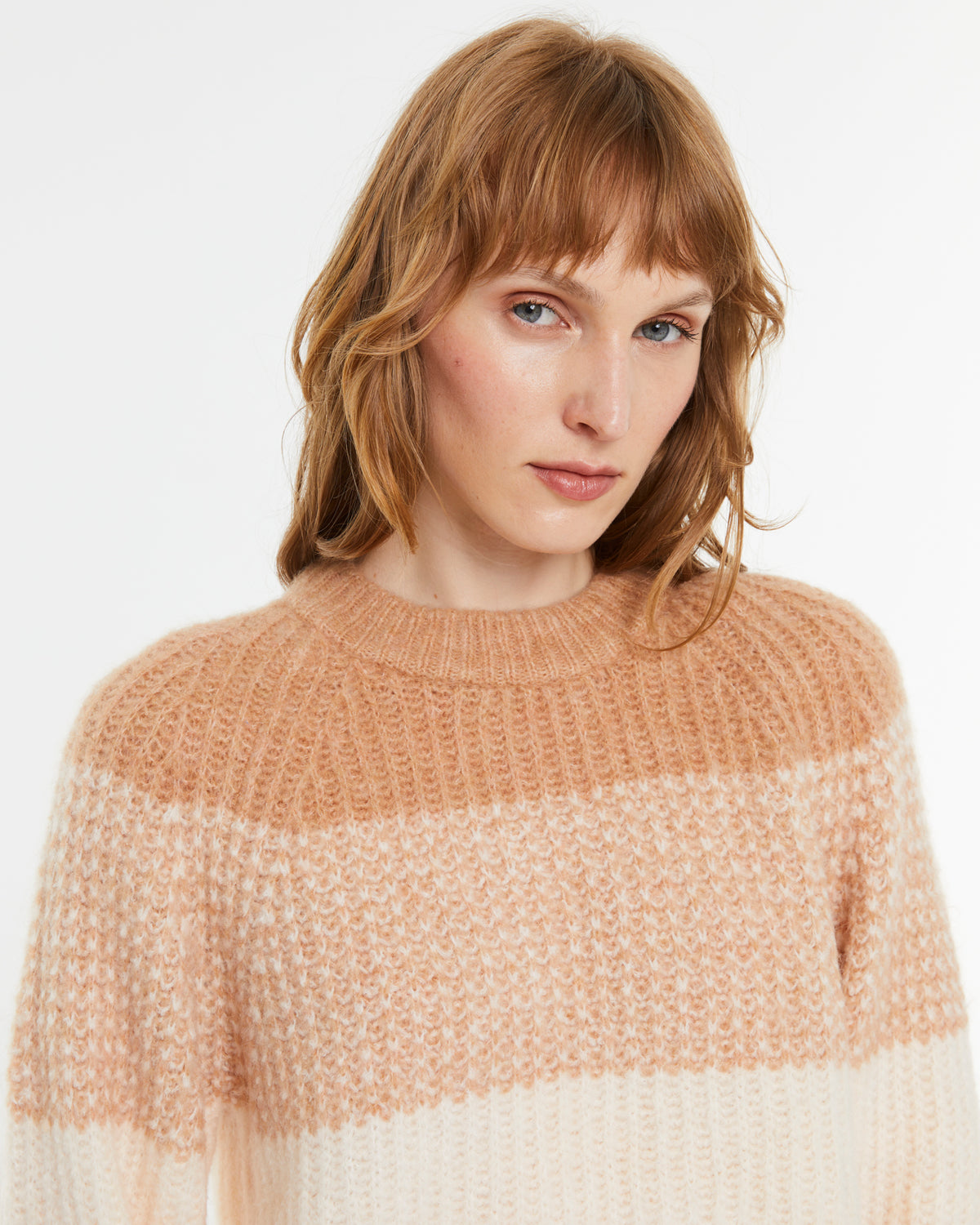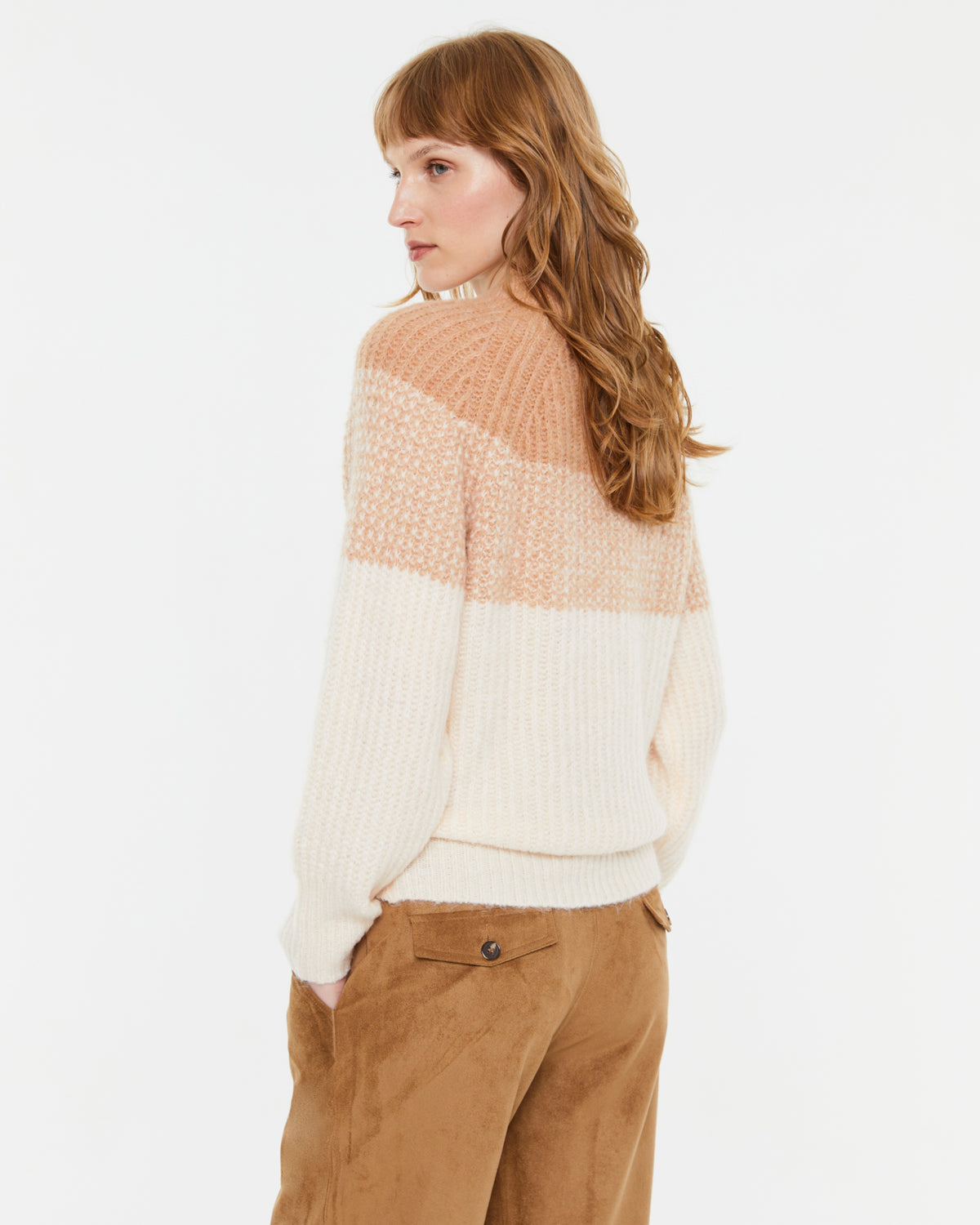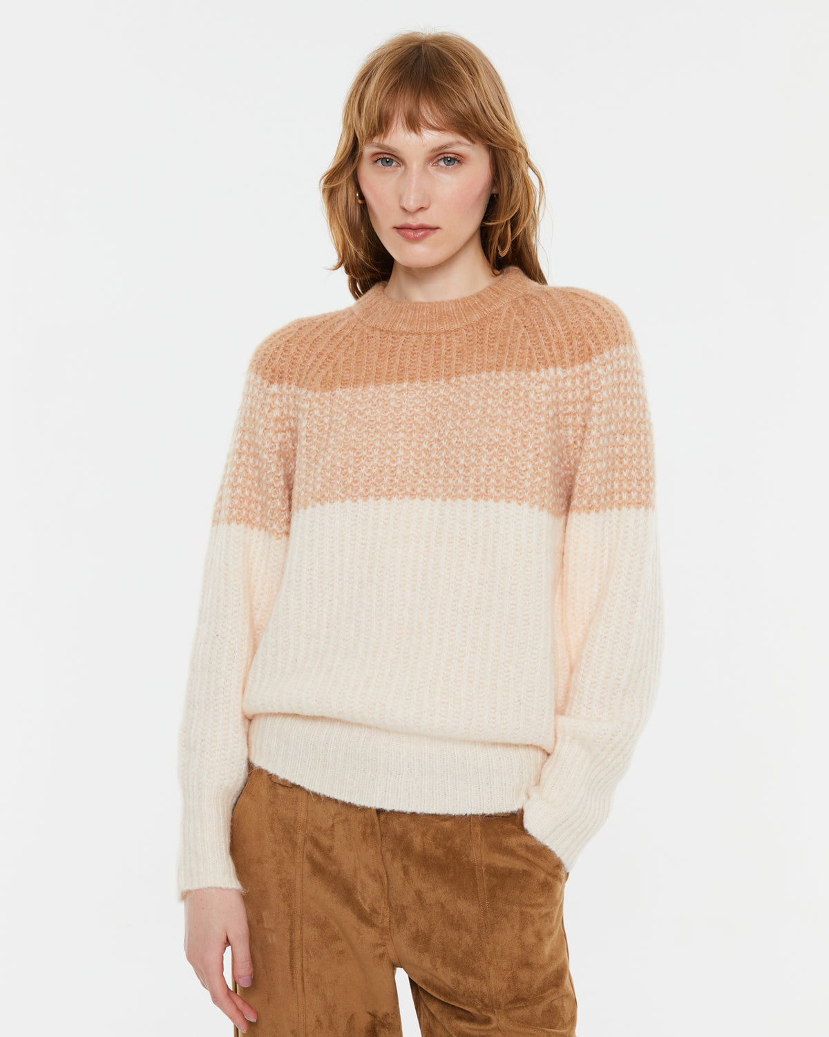 Zweifarbiger Pullover mit Rundhalsausschnitt und Raglanärmeln. Rippenbündchen an Halsausschnitt, Bündchen und Saum. Normale Passform.