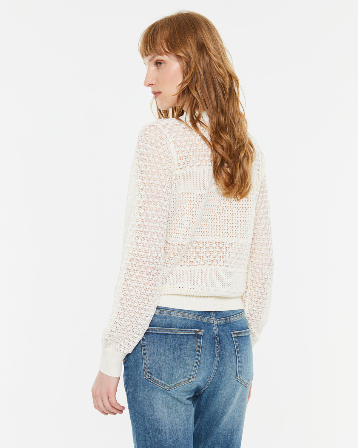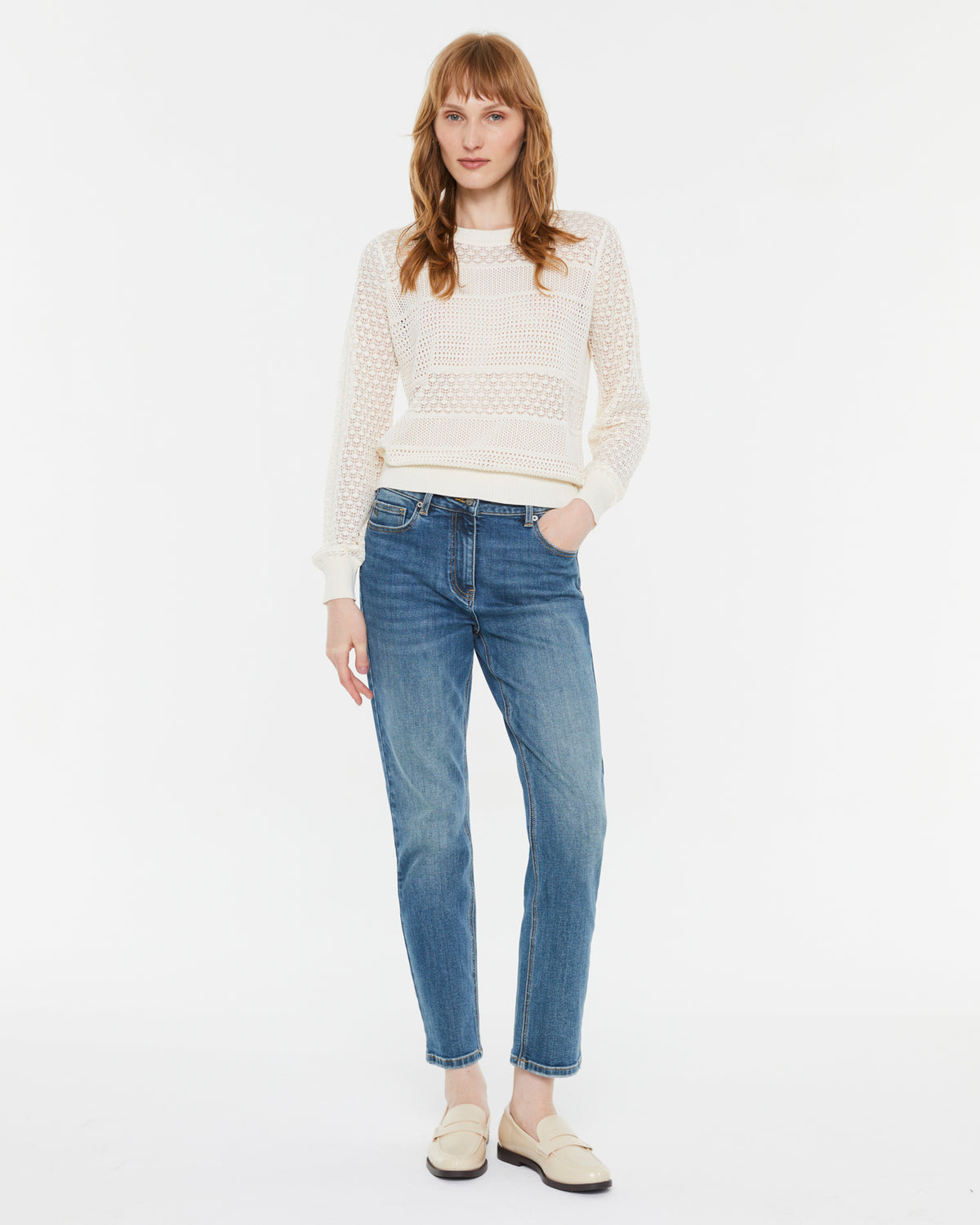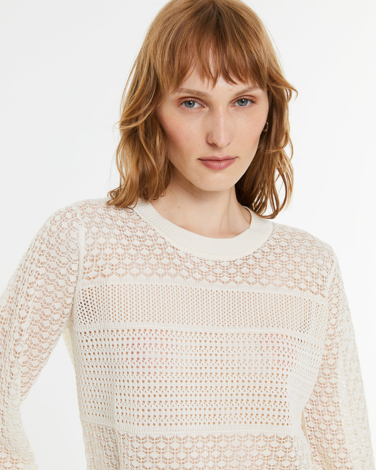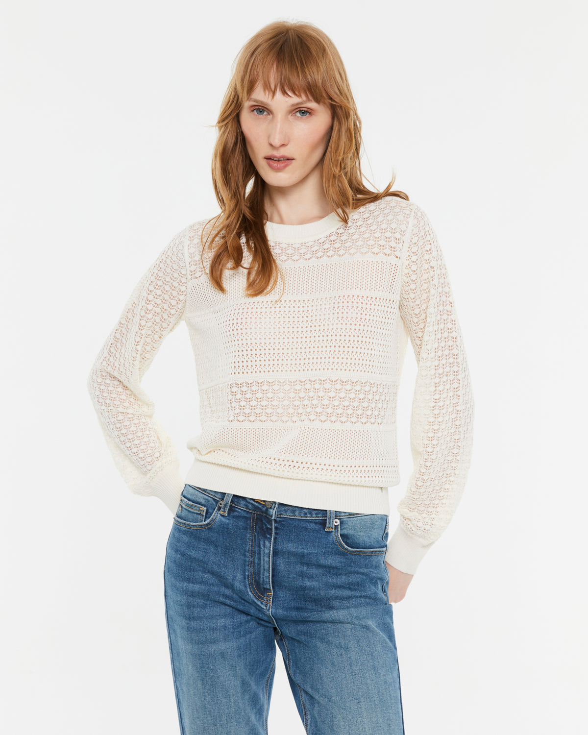 Durchbrochener Pullover mit Rundhalsausschnitt und langen Ärmeln. Rippenbündchen an Halsausschnitt, Bündchen und Saum. Dieser Pullover ist sehr feminin und schmeichelt der Figur. Normale Passform.
