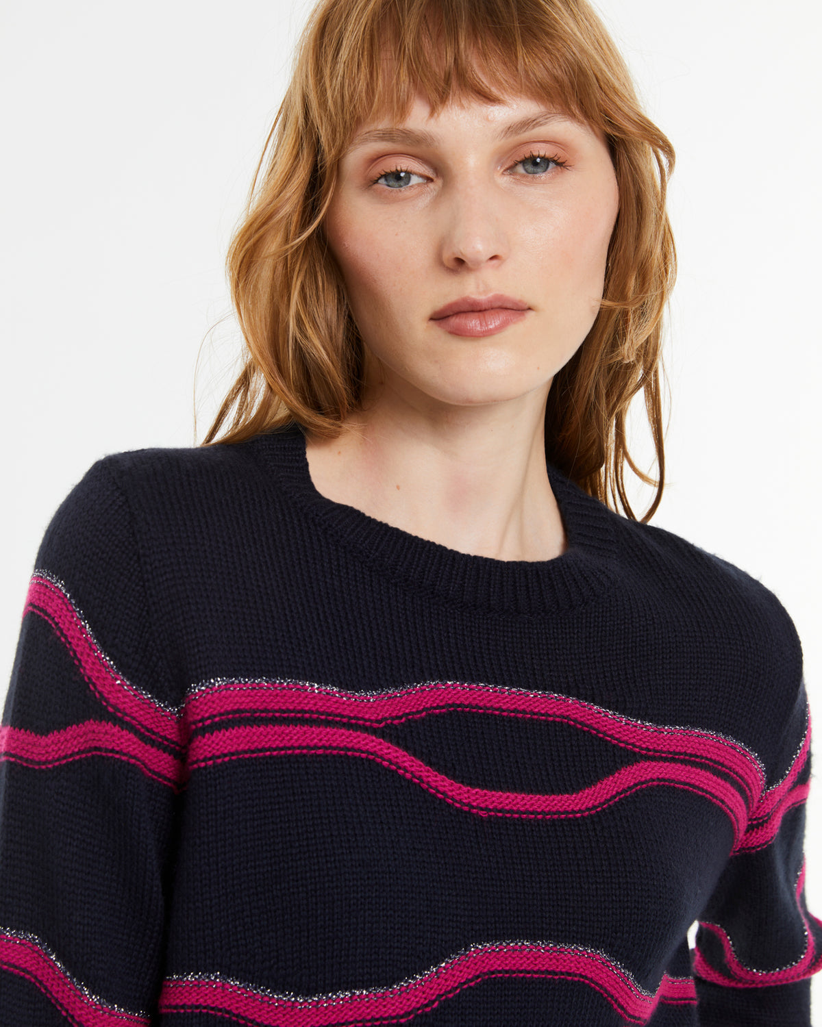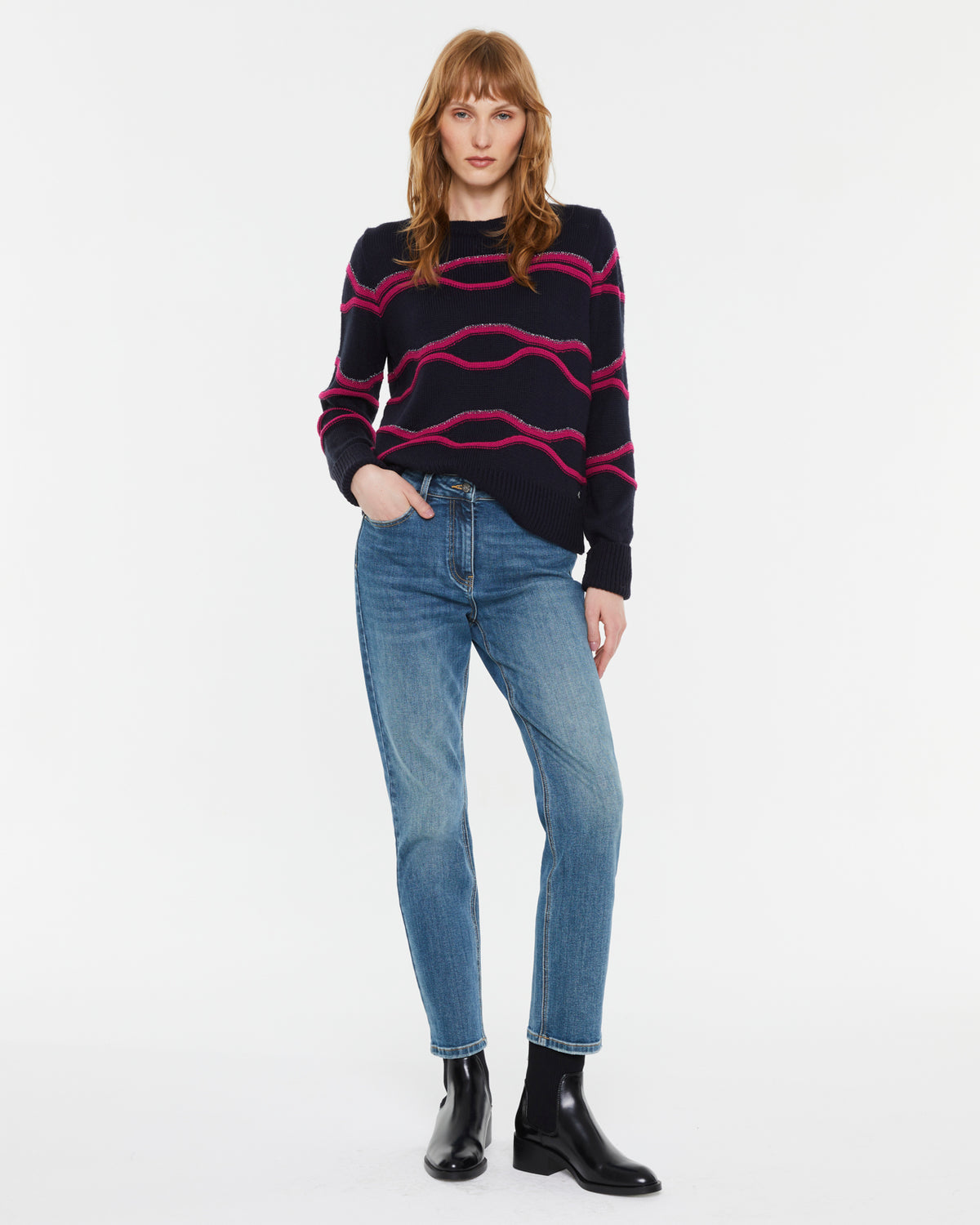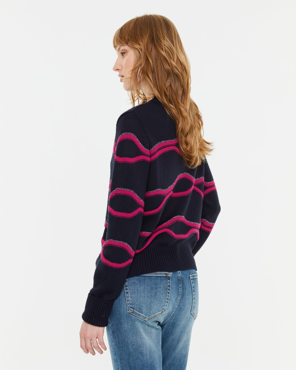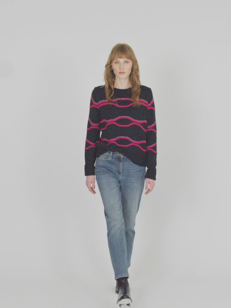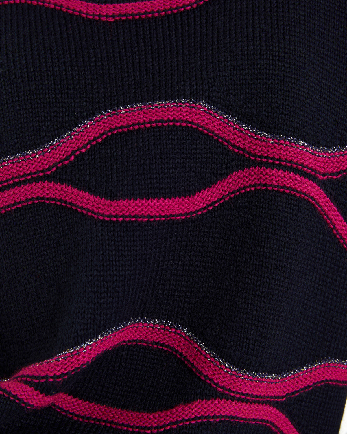 Rundhalspullover mit langen Ärmeln. Fuchsiafarbener Besatz mit silbernem Metallicfaden. Rippenbündchen an Halsausschnitt, Bündchen und Saum. Normale Passform.