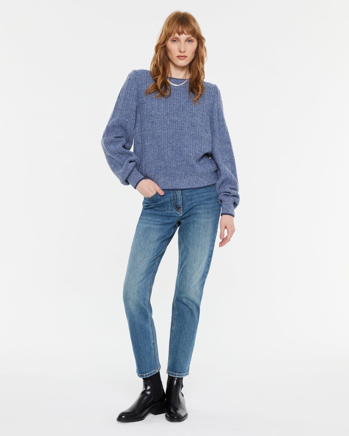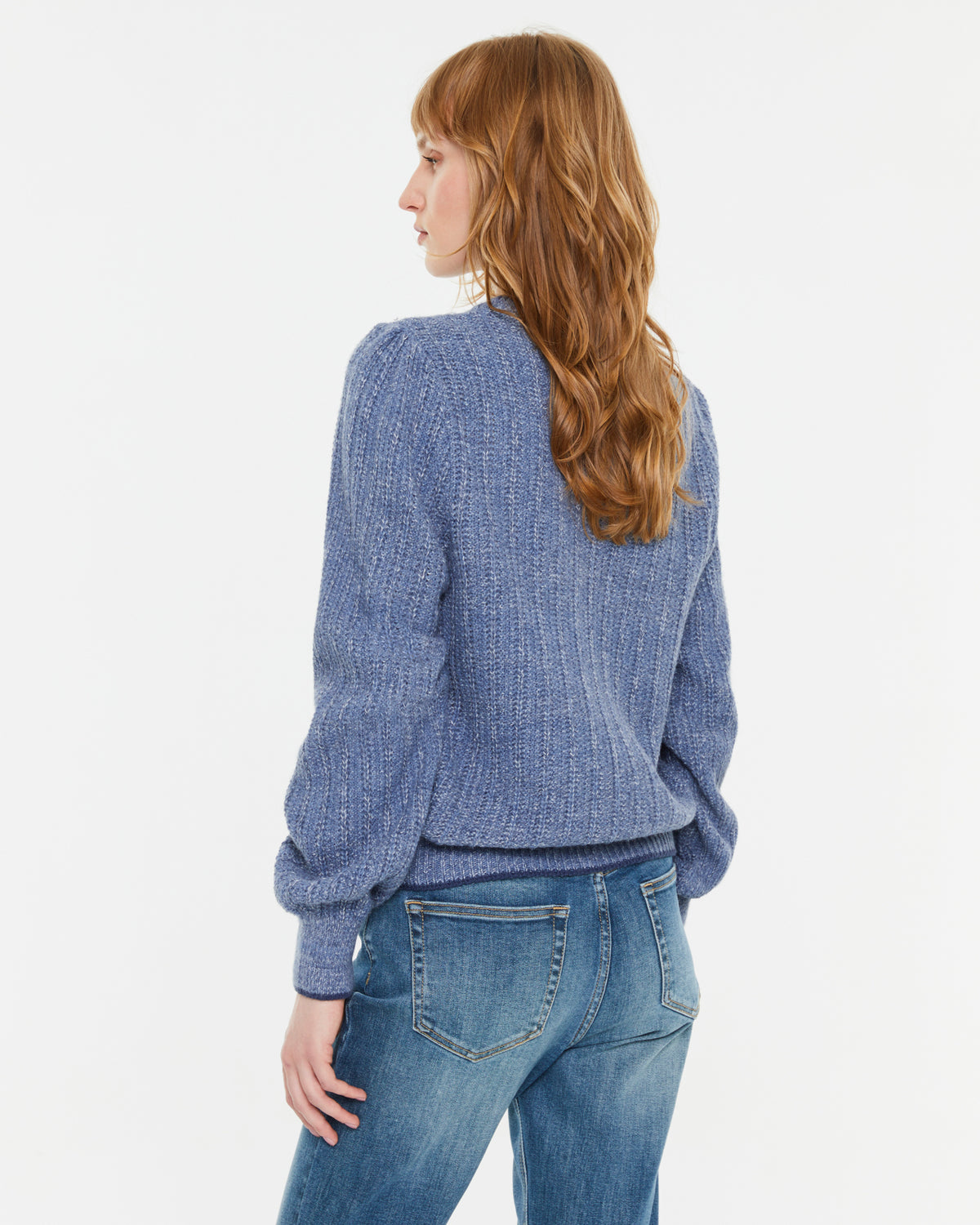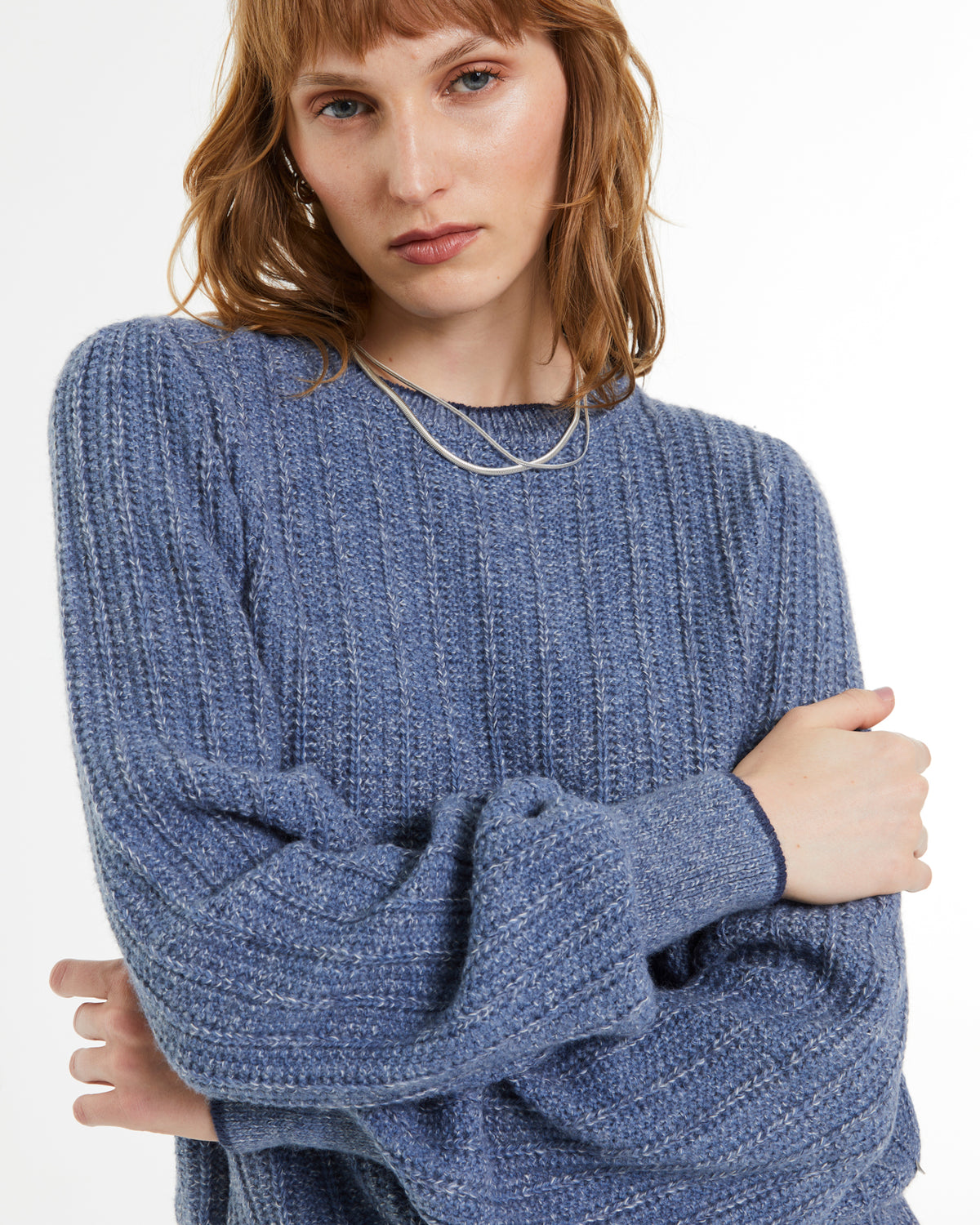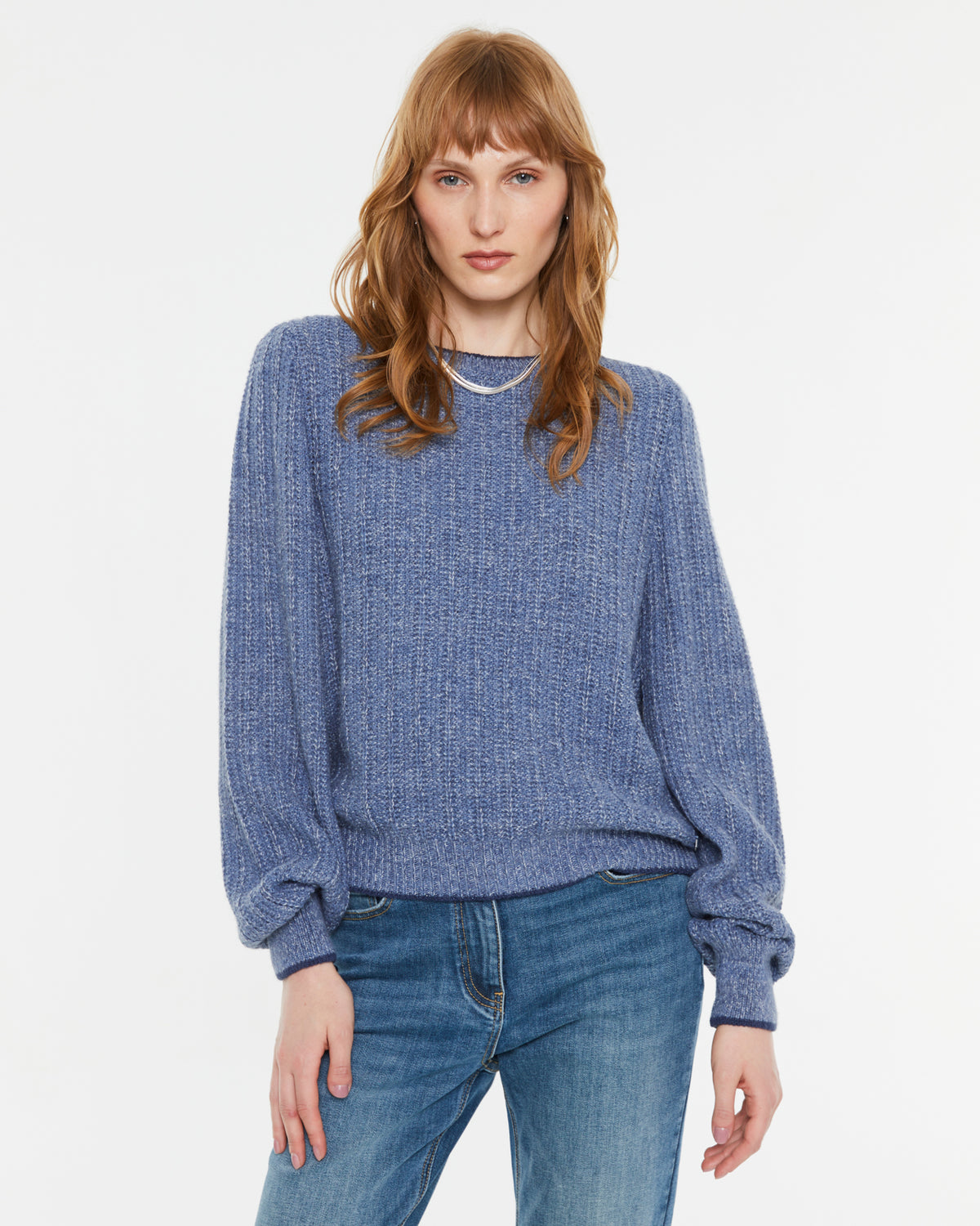 Rundhalspullover mit langen Ärmeln. Rippenbündchen an Halsausschnitt, Bündchen und Saum. Kleine Falten an den Schultern verleihen dem Kleidungsstück eine feminine Note und einen kontrastierenden Halsausschnitt. Normale Passform.