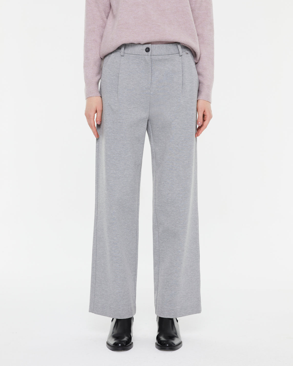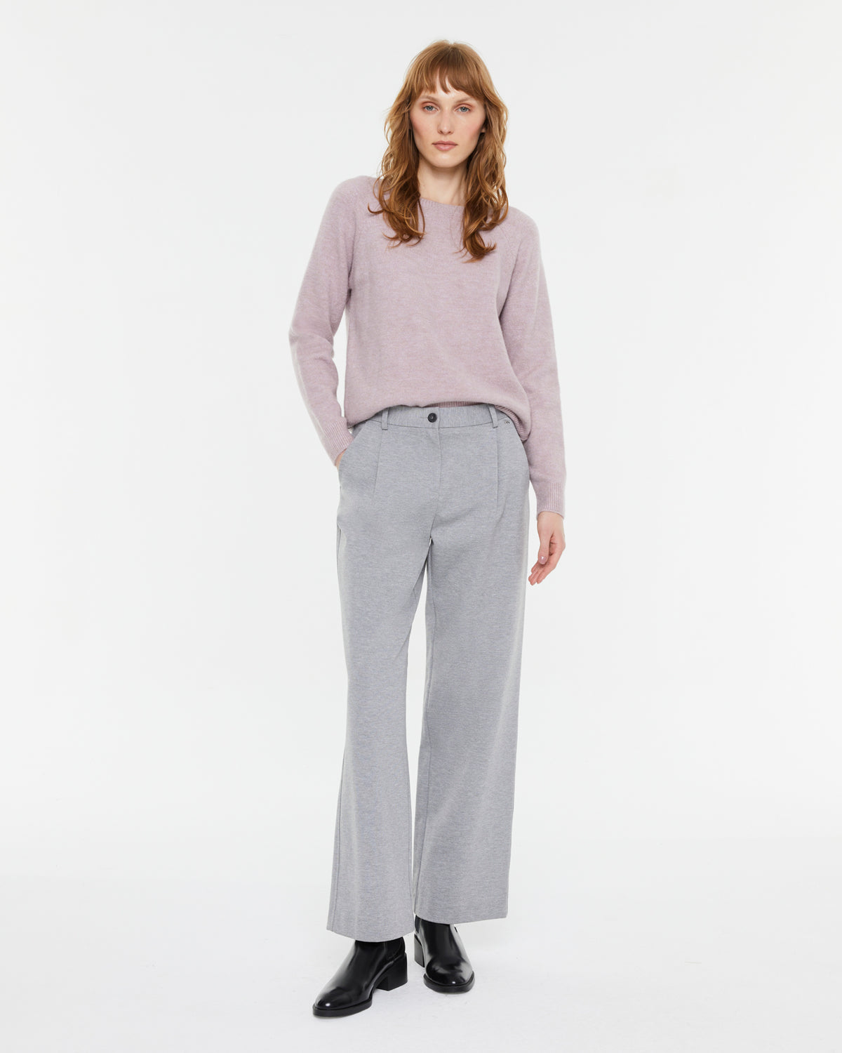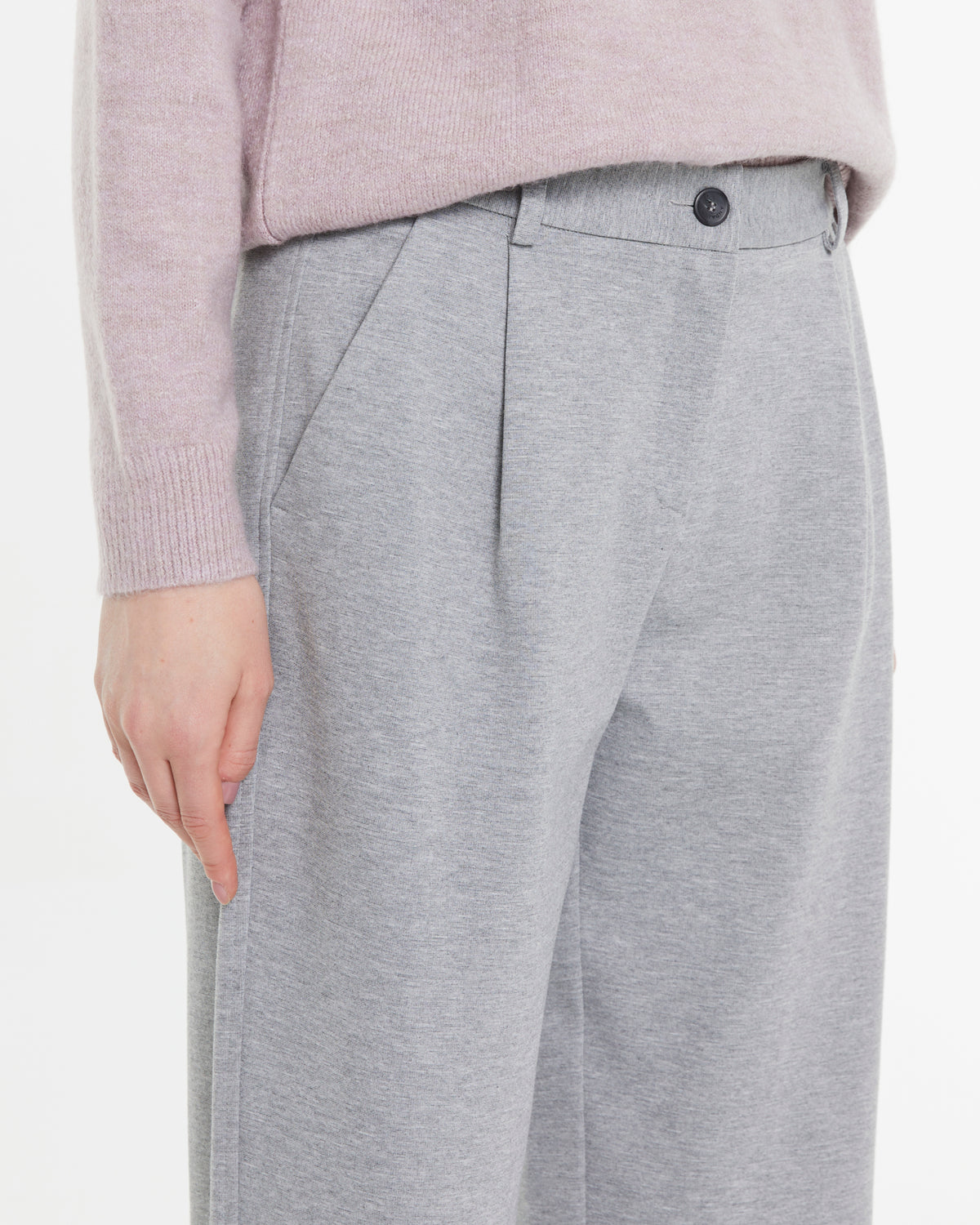 Weite, glatte Strickhose mit hoch taillierten Bundfalten. Seitentaschen. Knopf- und Reißverschluss. Sehr bequem und schmeichelhaft.