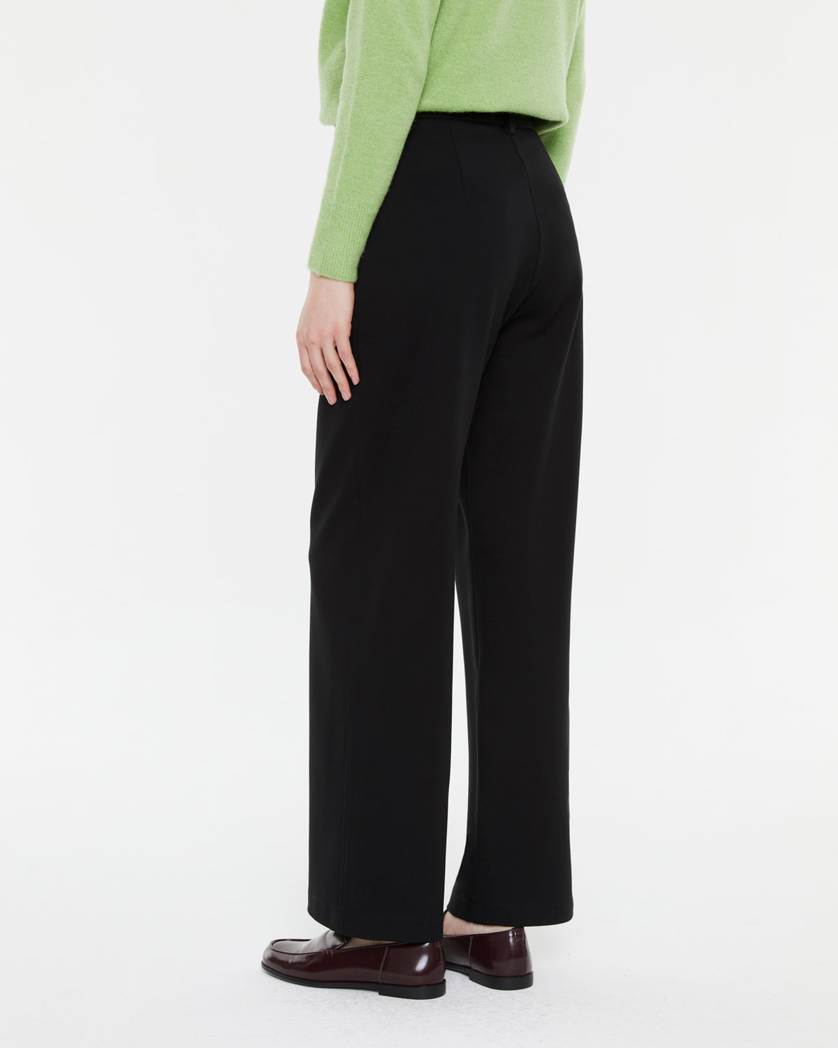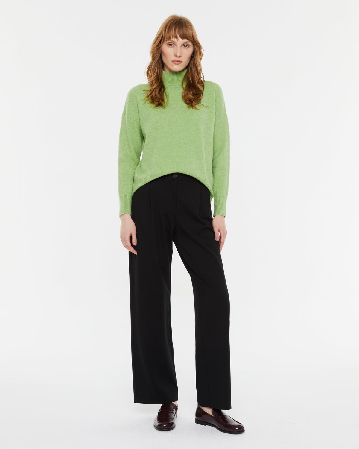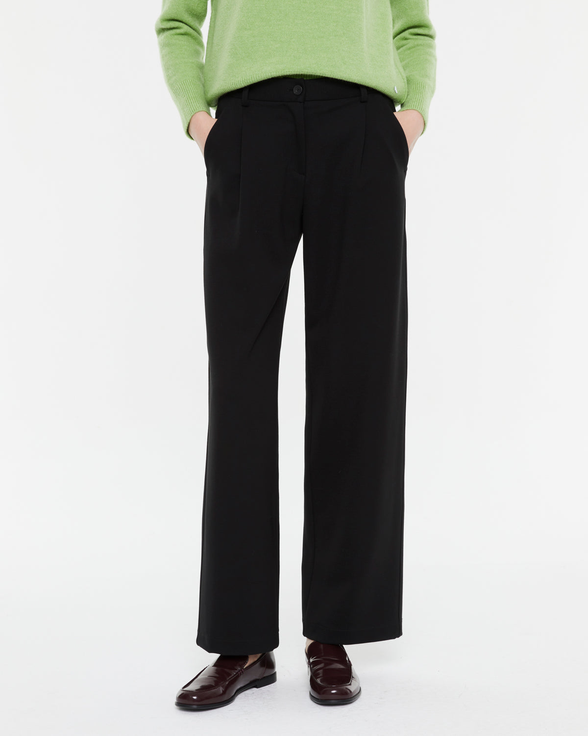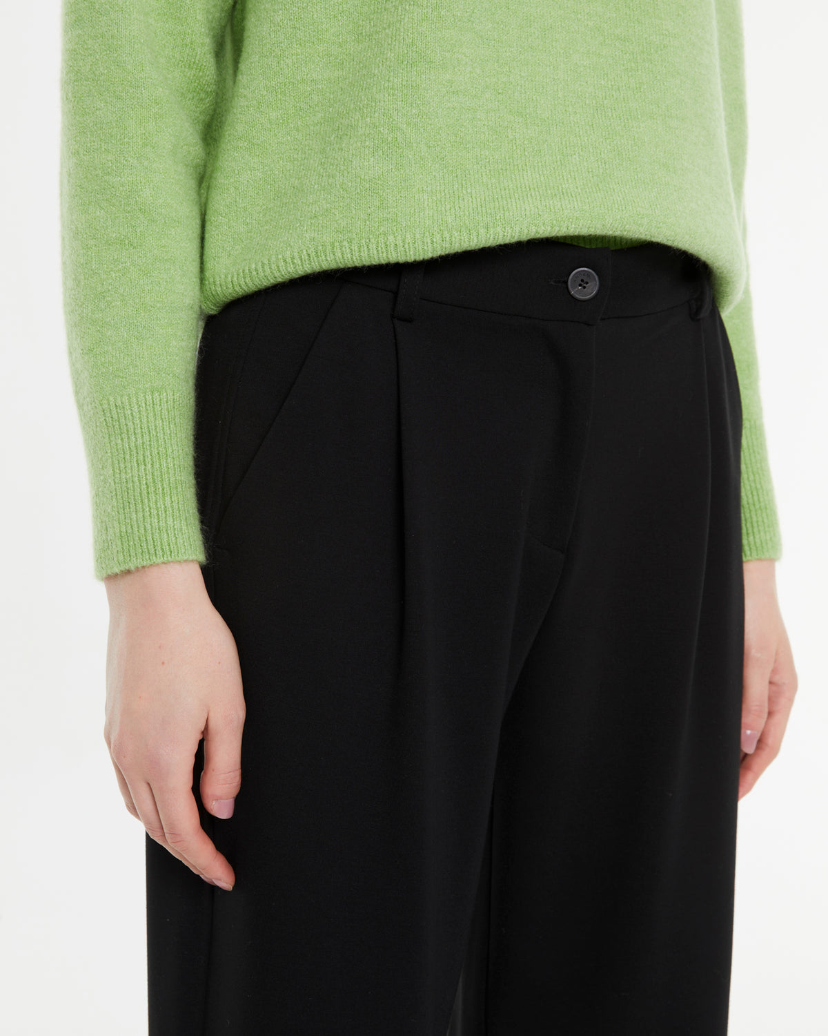 Weite, glatte Strickhose mit hoch taillierten Bundfalten. Seitentaschen. Knopf- und Reißverschluss. Sehr bequem und schmeichelhaft.
