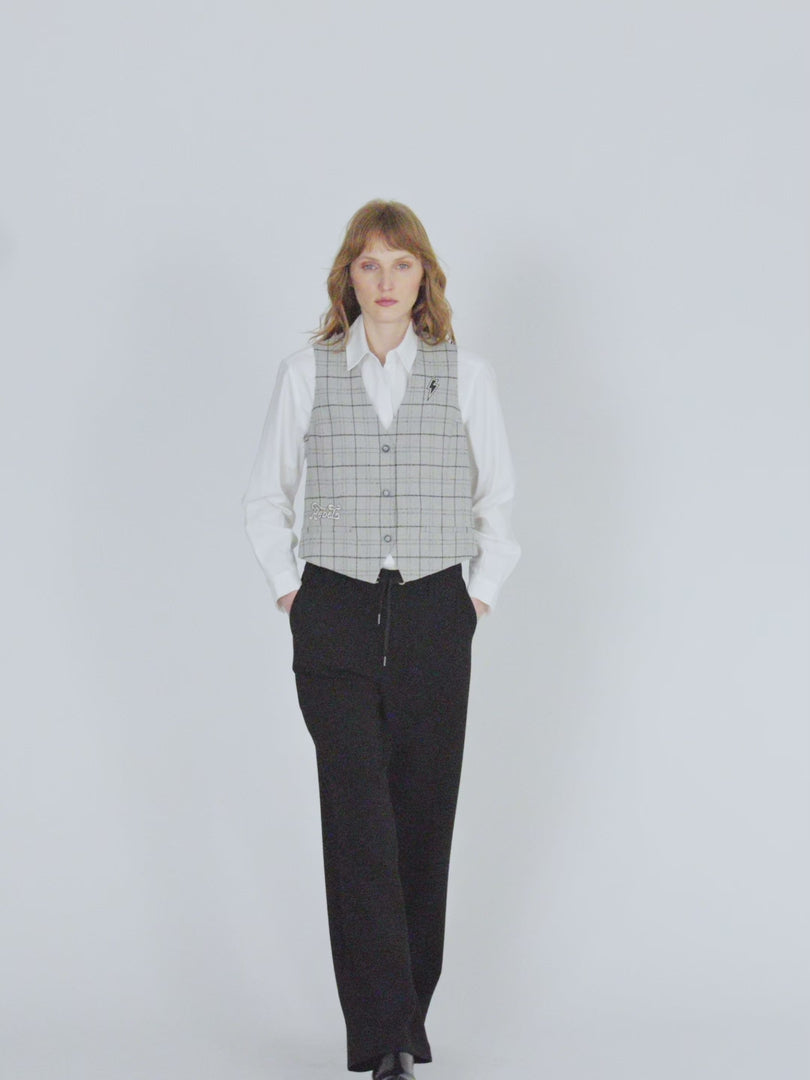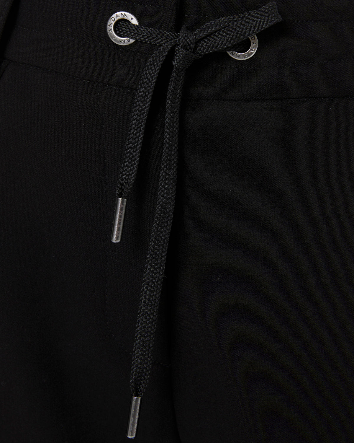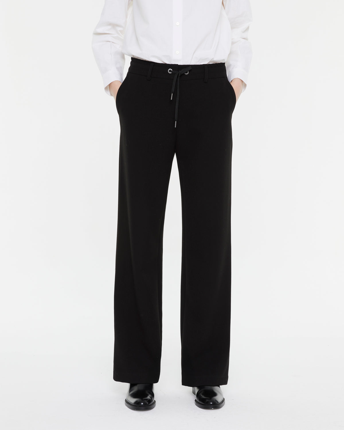 Fließende, hoch taillierte Hose mit weitem Bein, elastischem Bund, Haken- und Ösenverschluss aus Metall, Seitentaschen und verstellbarem Kordelzug. Diese Hose ist sehr bequem und vielseitig.