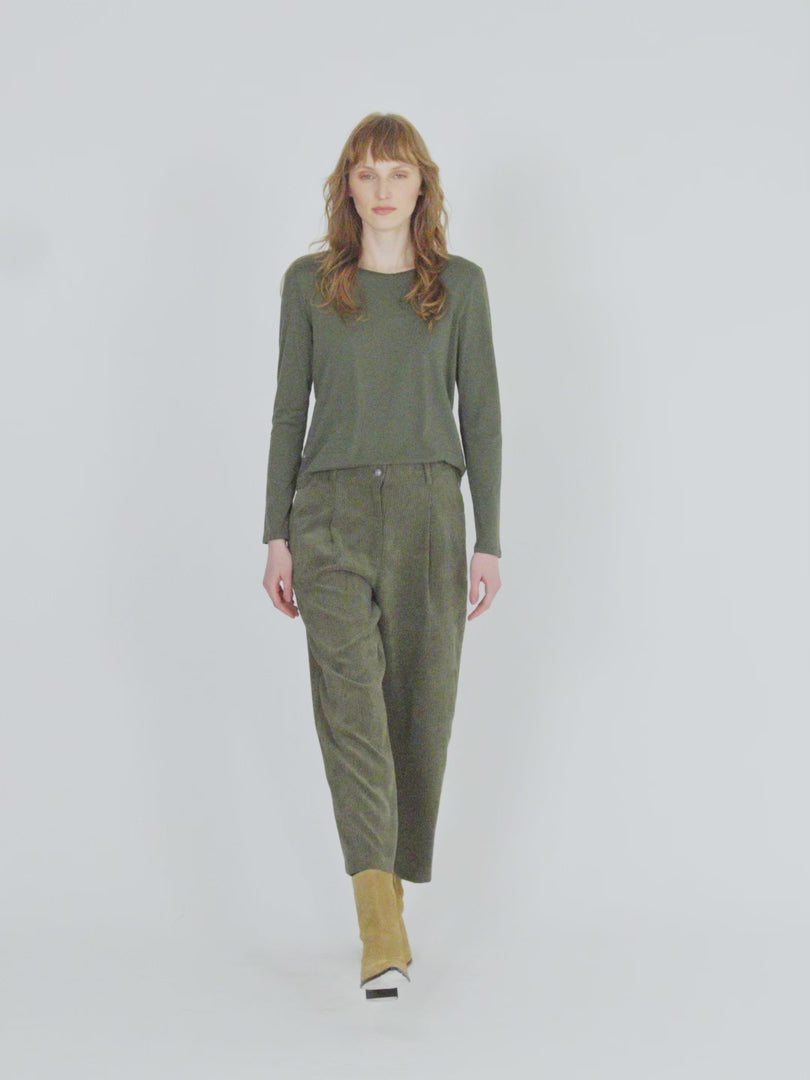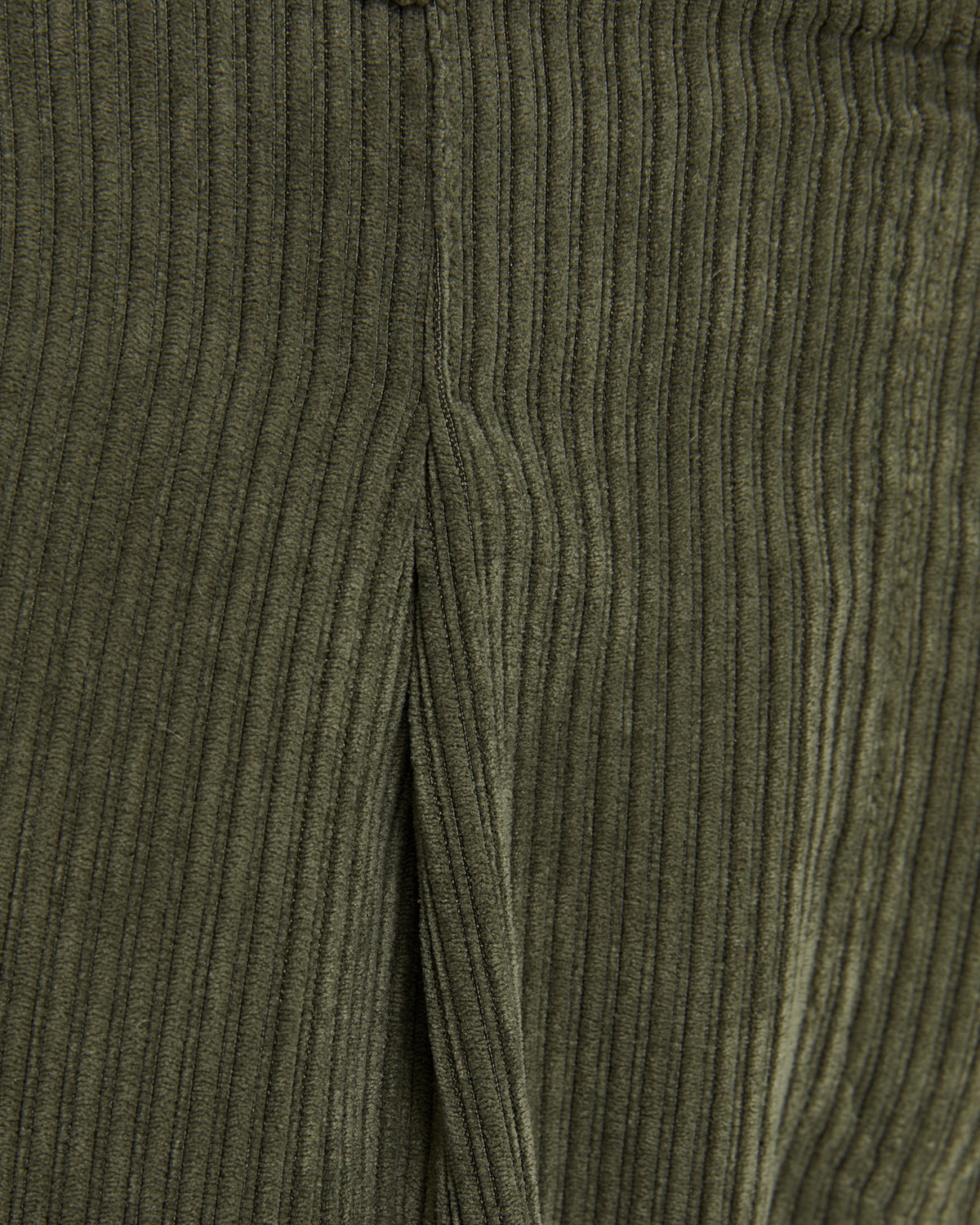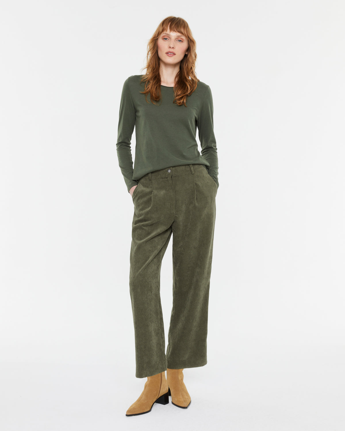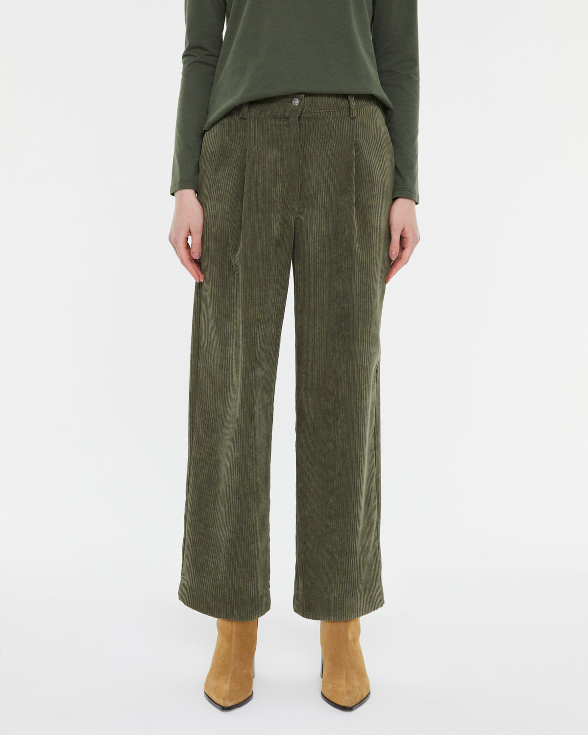 Knöchellange Cordhose mit weitem Bein, Bügelfalten, Seitentaschen und aufgesetzten Gesäßtaschen. Knopf- und Reißverschluss.