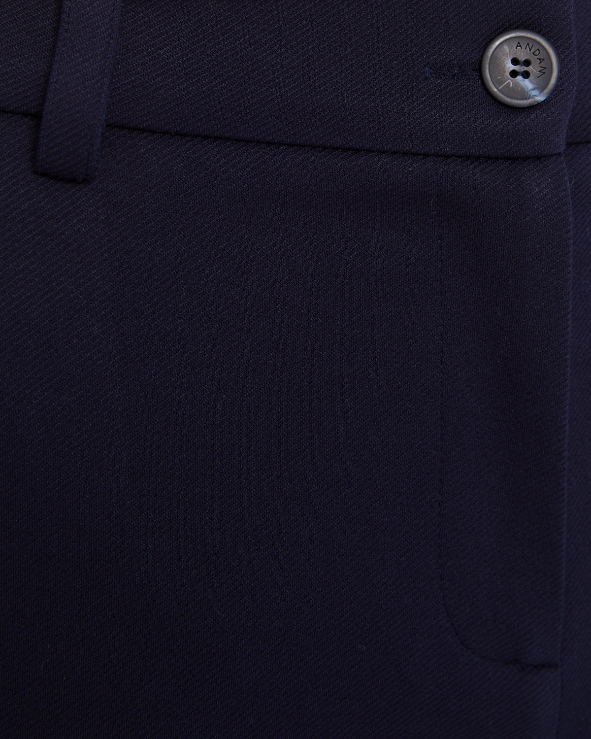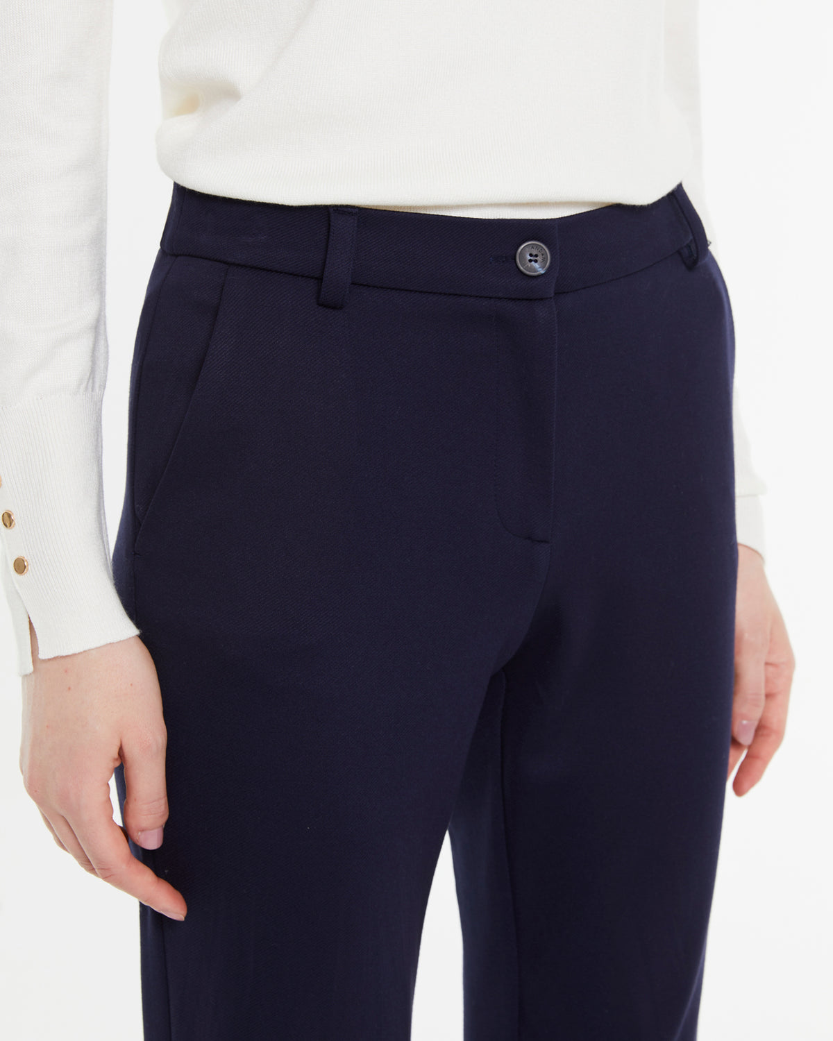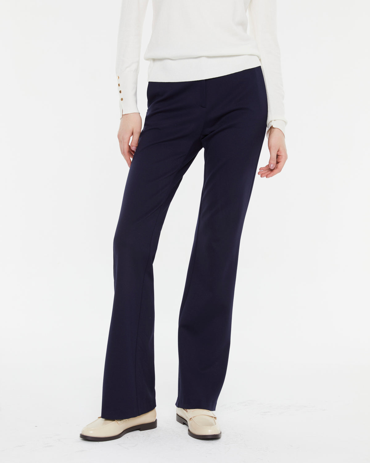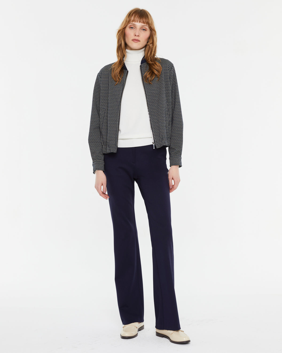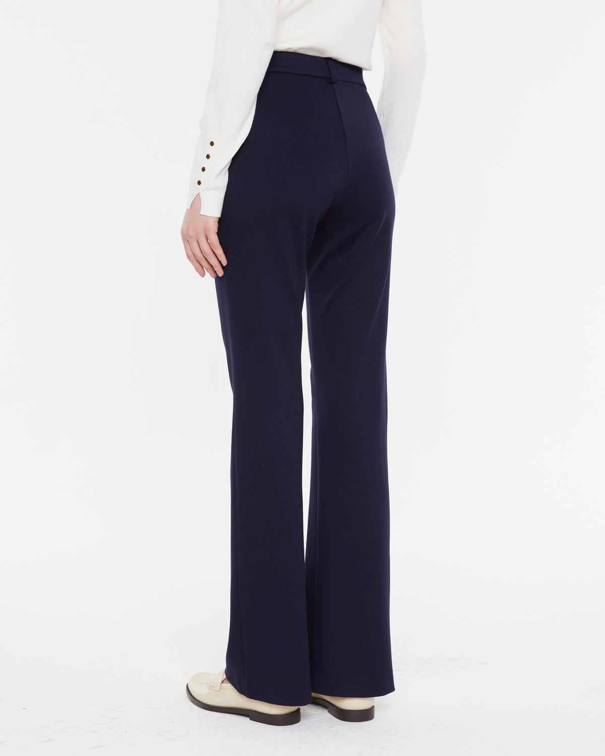 Schlaghose aus glattem Strick mit hoher Taille und elastischem Bund hinten. Knopf- und Reißverschluss. Seitentaschen. Diese Hose ist sehr bequem und vielseitig. Passend dazu finden Sie einen Blazer.