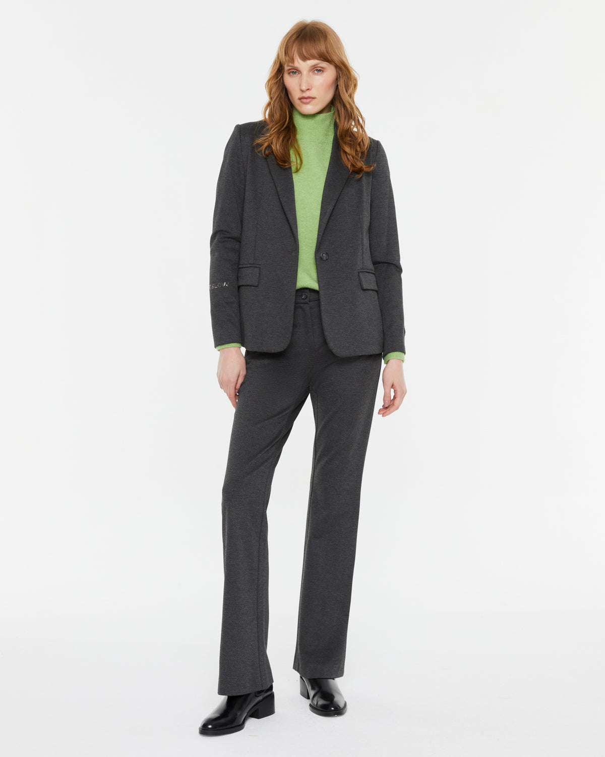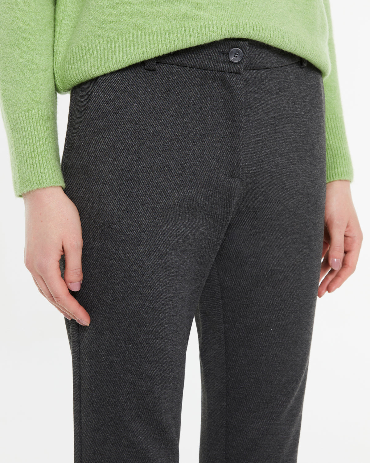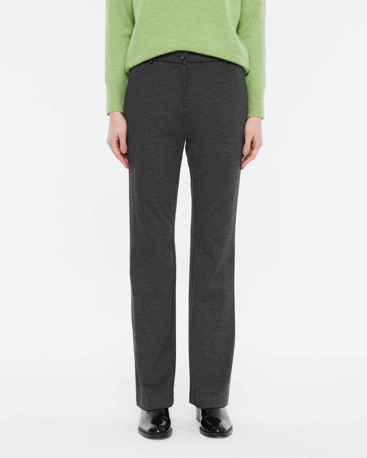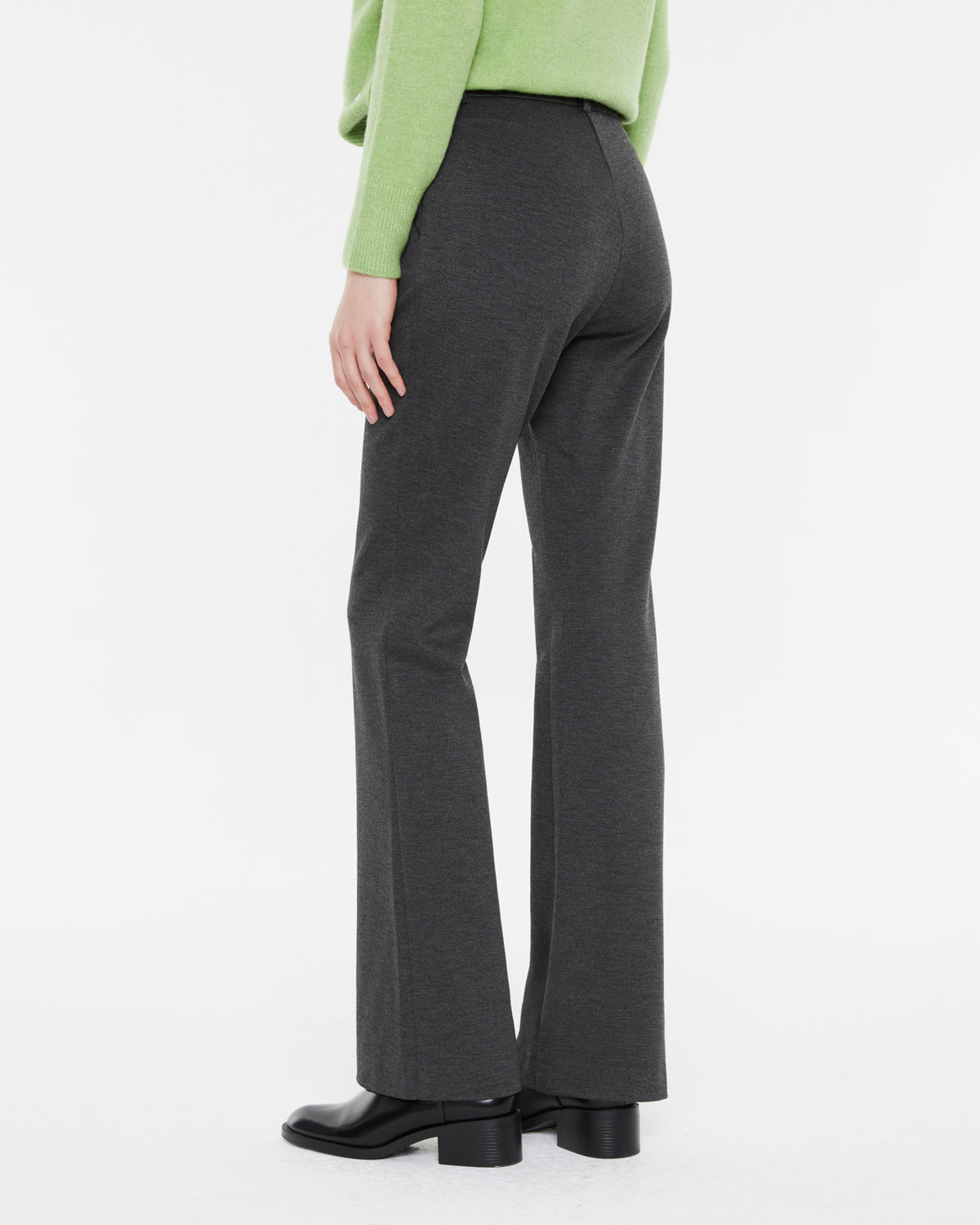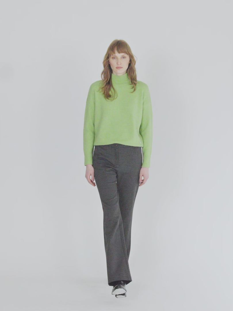 Schlaghose aus glattem Strick mit hoher Taille und elastischem Bund hinten. Knopf- und Reißverschluss. Seitentaschen. Diese Hose ist sehr bequem und vielseitig. Passend dazu finden Sie einen Blazer.