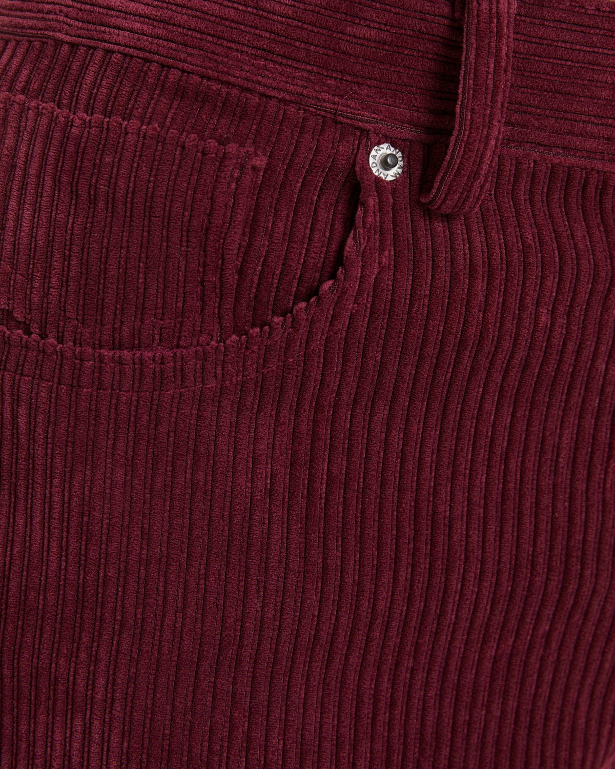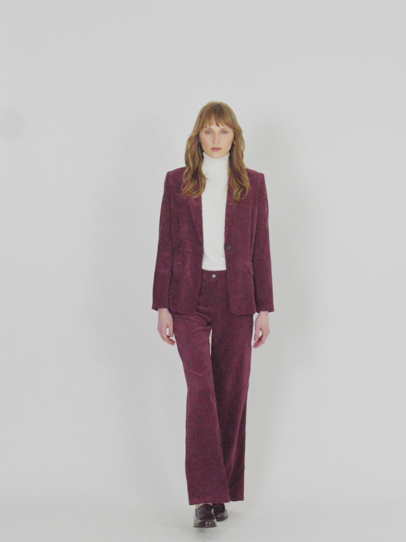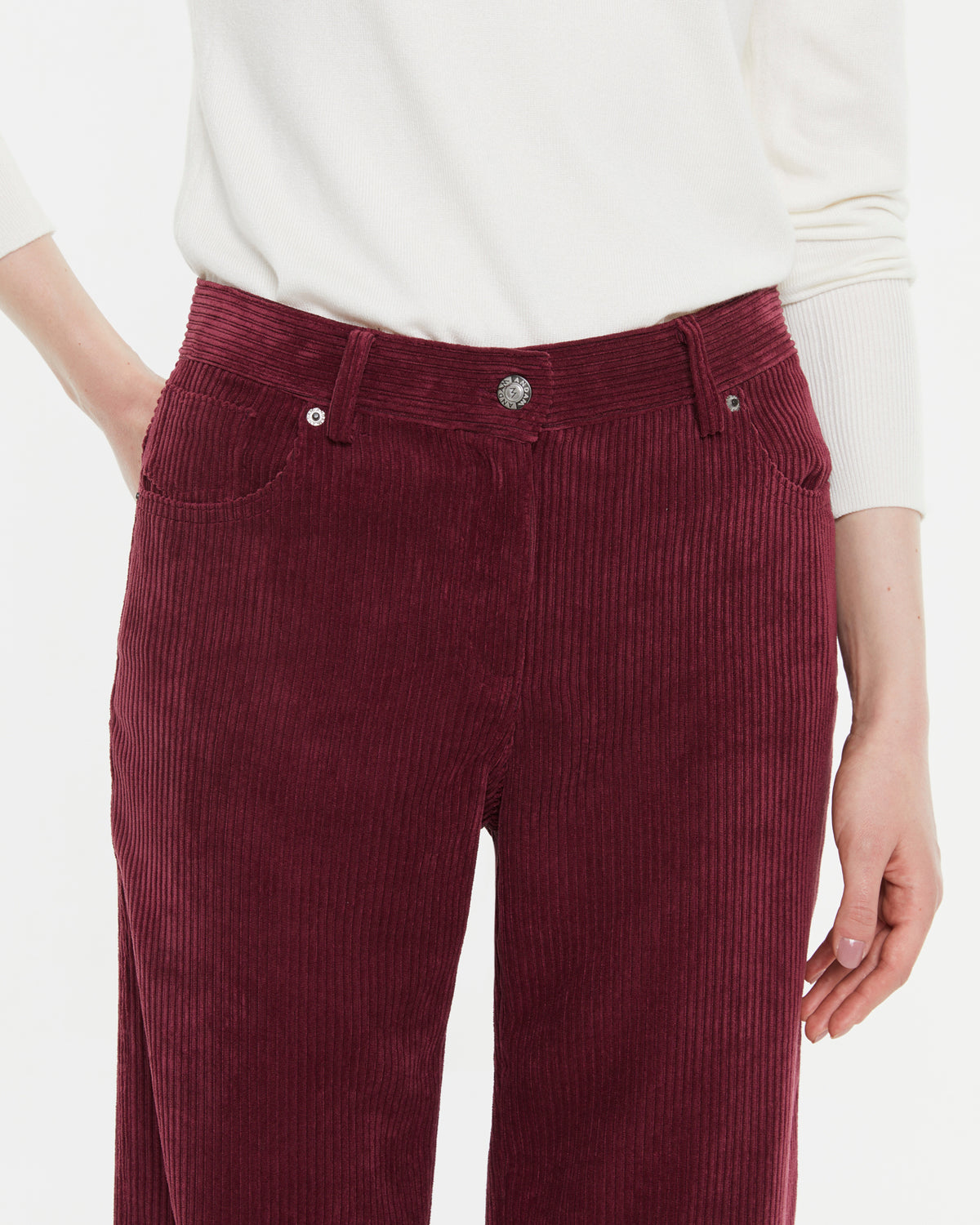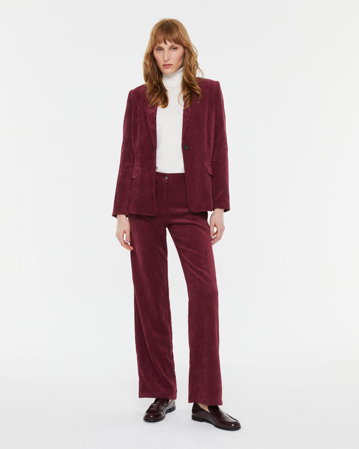 Cordhose mit hoher Taille, fünf Taschen und geradem Bein. Frontreißverschluss und Metallknopfverschluss. Passender Blazer erhältlich.