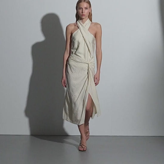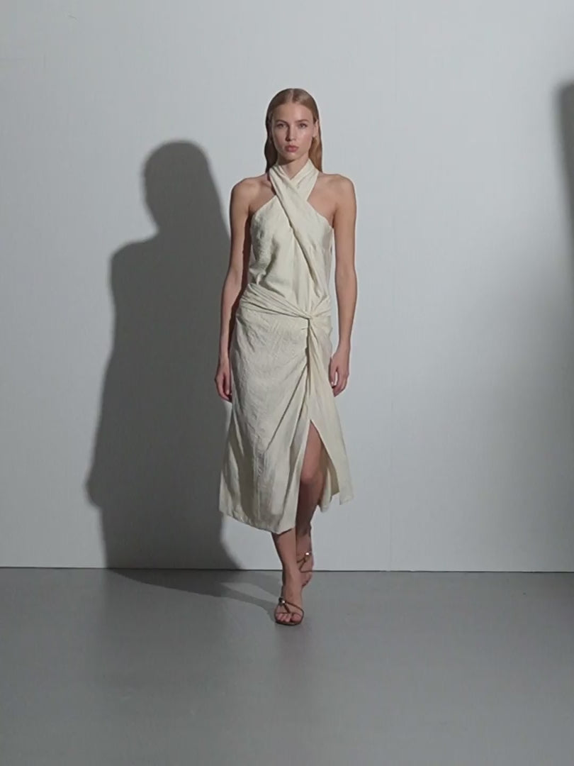 Top escote halter cruzado en delantero. Cierre lateral con cremallera invisible y cierre con dos botones en escote espalda. Es un top confeccionado en tejido estrapichato. Regular fit.
