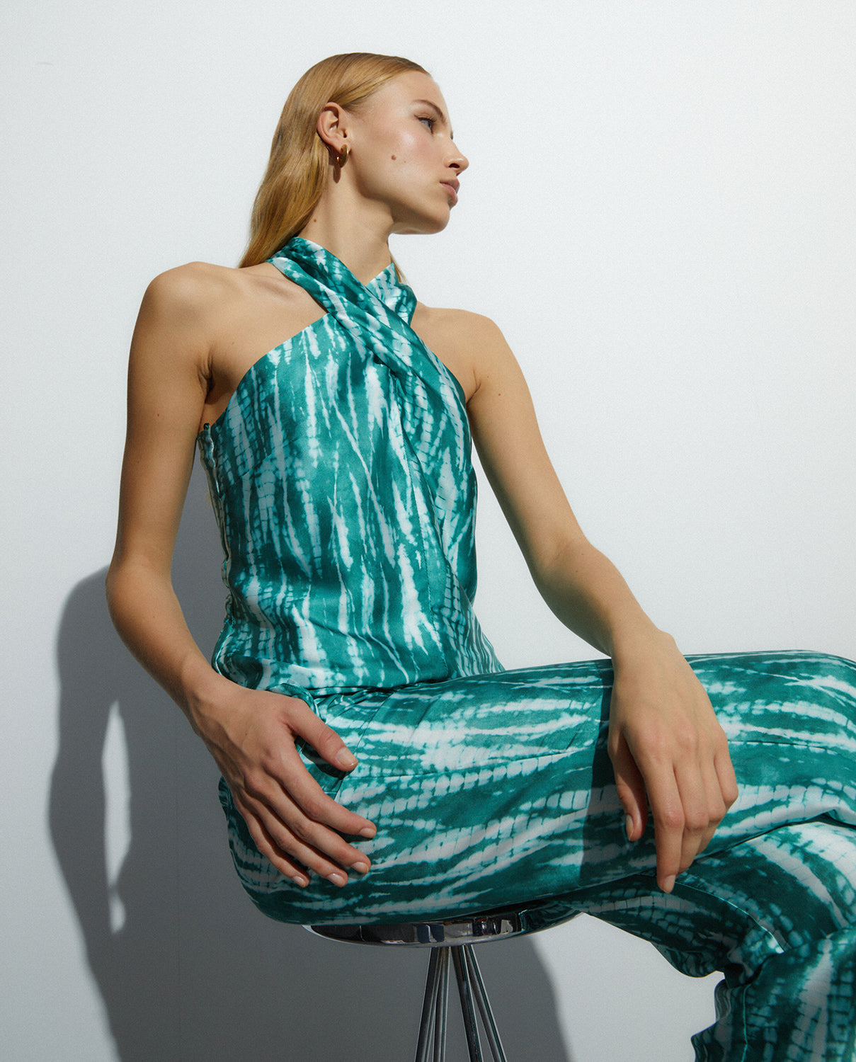 Top estampado de cuello halter cruzado en delantero. Cierre con cremallera invisible en lateral y cierre con dos botones en escote espalda. Puedes encontrar su pantalón a conjunto y crear un efecto mono muy femenino y elegante. Regular fit.