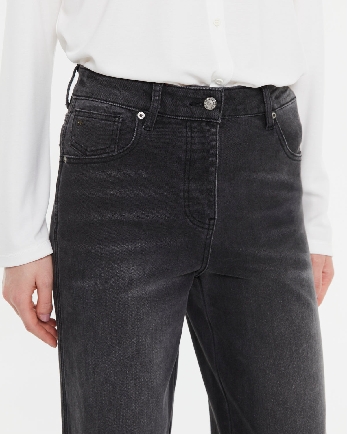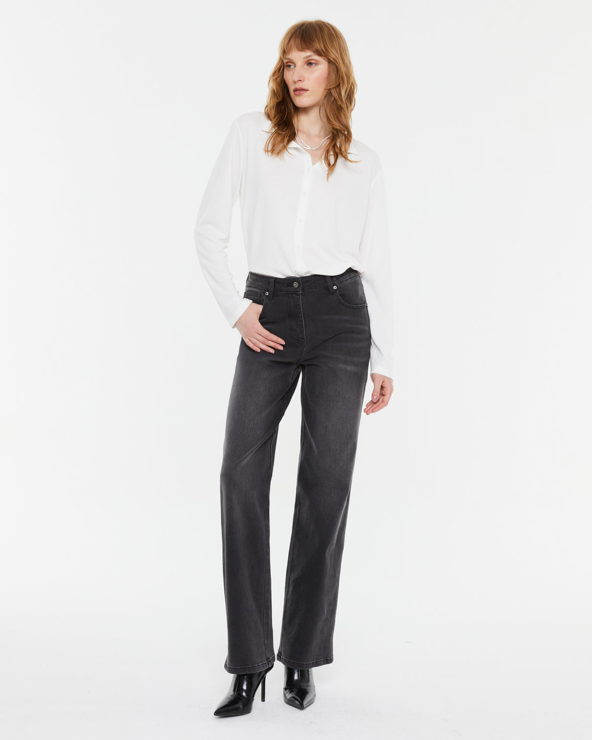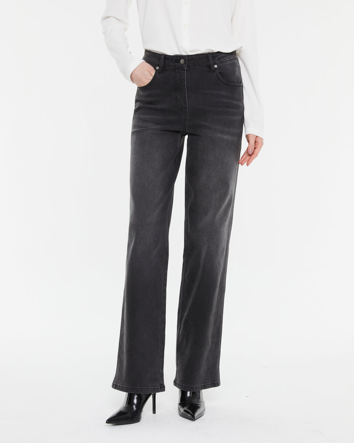 Hoch taillierte Jeans mit geradem Bein und fünf Taschen. Metallknopf und Reißverschluss. Diese Jeans ist sehr bequem und dehnbar.