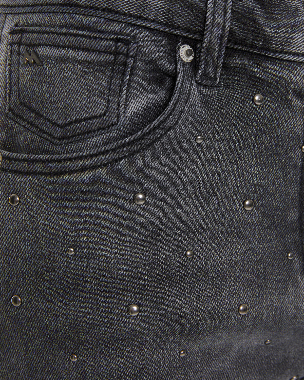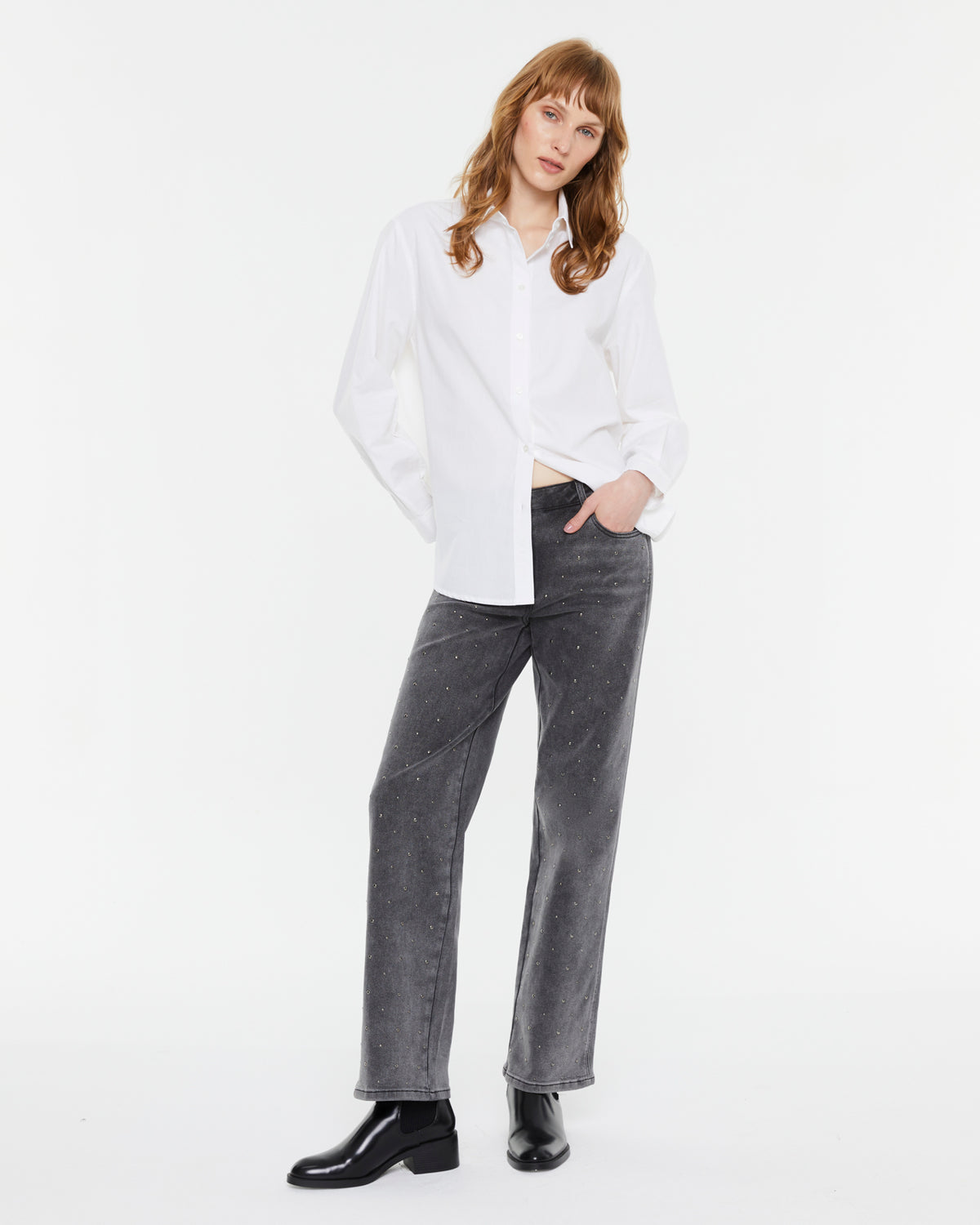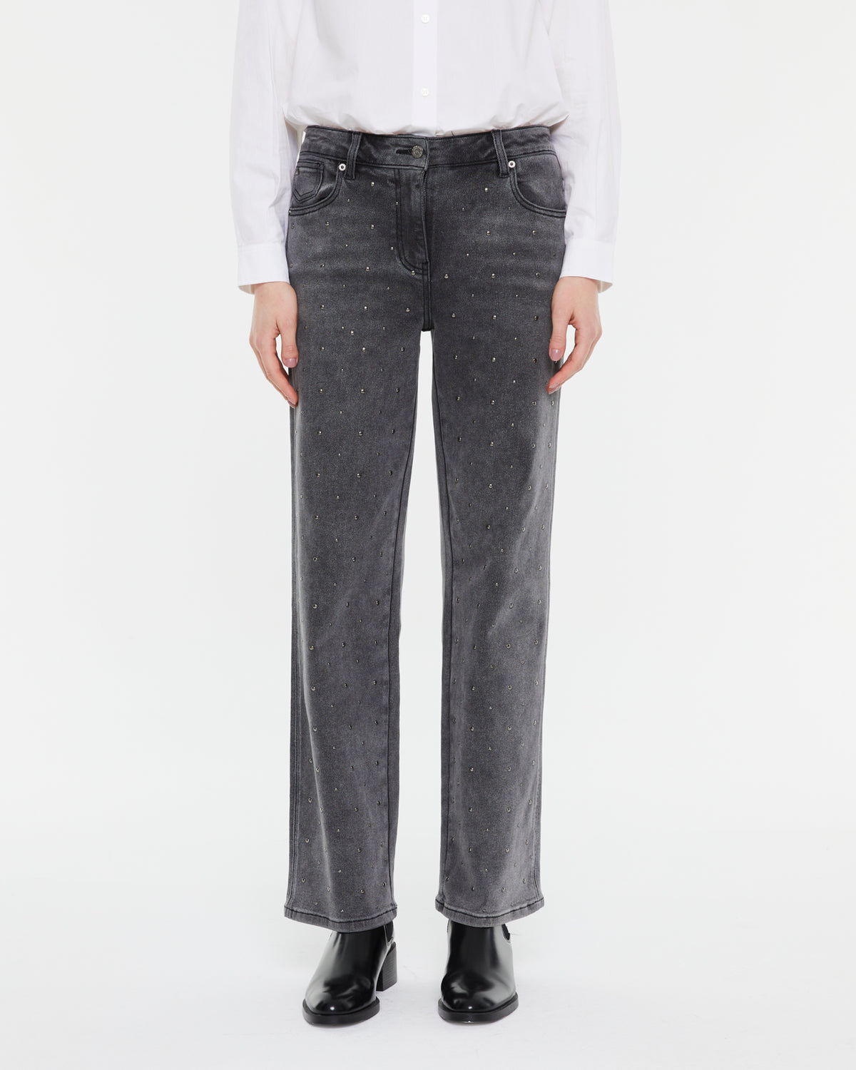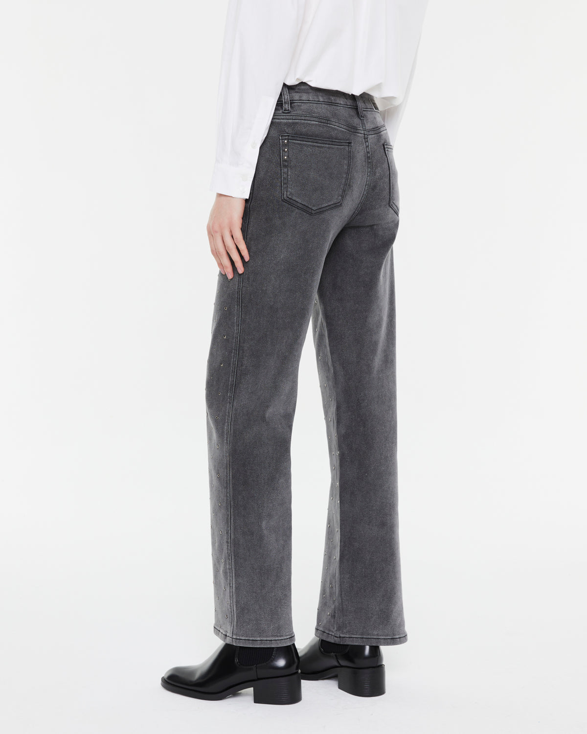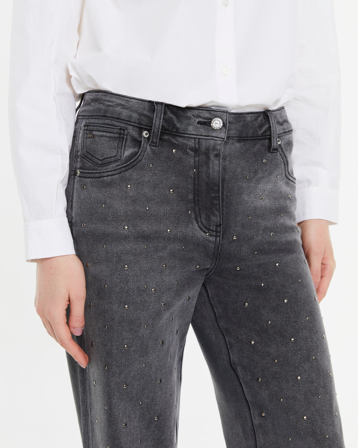 Hoch taillierte Jeans mit weitem Bein, fünf Taschen, Metallknopf und Reißverschluss. Mit Nietendetails auf der Vorderseite. Diese Jeans ist dehnbar und sehr bequem.