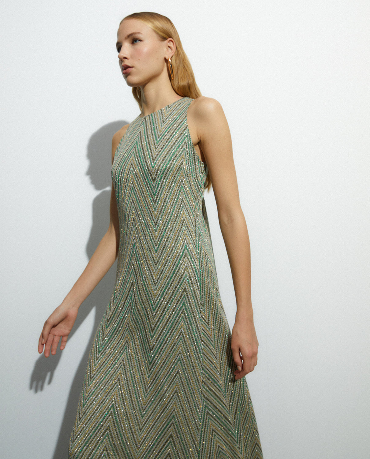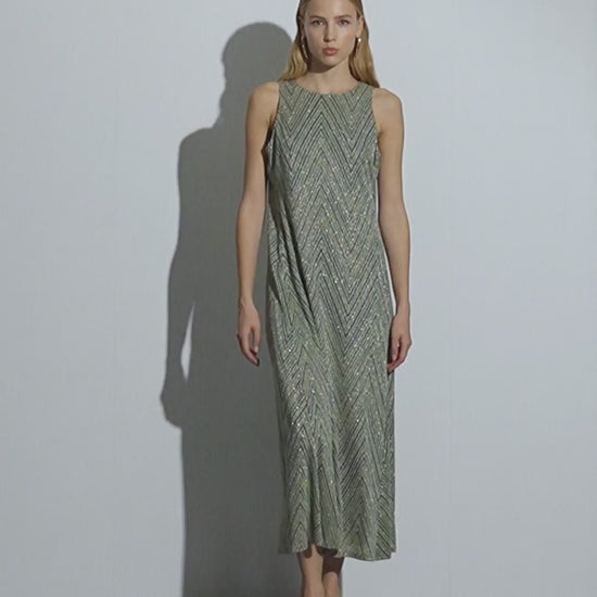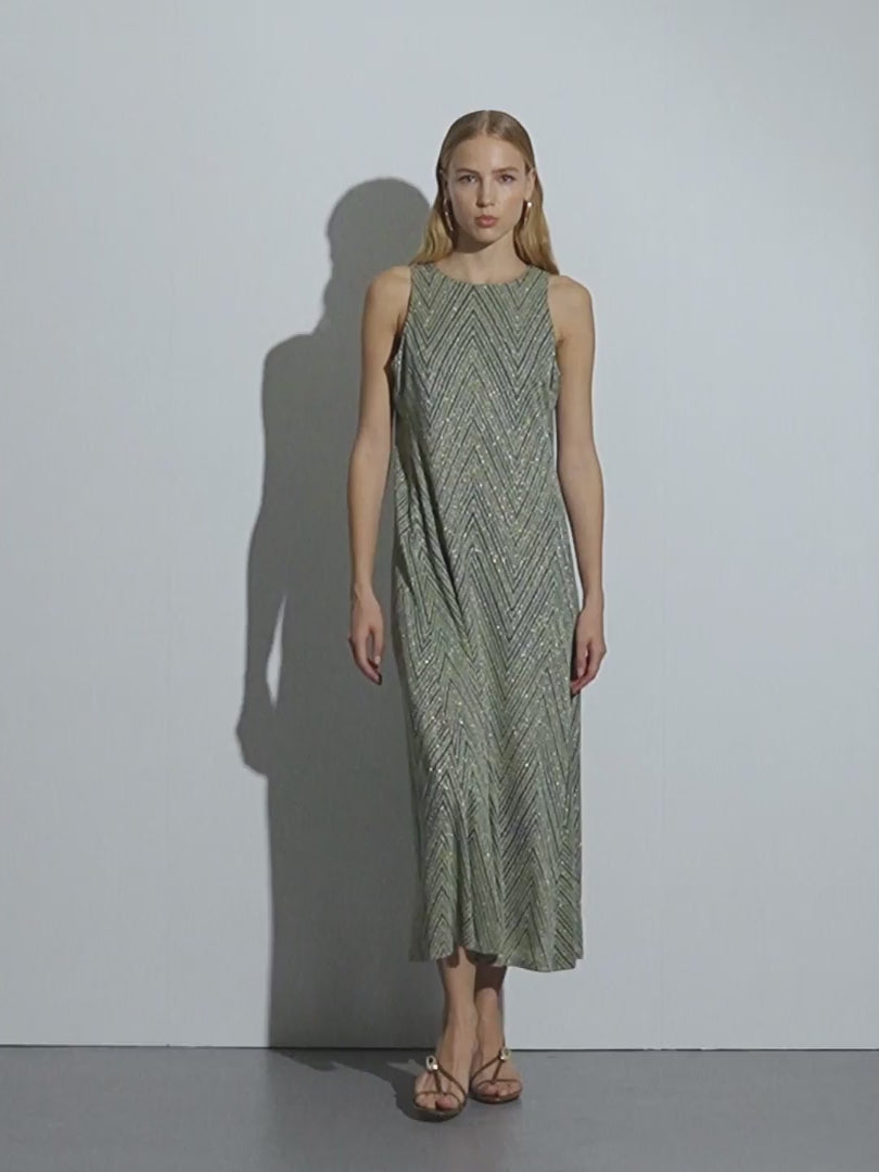 Vestido largo de punto estampado sin mangas y cuello redondo. Cierre con un botón en escote espalda. Vestido con costadillos en delantero y trasero lo que aporta que sea una prenda muy femenina y favorecedora a tu silueta. Regular fit.