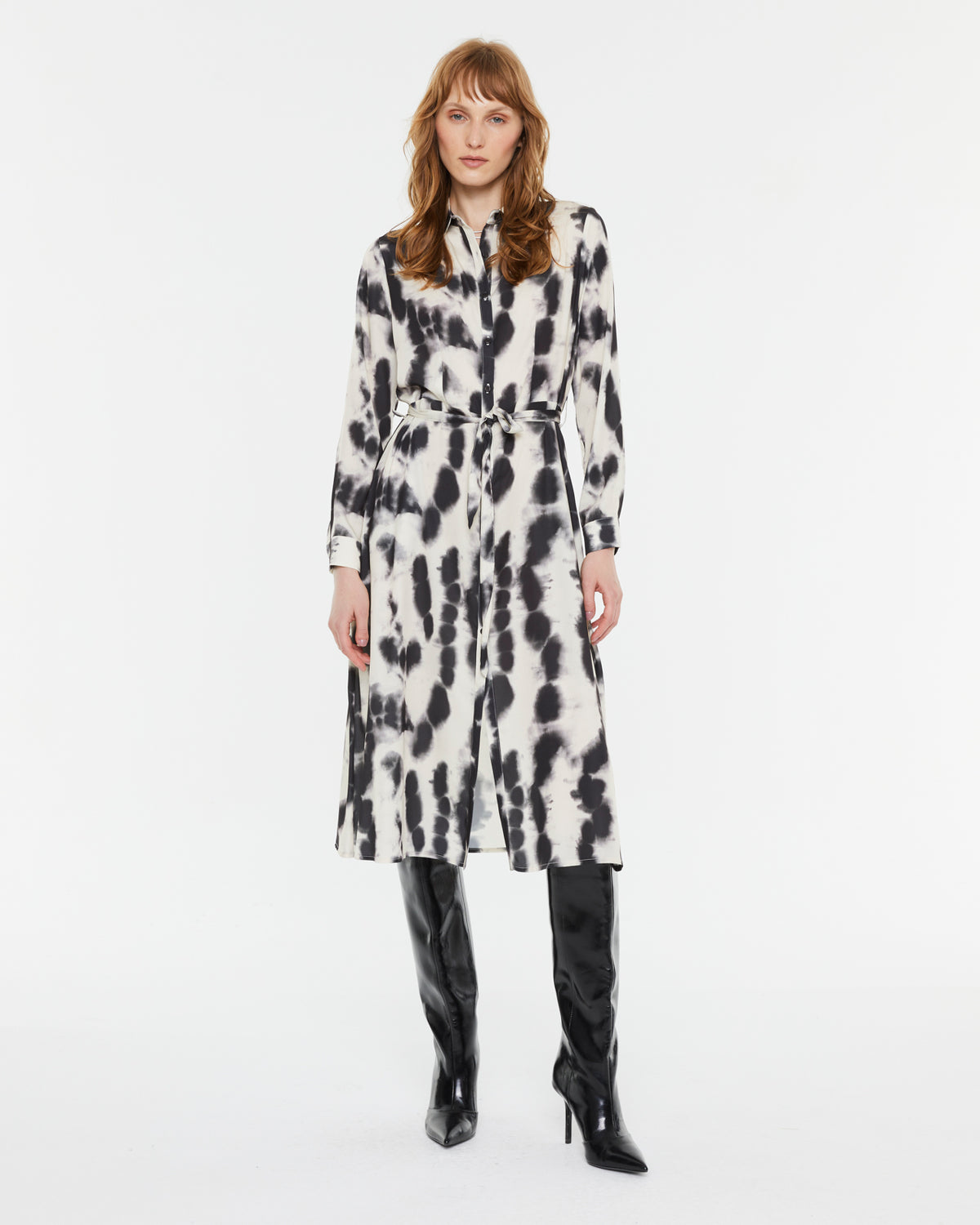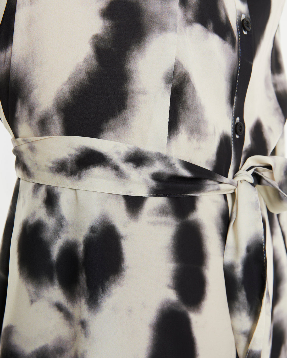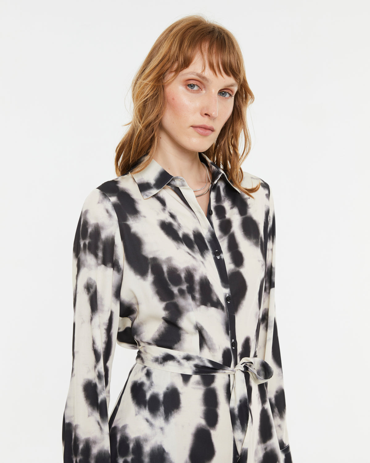 Langärmliges Hemdblusenkleid mit zweifarbigem Batik-Print. Knopfverschluss vorne. Seitentaschen und Schleife aus dem gleichen Stoff. Normale Passform.