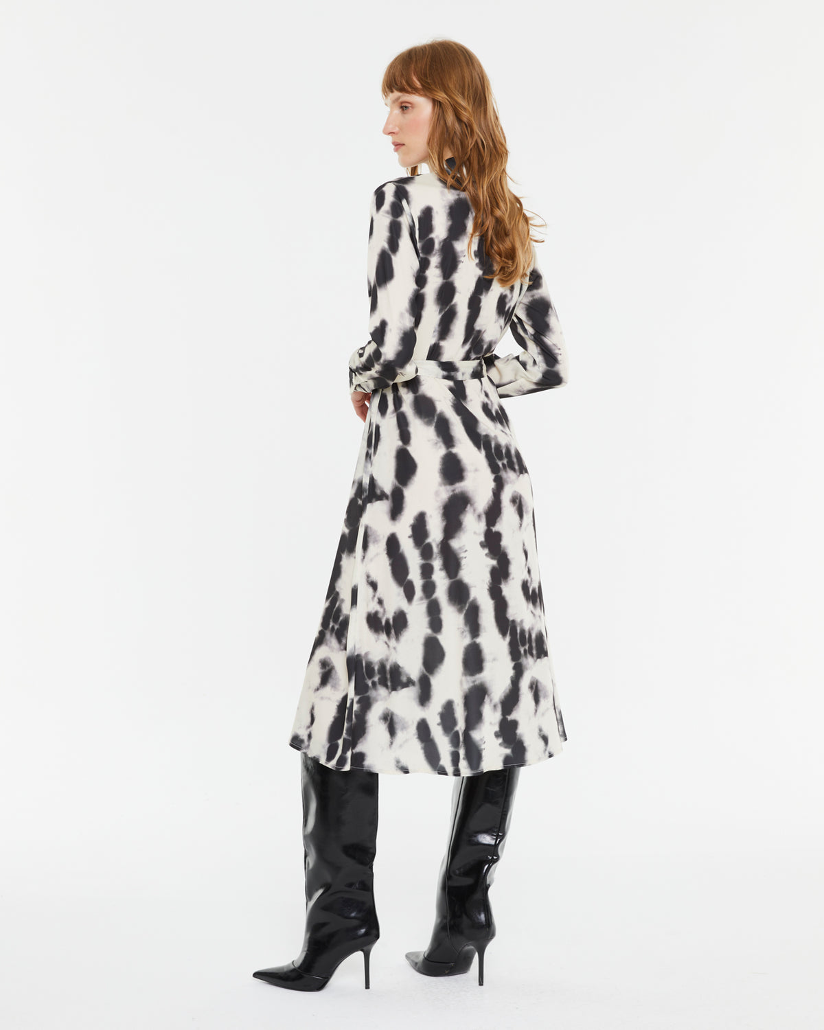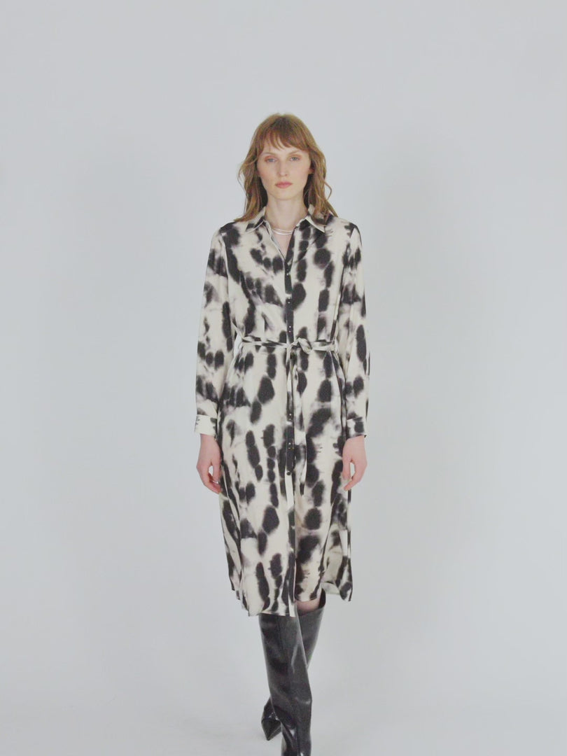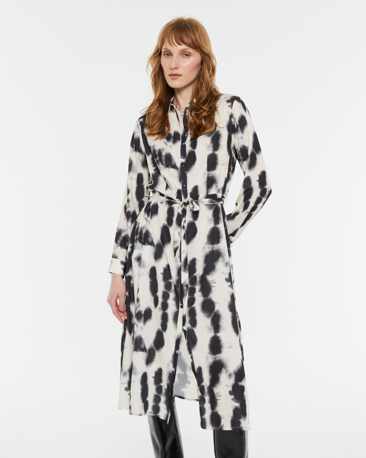 Langärmliges Hemdblusenkleid mit zweifarbigem Batik-Print. Knopfverschluss vorne. Seitentaschen und Schleife aus dem gleichen Stoff. Normale Passform.