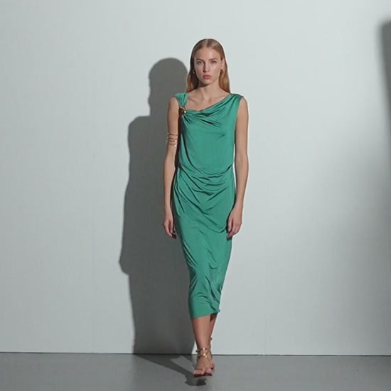 Vestido en punto liso satinado sin mangas y cuello drapeado recogido en lateral derecho con un aplique en dorado. Arrugado en costuras laterales altura cintura lo que le hace que sea un vestido muy femenino y favorecedor. Vestido forrado. Regular fit.