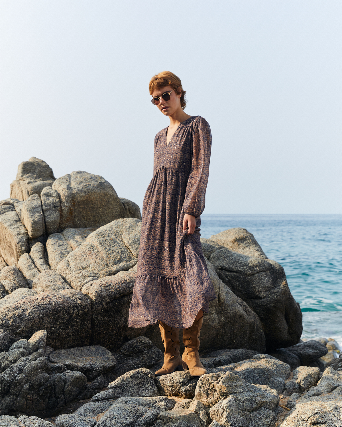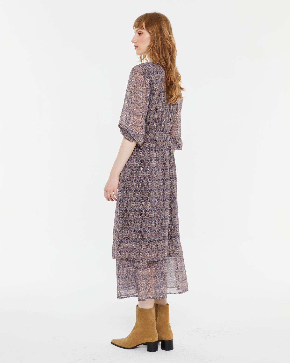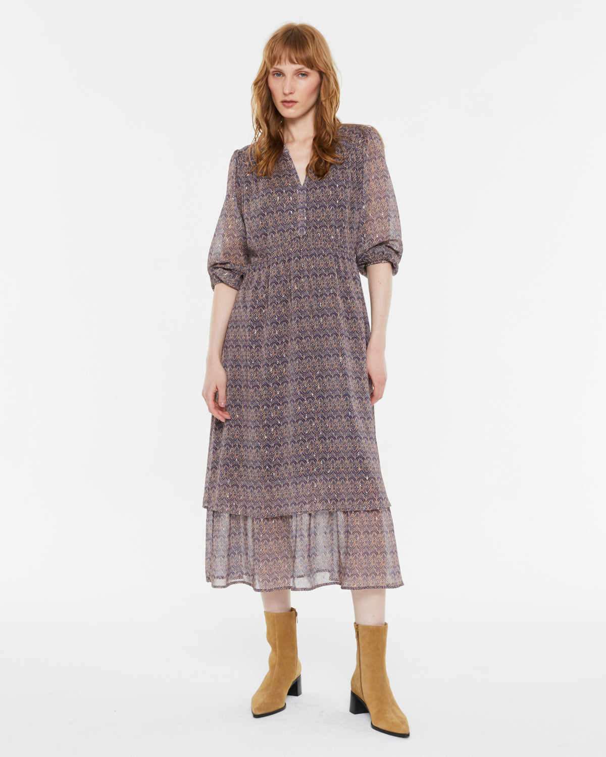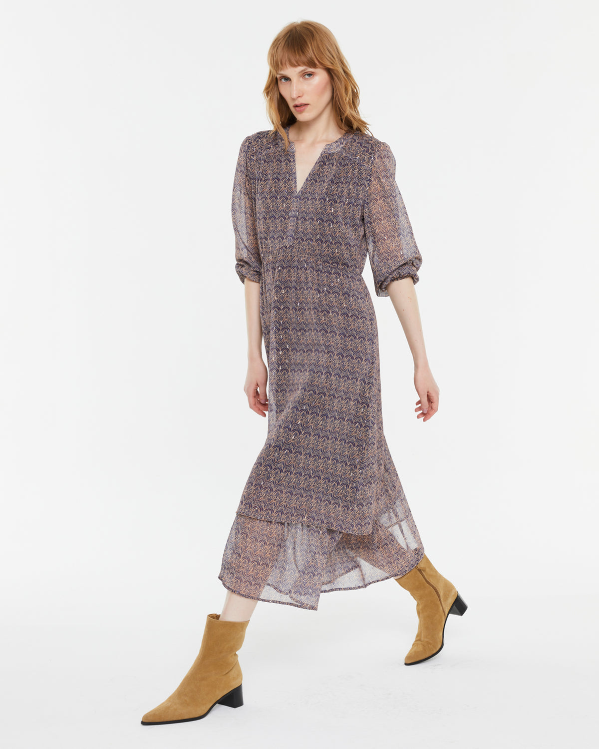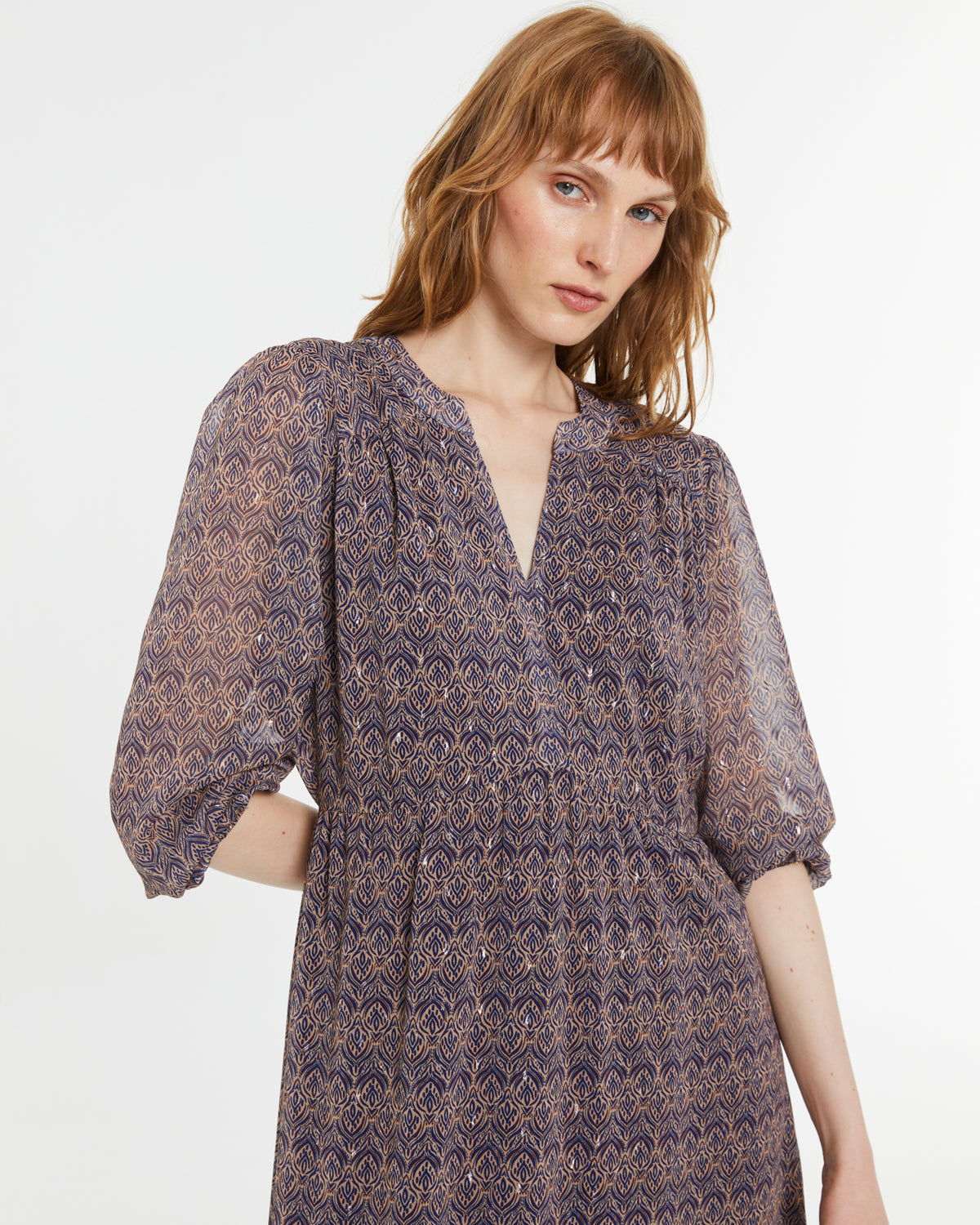 Bedrucktes Kleid mit V-Ausschnitt, langen, leicht gepufften Ärmeln und Rüschen am Saum. Elastischer Bund. Gefüttert.