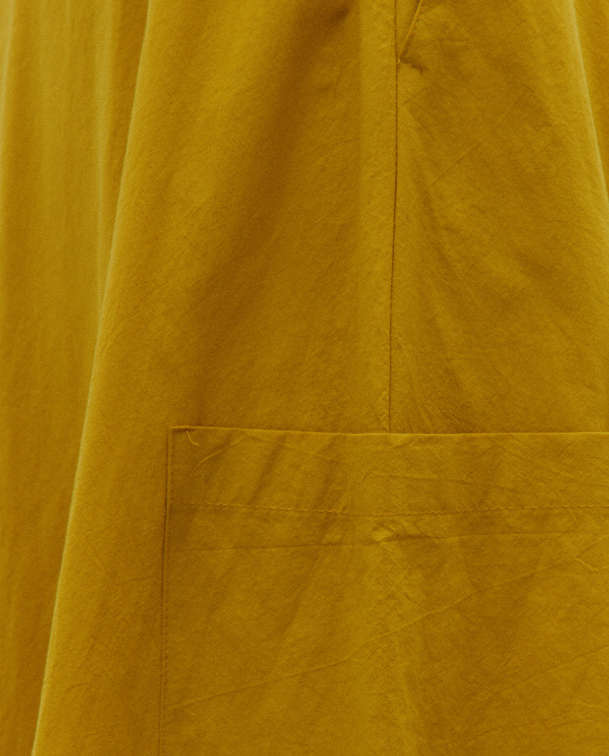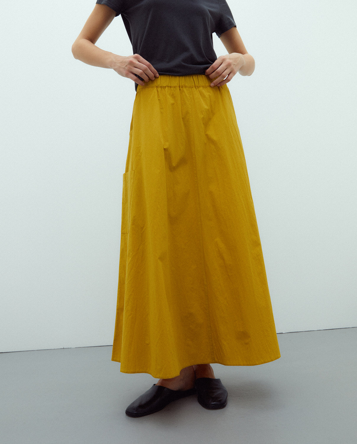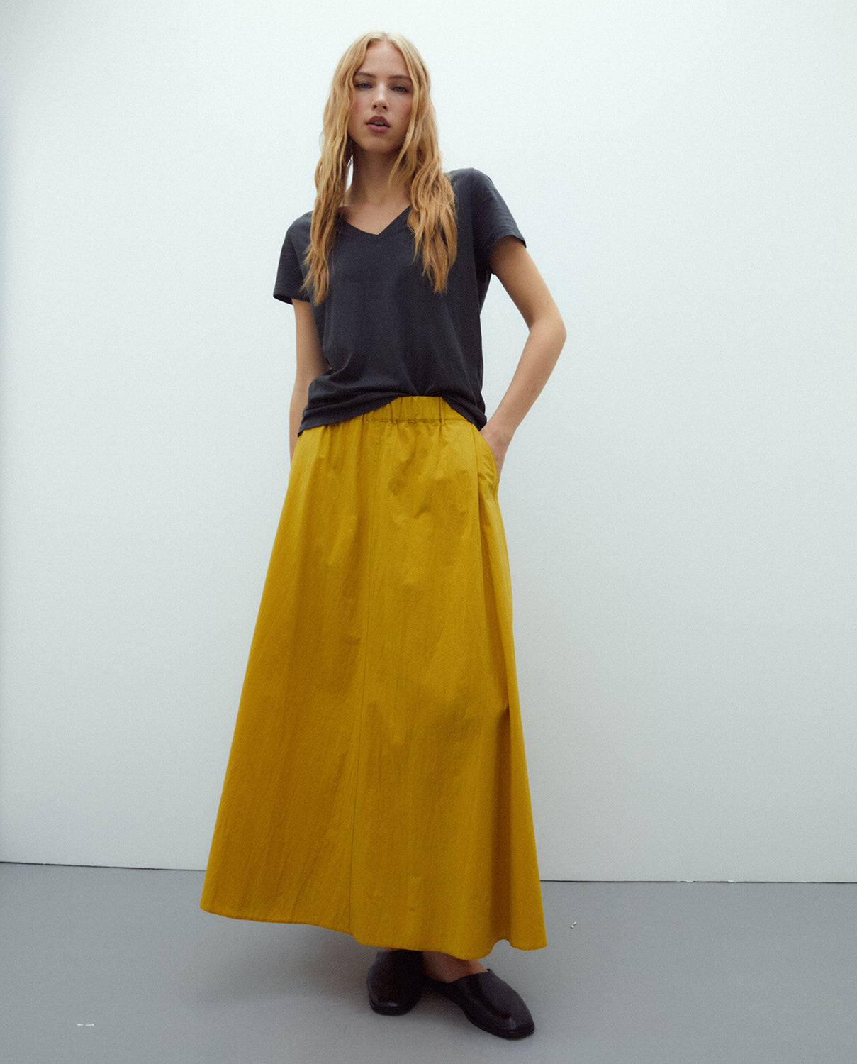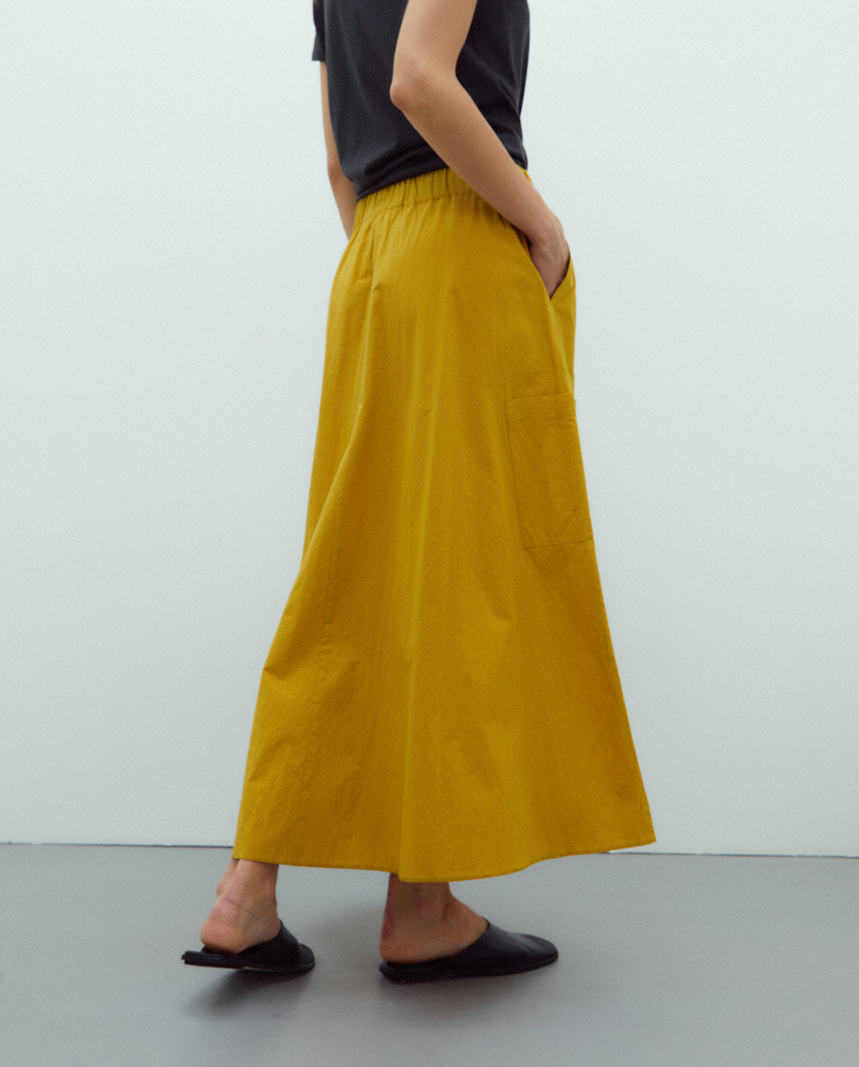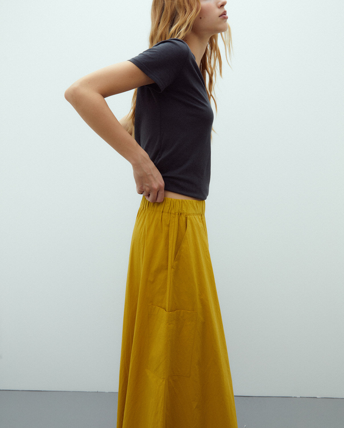 Falda midi confeccionada en popelin 100% algodón, cintura con goma elástica, bolsillos laterales y un bolsillo tipo cargo en lateral derecho. Un falda en total tendencia. Regular fit.
