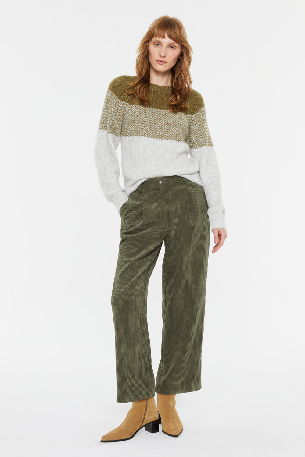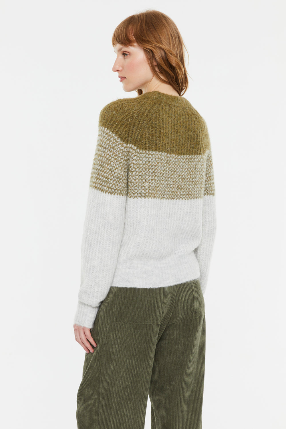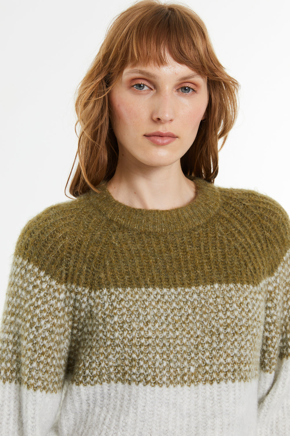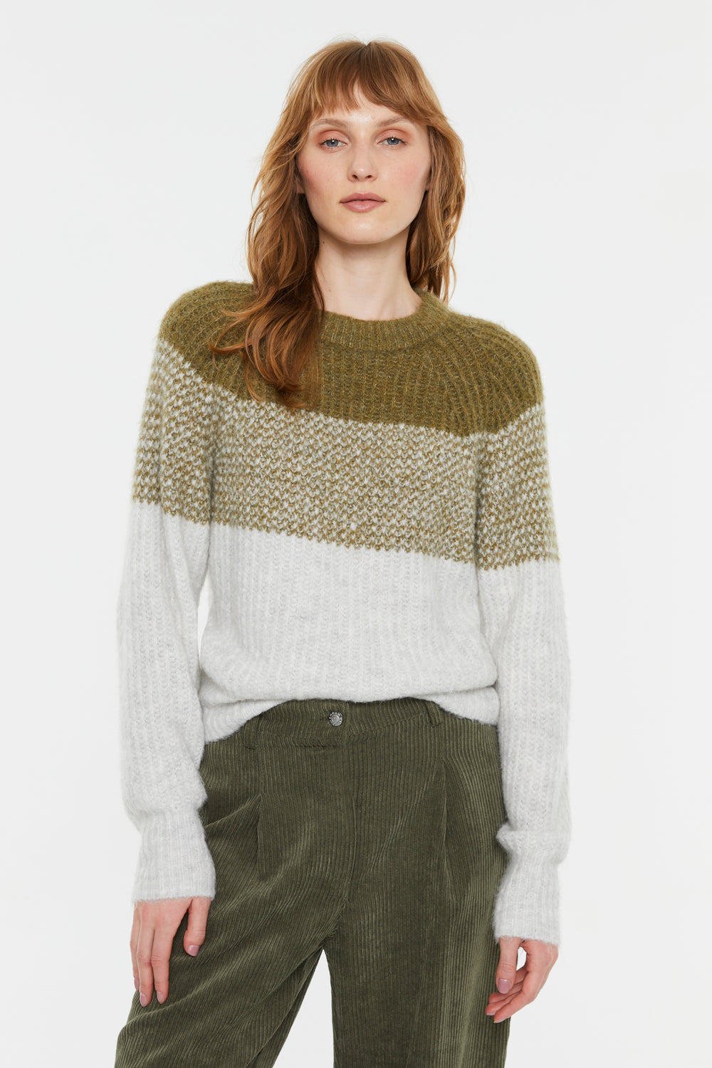 Two-tone sweater with a round neckline and raglan sleeves. Ribbed construction on the neckline, cuffs, and hem. Regular fit.