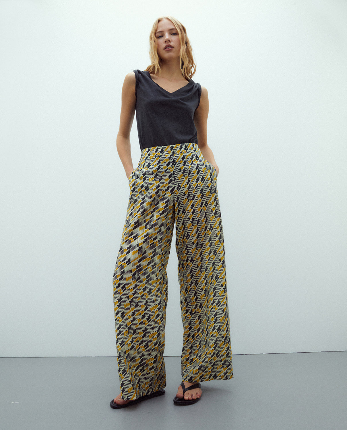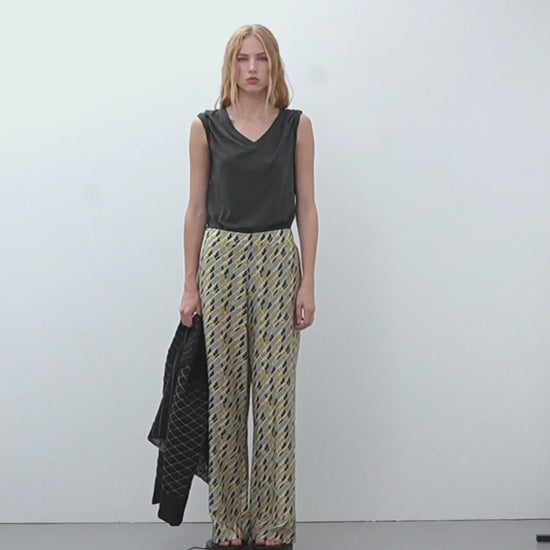 Pantalón ancho estampado geométrico de tiro alto. Goma elástica en trasero y bolsillos laterales. Es un pantalón muy confortable y favorecedor.