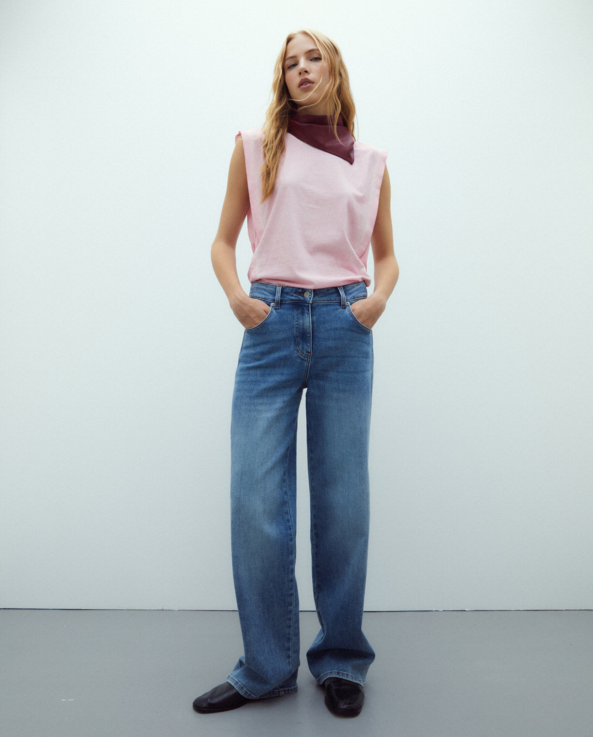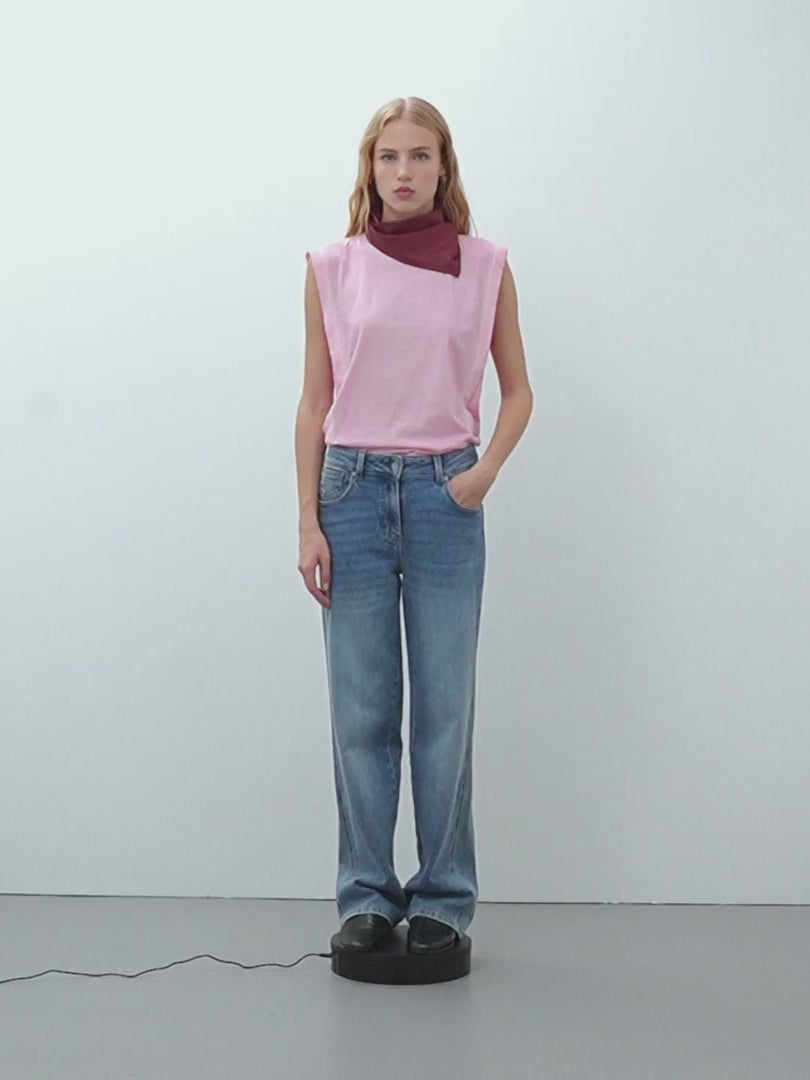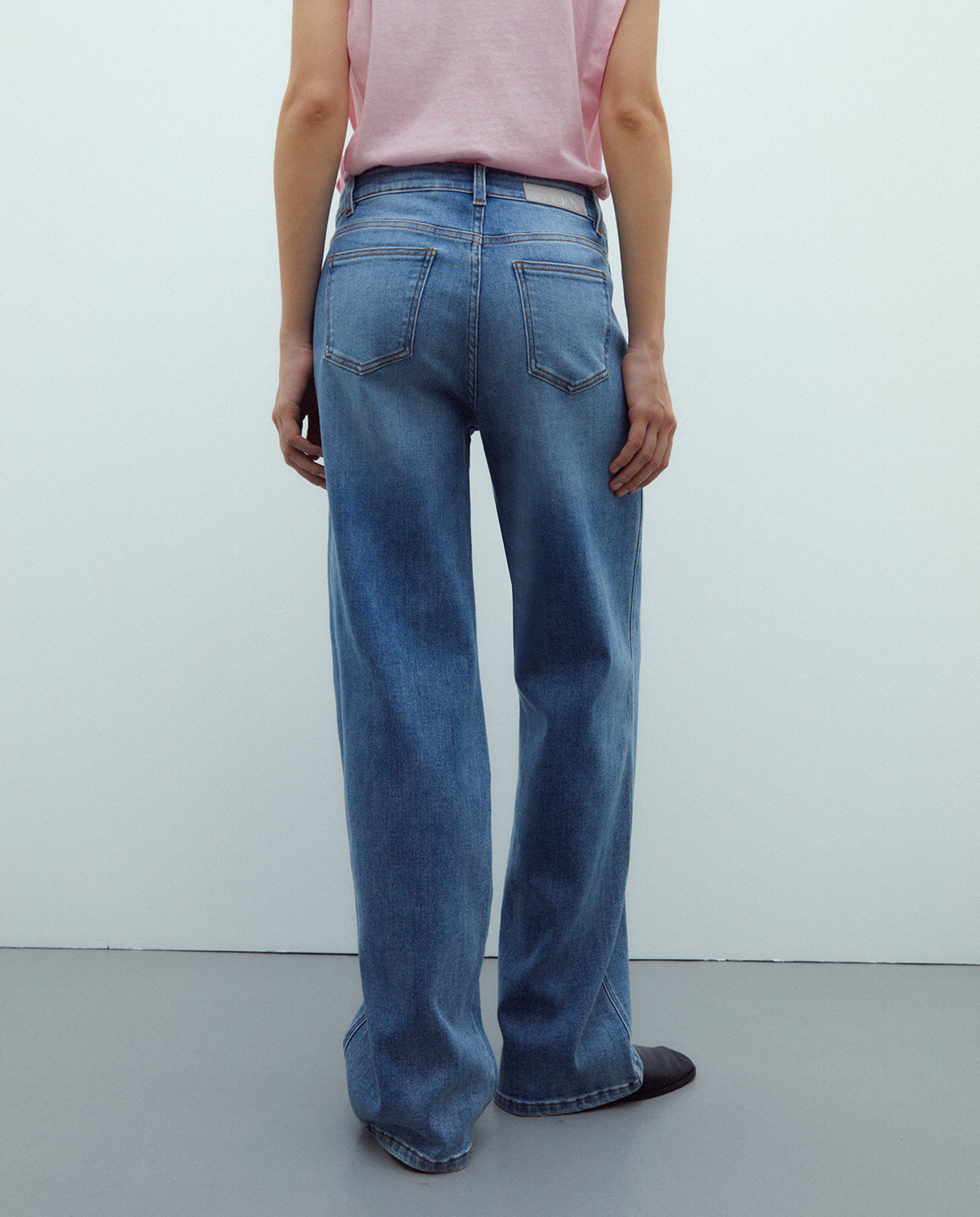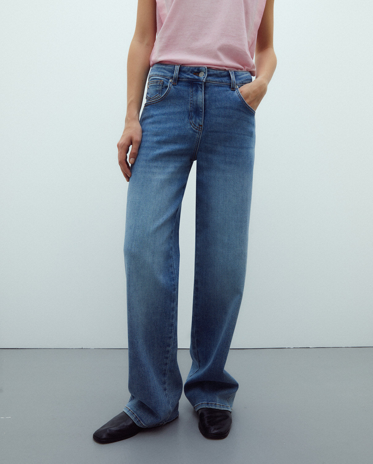 Vaquero ancho cinco bolsillos, cierre con botón metalizado y cremallera. Es un vaquero cómodo, elástico y favorecedor que realza tu figura.