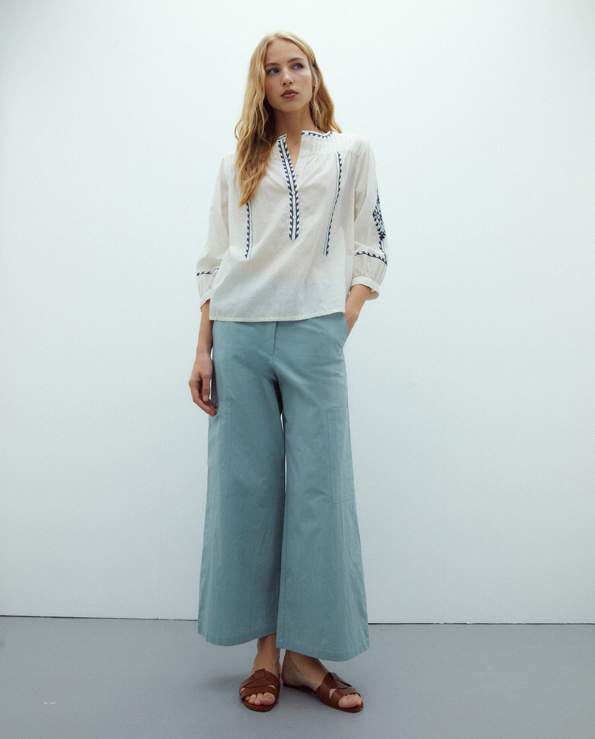 Blusa confeccionada en un voile de algodón, cuello redondo y manga francesa. Detalle de bordados con hilo contrastado en marino y en verde agua. Canesú delantero adornado con pequeñas lorzas. Regular fit.