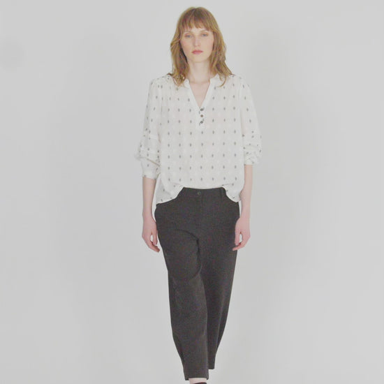 Blusa de mujer con pequeño bordado, cuello mao en forma de pico y manga larga. Detalle de lorzas en mangas y pieza hombro. Cierre frontal con botón y presilla. Regular fit.