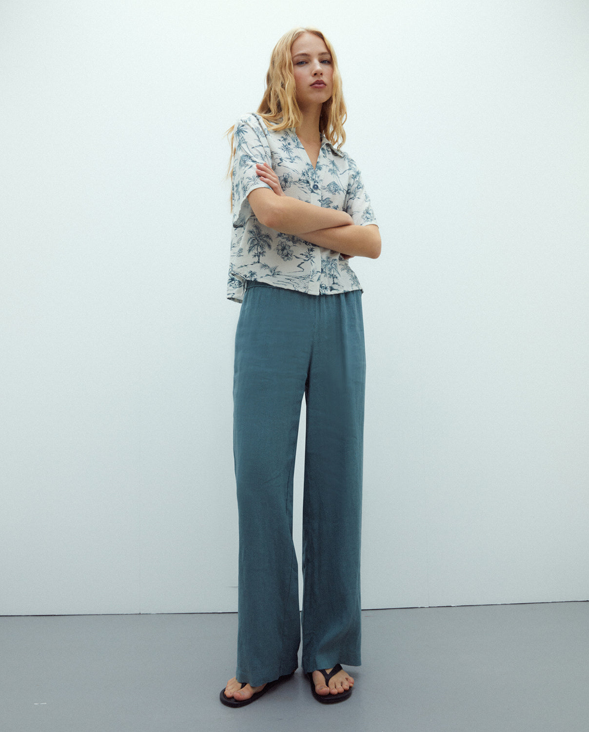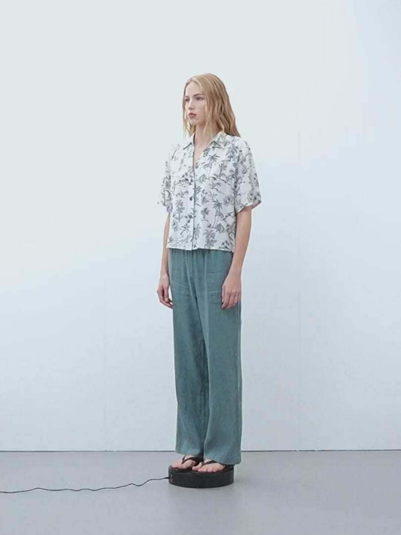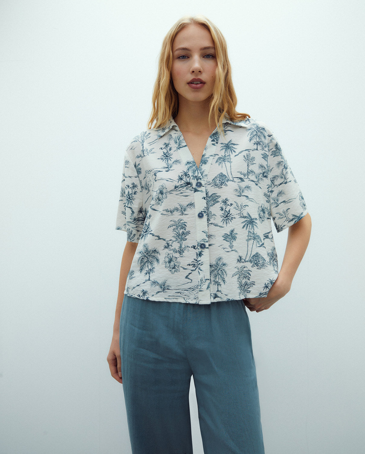 Camisa estampado tropical, con cuello camisero en forma de pico y manga corta. Cierre frontal con botones. Regular fit.