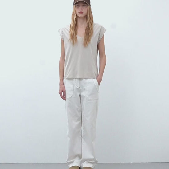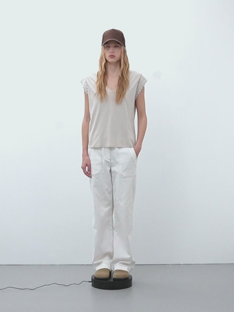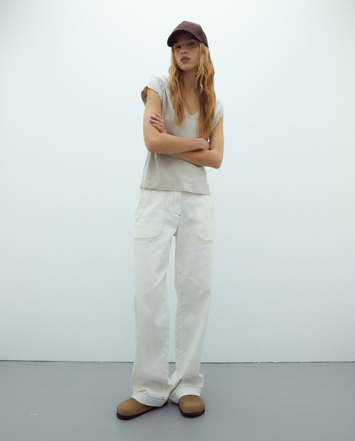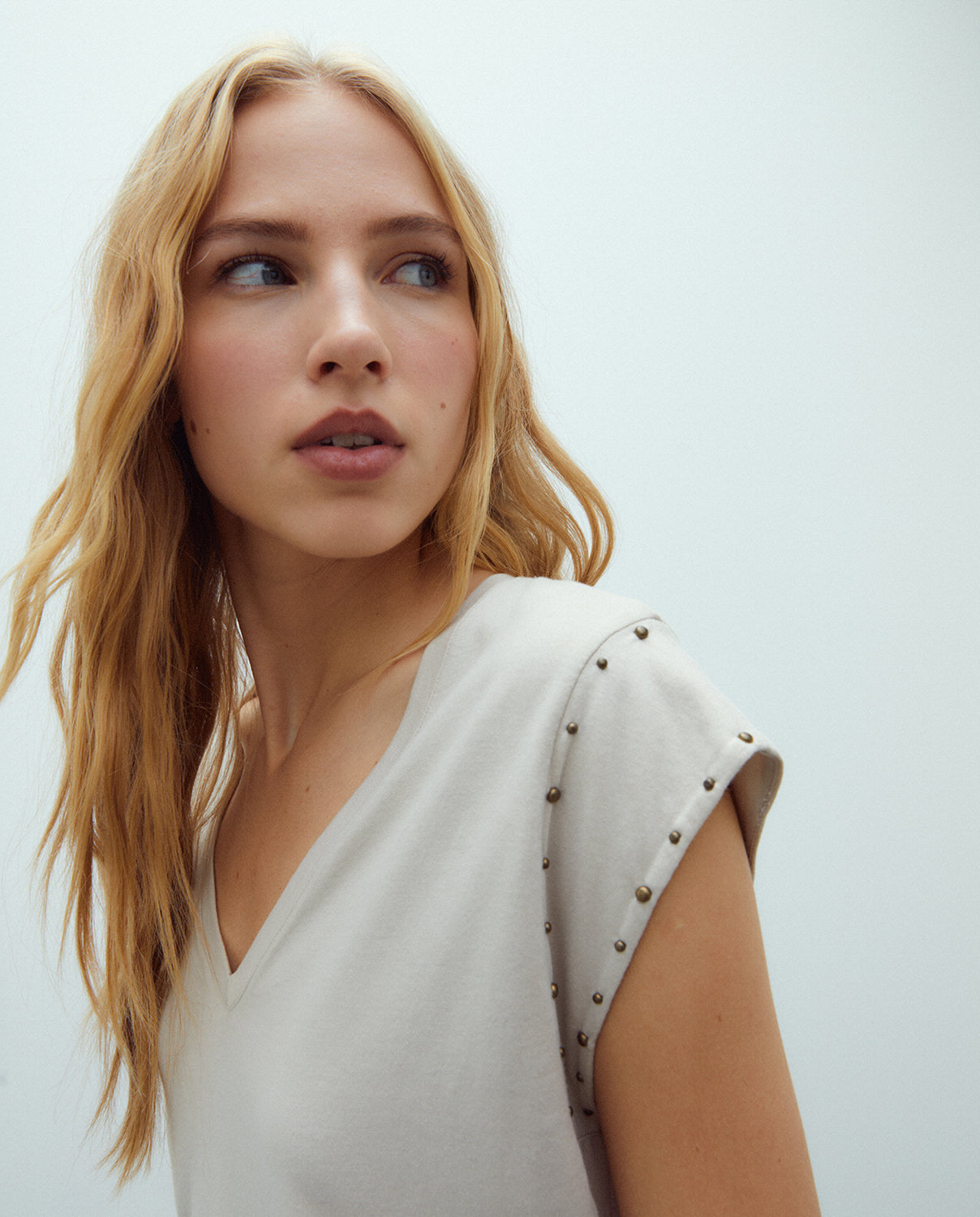Camiseta de cuello pico con aletas efecto manga corta decoradas con tachas metalizada color cobre en todo el contorno. Regular fit.