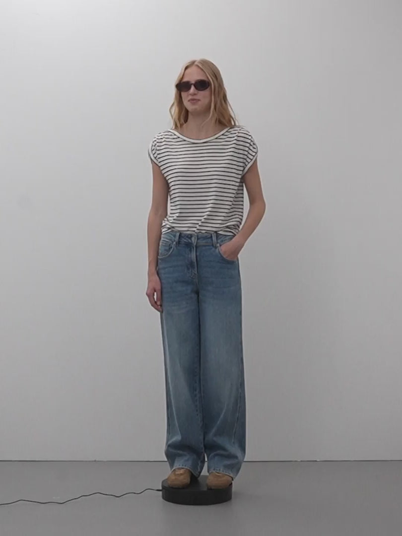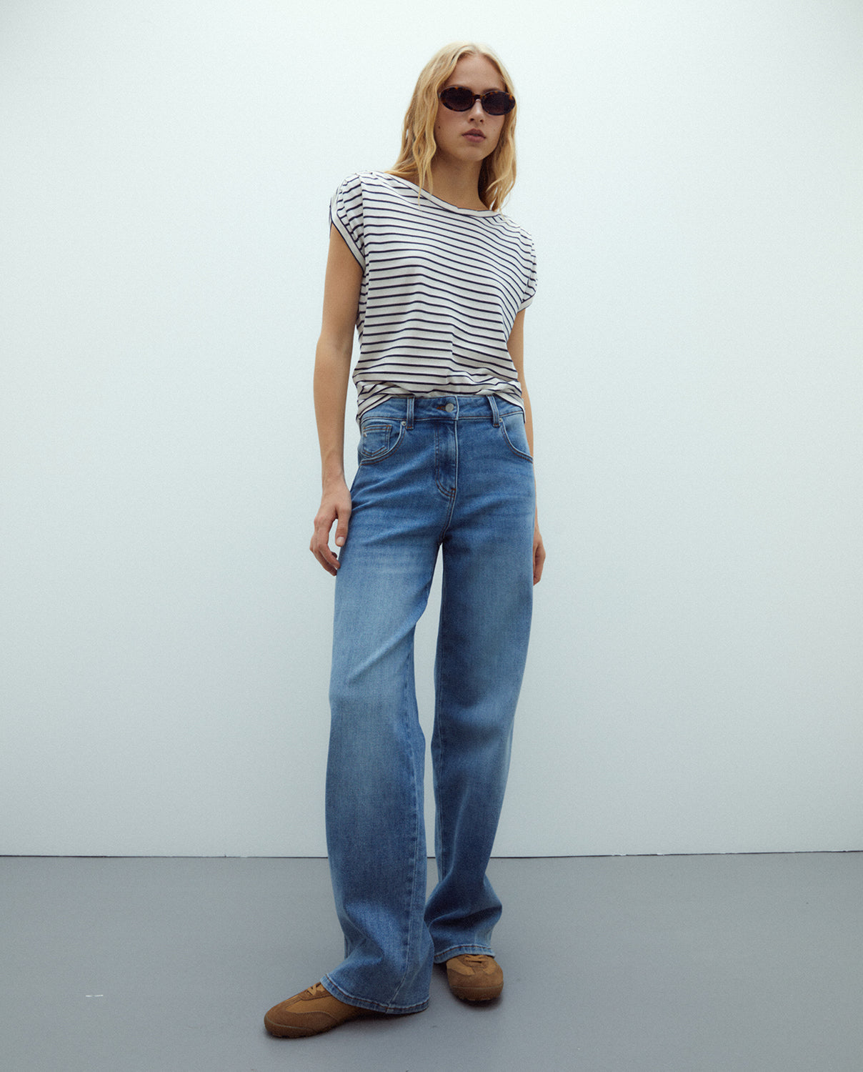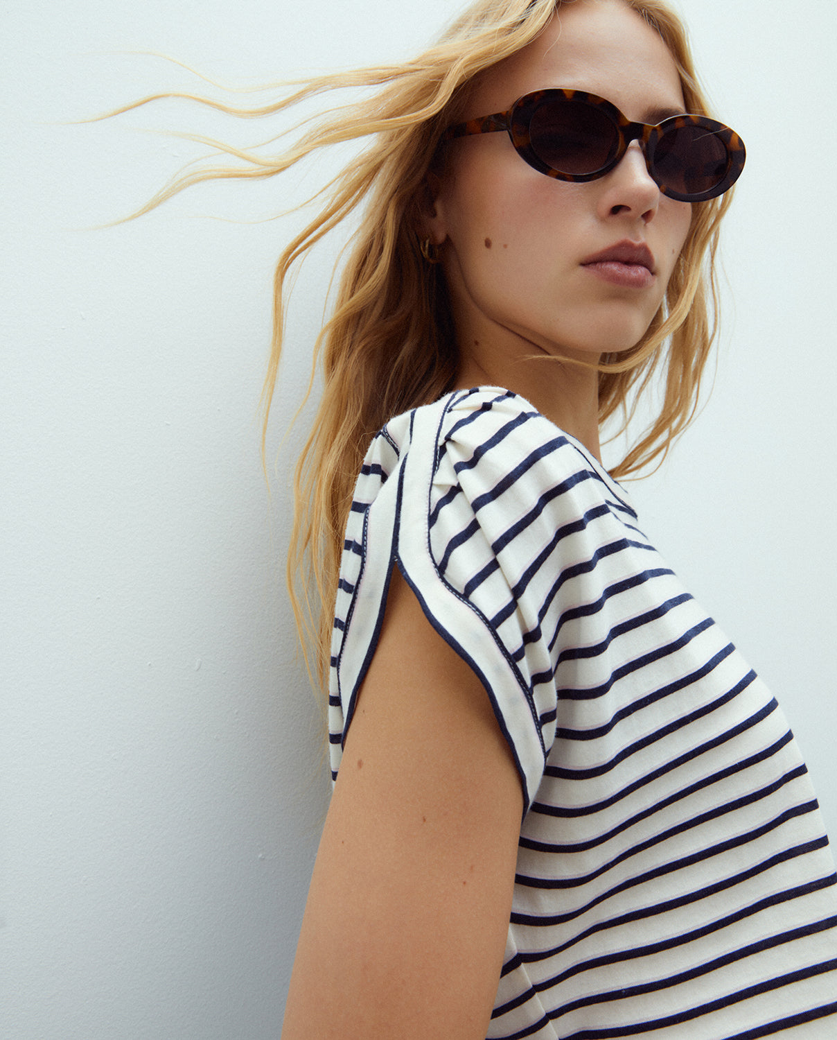 Camiseta estampado rayas de manga caída y escote barco. Regular fit.