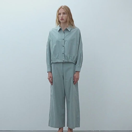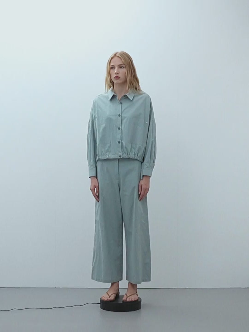 Chaqueta corta confeccionada en tejido popelin. Manga larga y cuello camisero.Tiras ajustables en el bajo y detallle de pliegue en la manga. Cierre frontal con botones y puños con un botón. Bolsillos plastón con abertura lateral. Fit oversize.