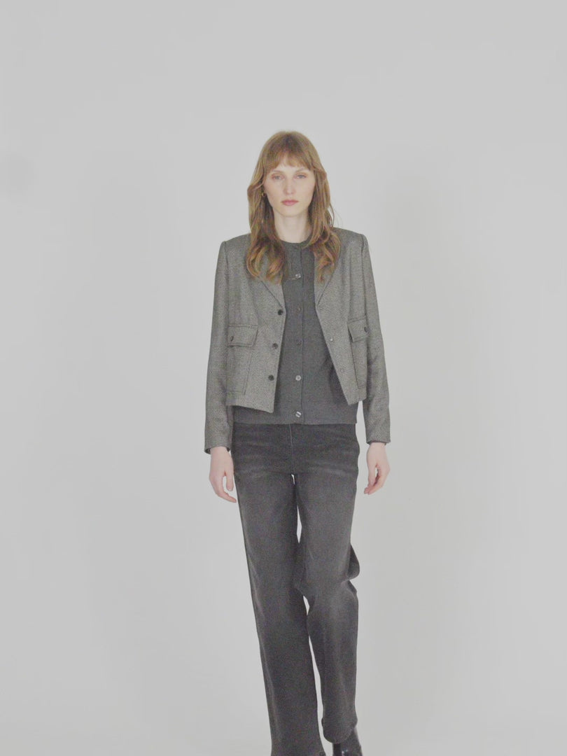 Chaqueta corta estampado espiga, manga larga y cuello solapa. Cierre frontal con botones metálicos a presión. Bolsillos plastrón con tapeta y botón metálico. Puedes encontrar su pantalón a conjunto. Regular fit.