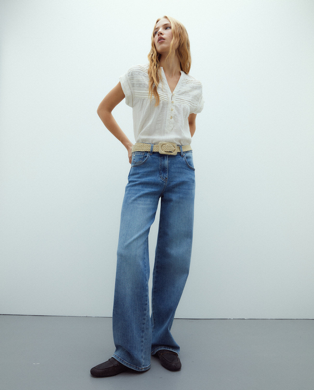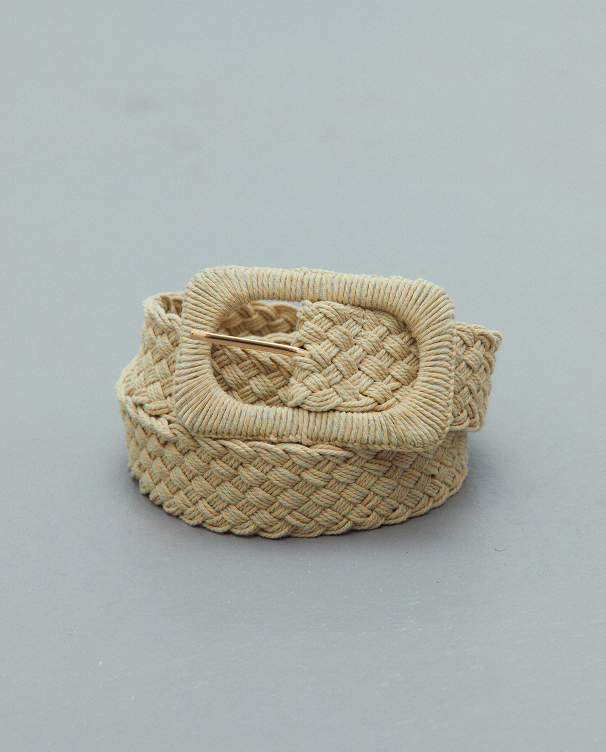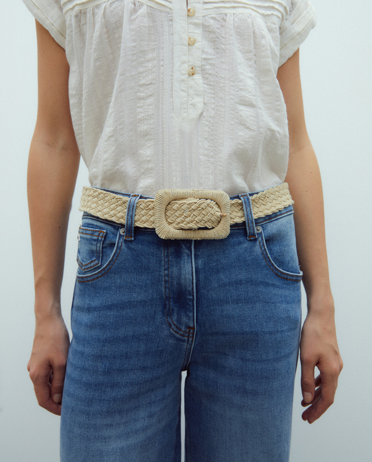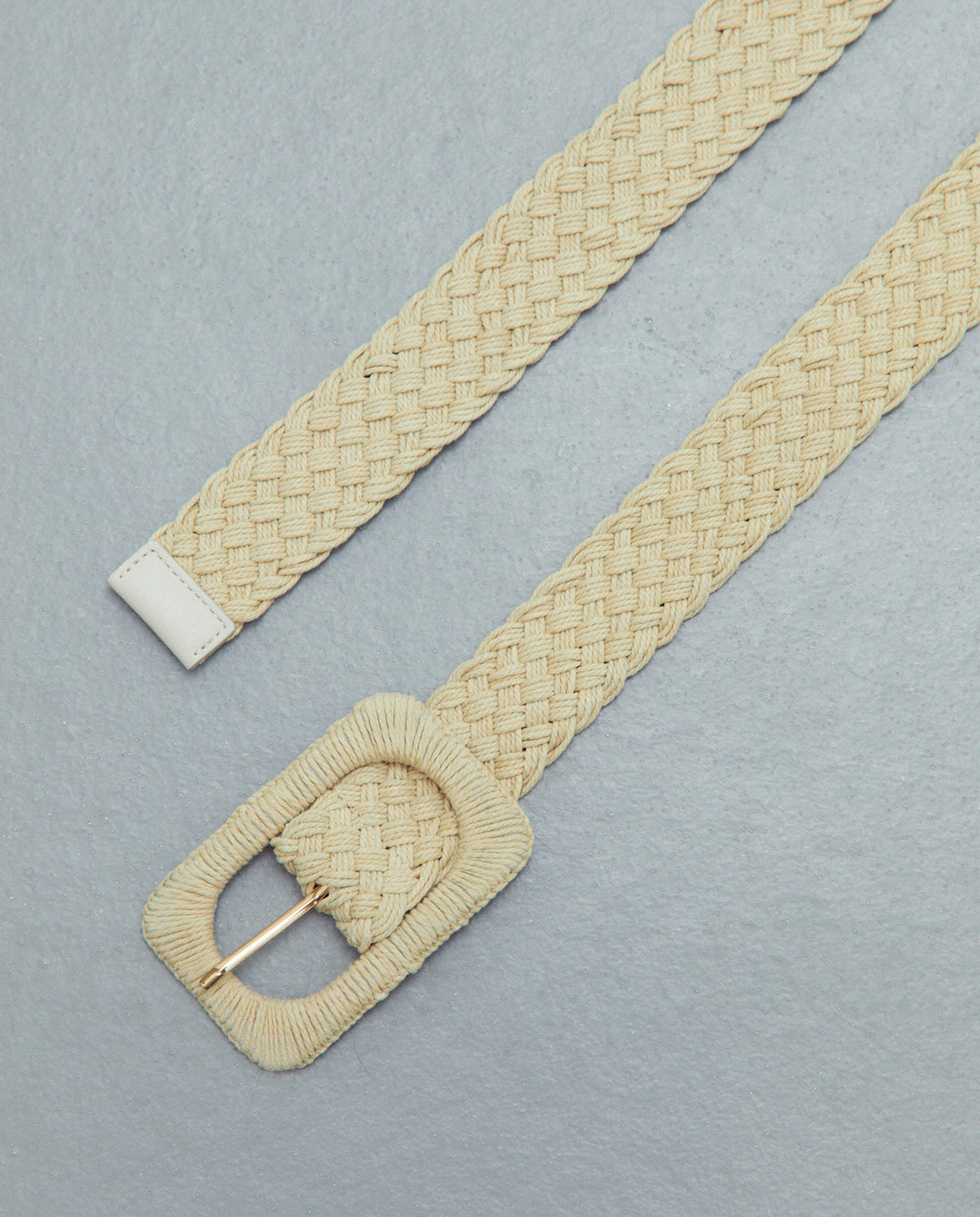 Cinturón trenzado hebilla cuadrada.