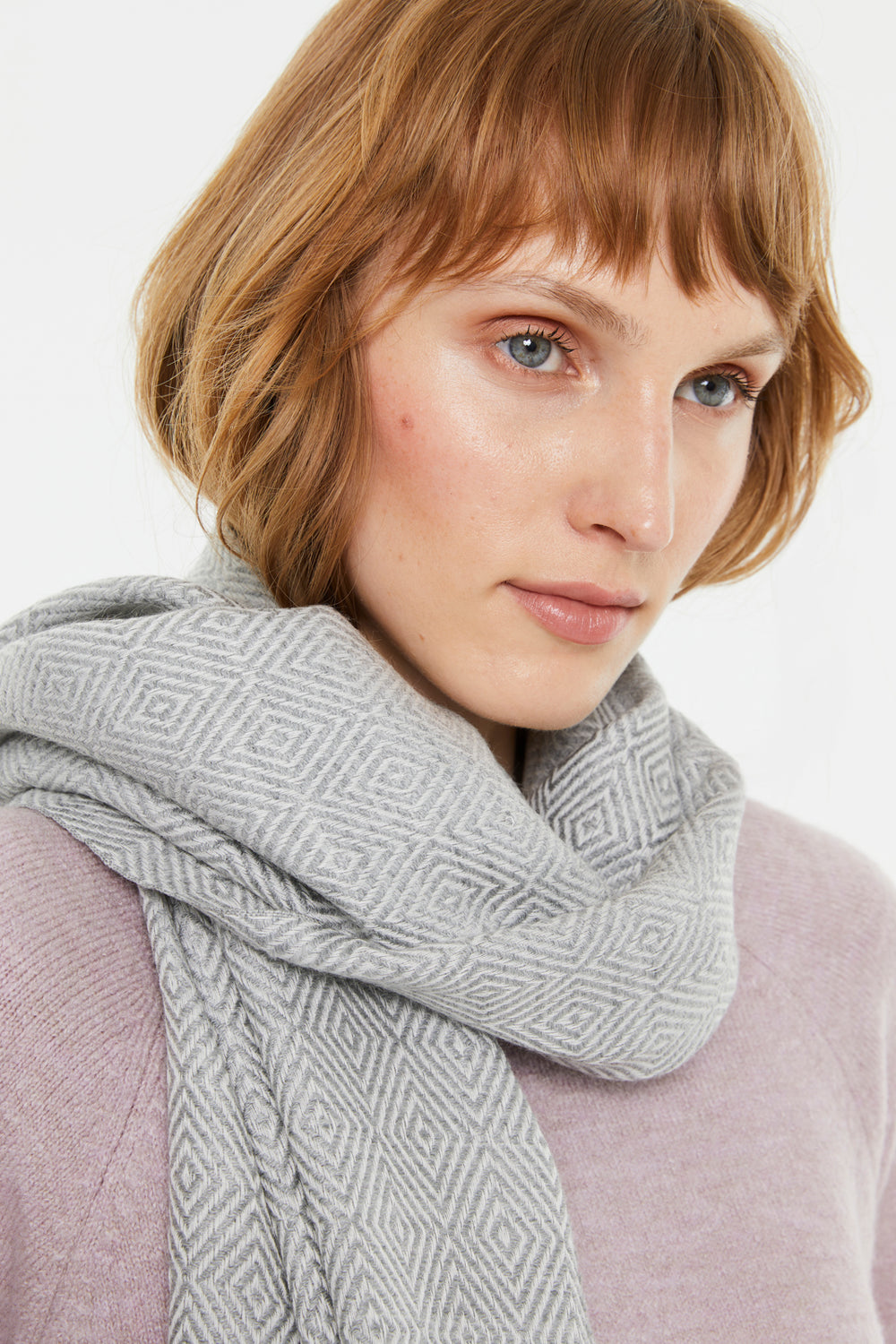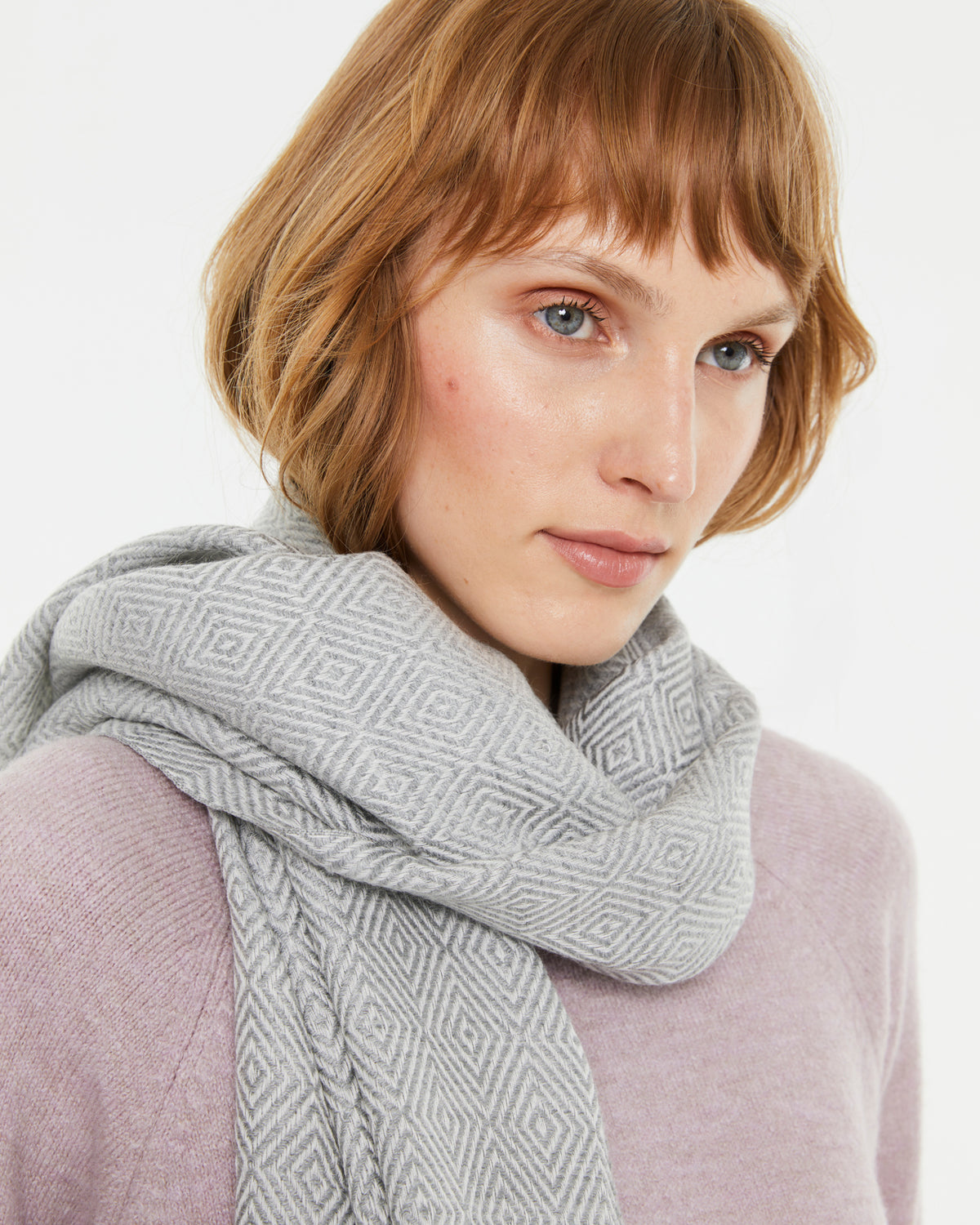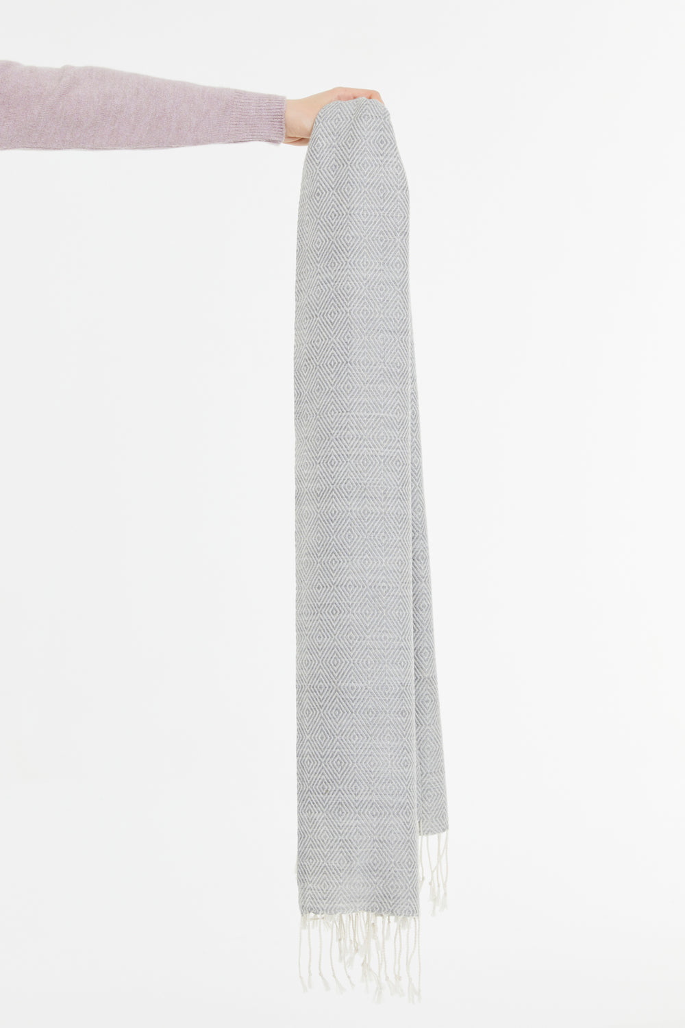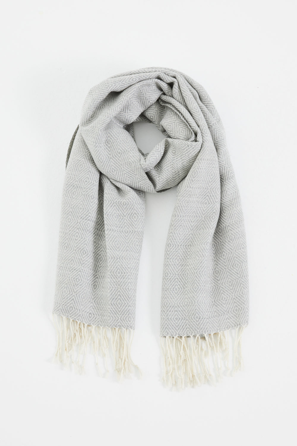 Fulard de jaquard con forma geométrica y acabado bajos con flecos.