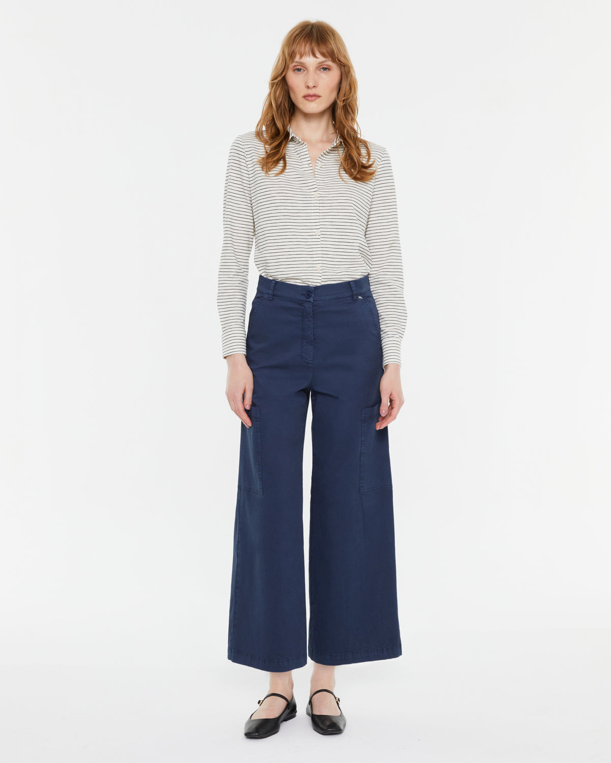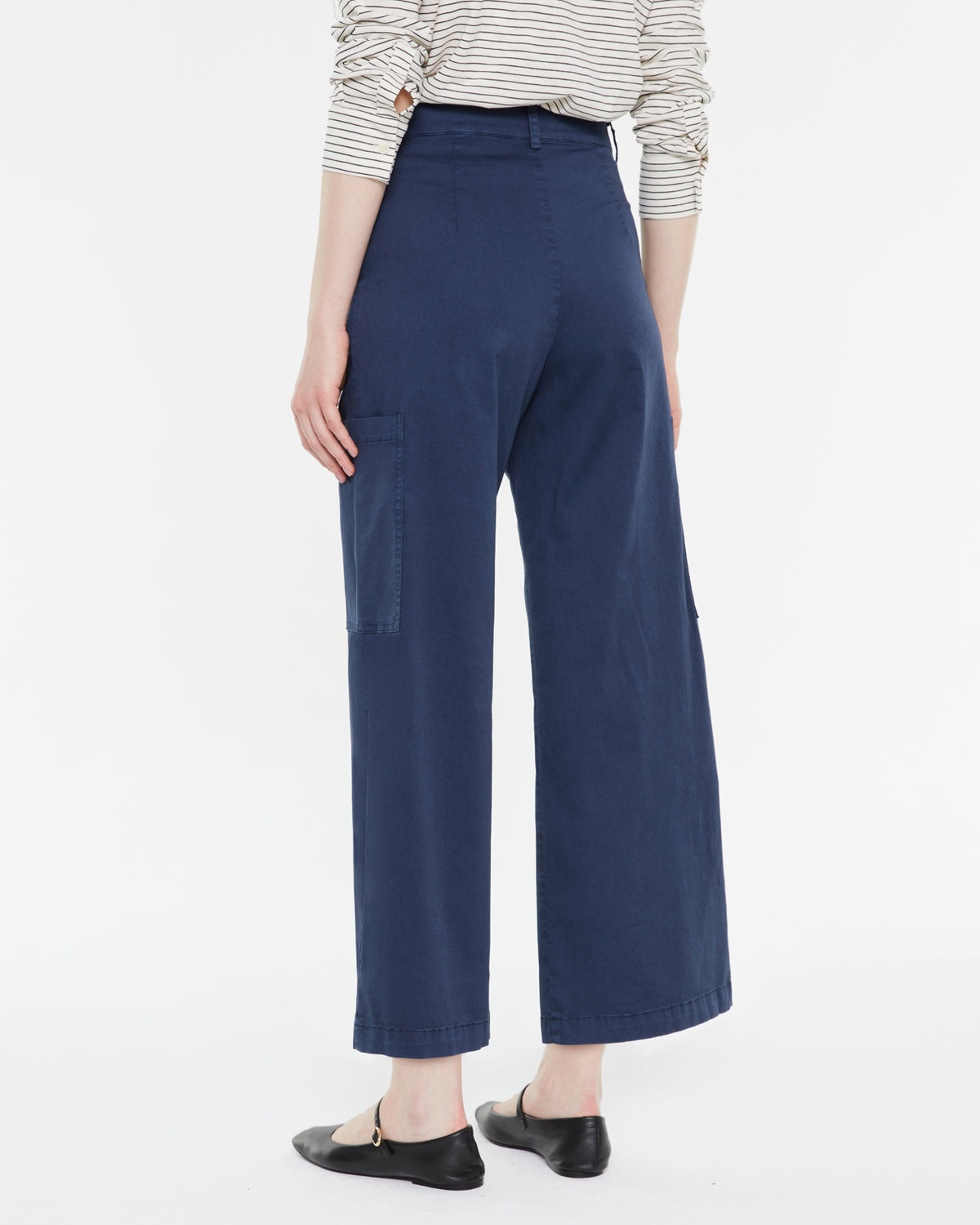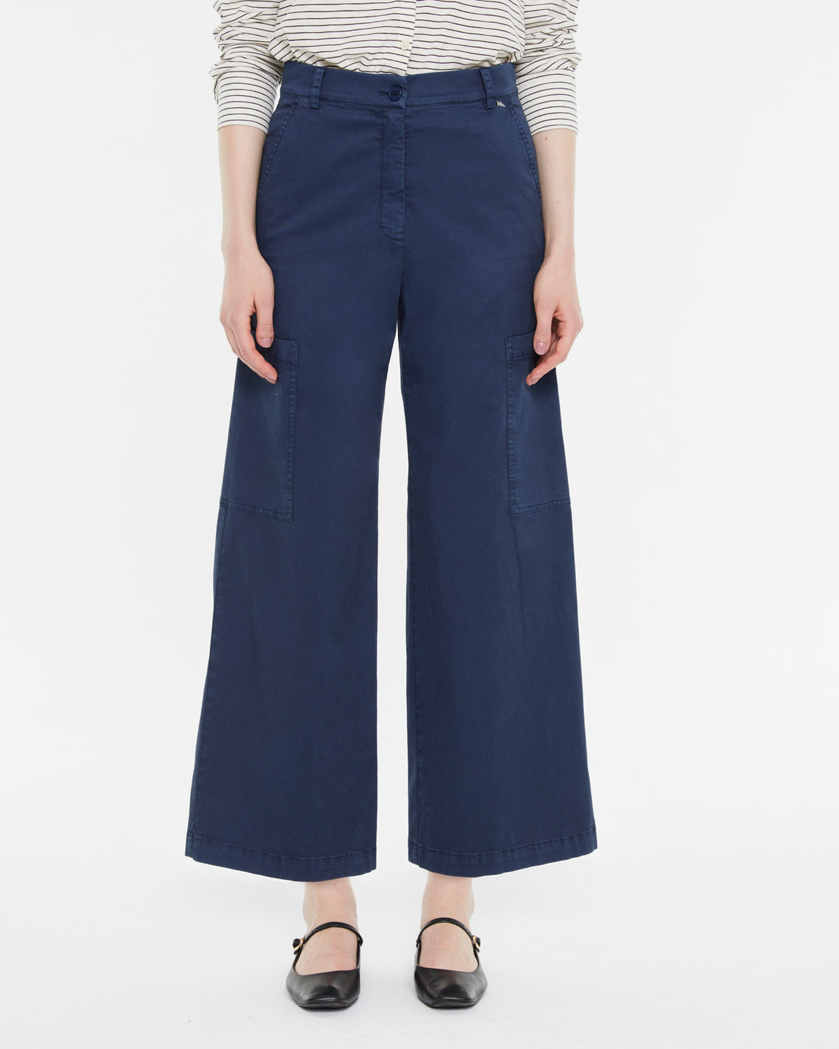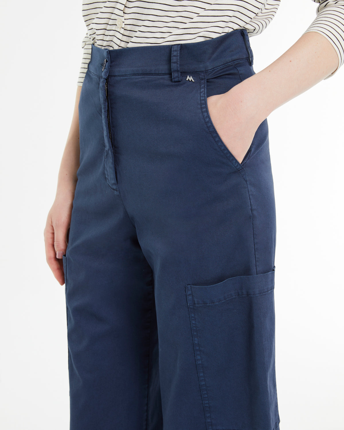 Pantalón cropped tipo cargo de tiro alto y bolsillo laterales. Cierre con botón y cremallera.